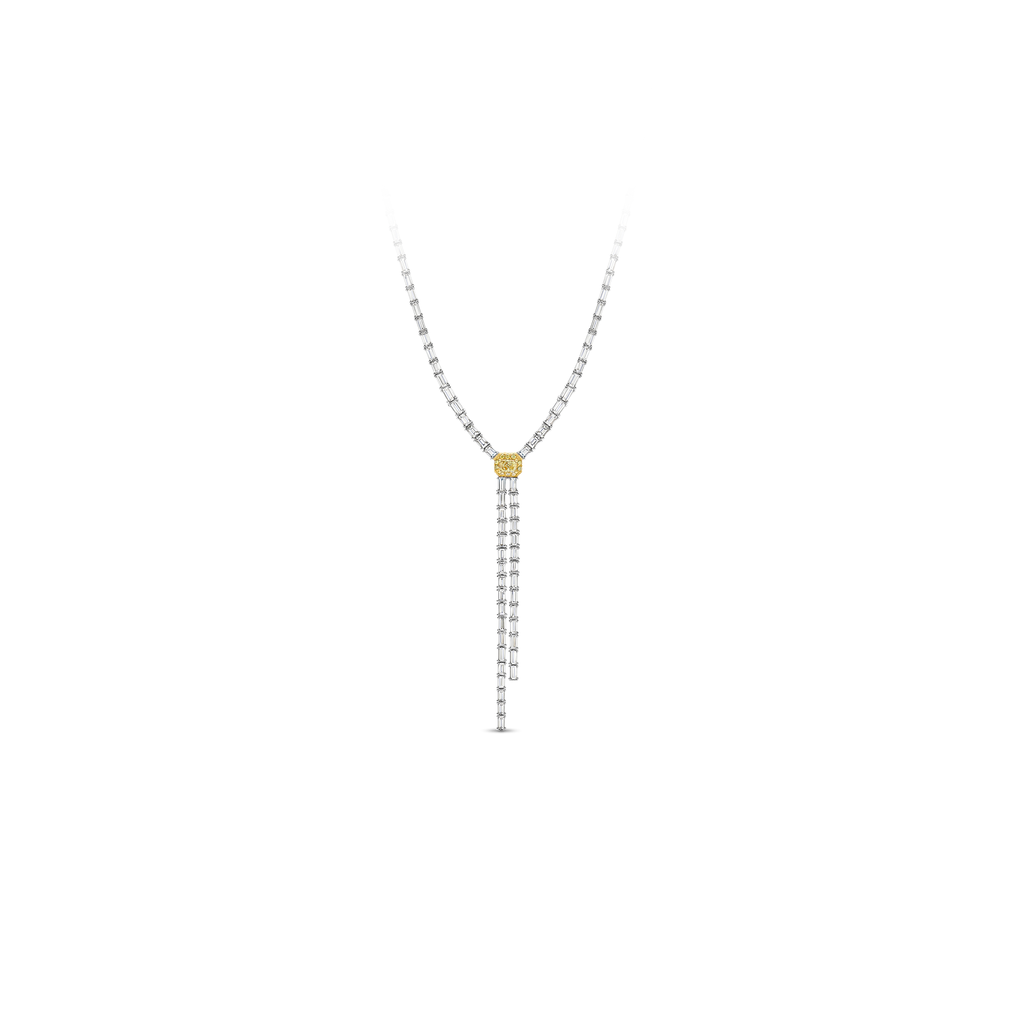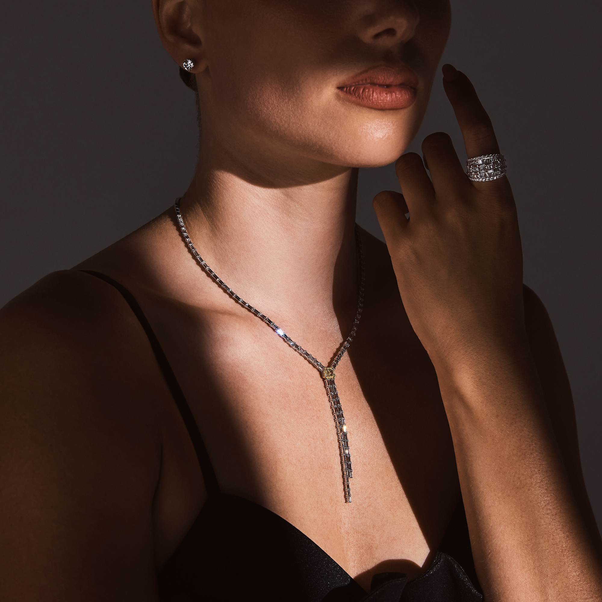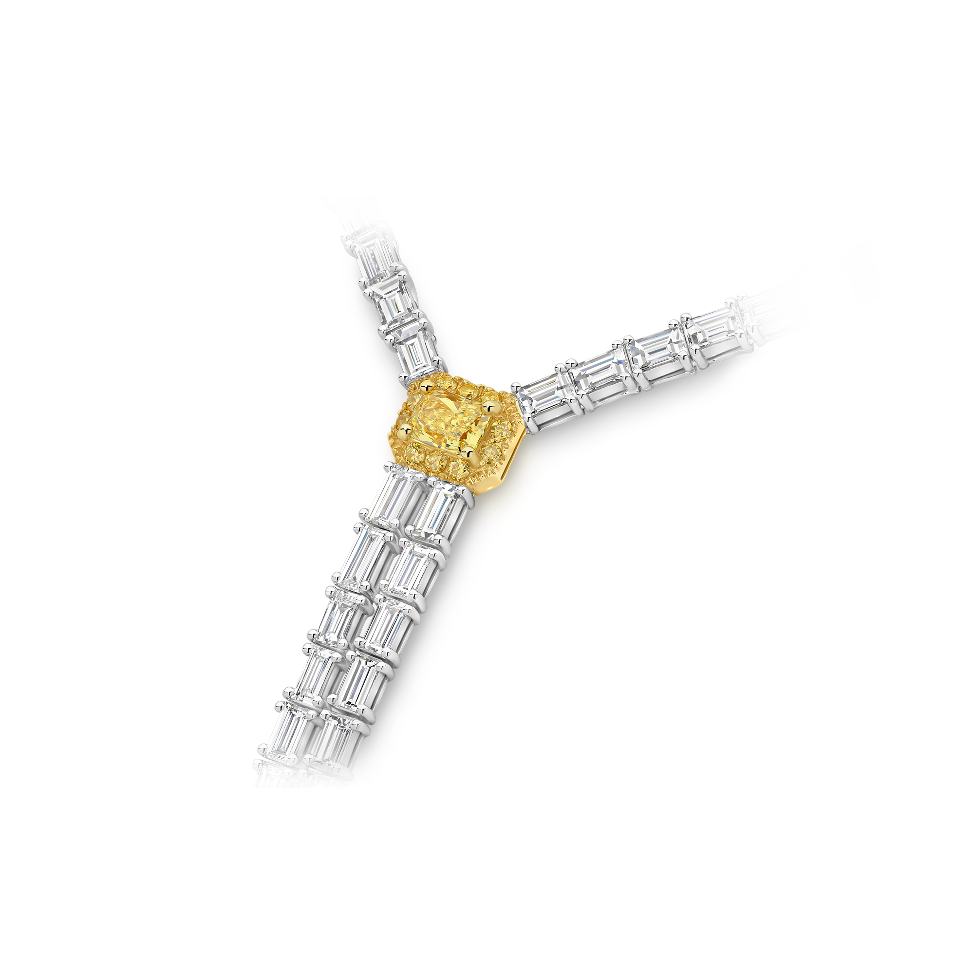 Crafted in high-polish 18K white gold, the necklace features a continuous ribbon of hand-selected baguette diamonds. These stones are set in a sleek, architectural channel, providing a “hall of mirrors” brilliance that leads the eye toward the dramatic Y-drop. Suspended at the point of convergence lies a vibrant yellow diamond, the namesake of the piece. It is meticulously encased in a bespoke 18K yellow gold setting. This deliberate choice of metal creates a seamless “golden” aura, intensifying the stone’s natural saturation so it appears to radiate light from within rather than merely reflect it.