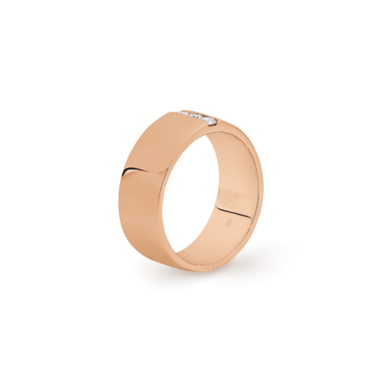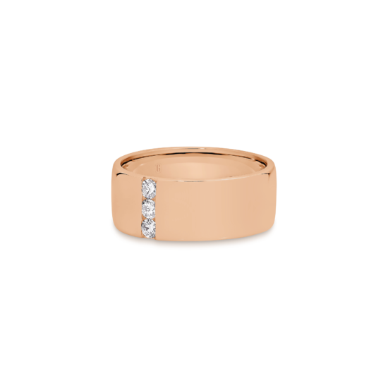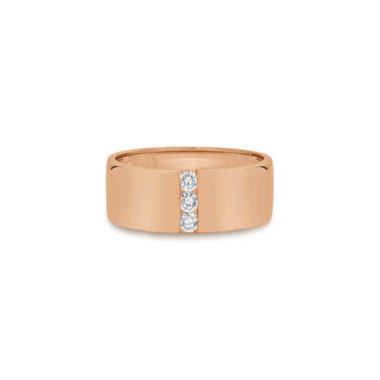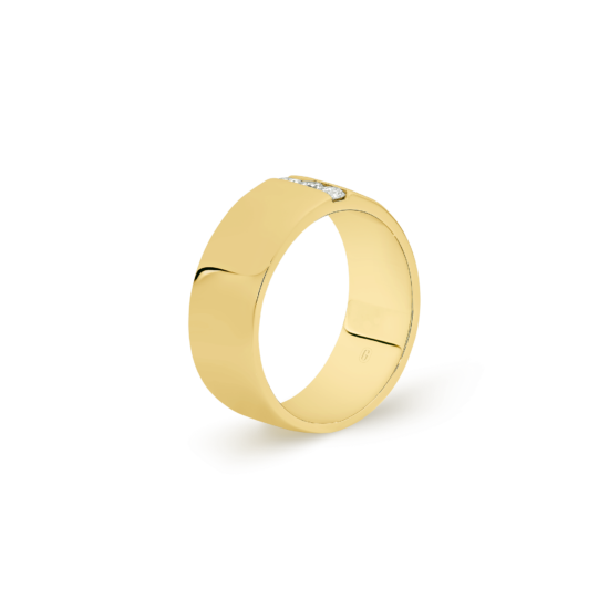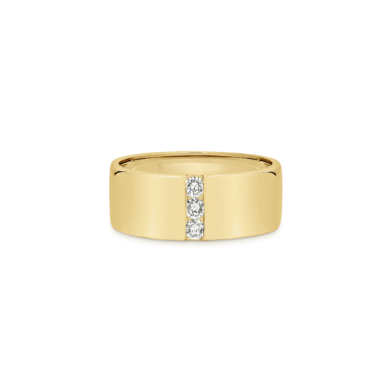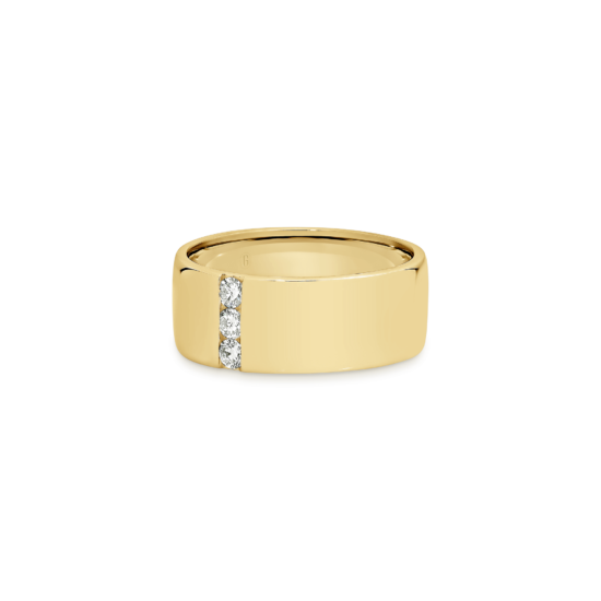 This weighty 18k gold ring that exudes strength, accentuated by a single understated line of three round cut diamonds. Simple and versatile, this fantastic ring can be worn gold, or diamond side up (when the occasion calls for a little bit of sparkle).