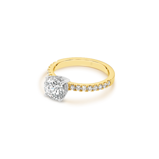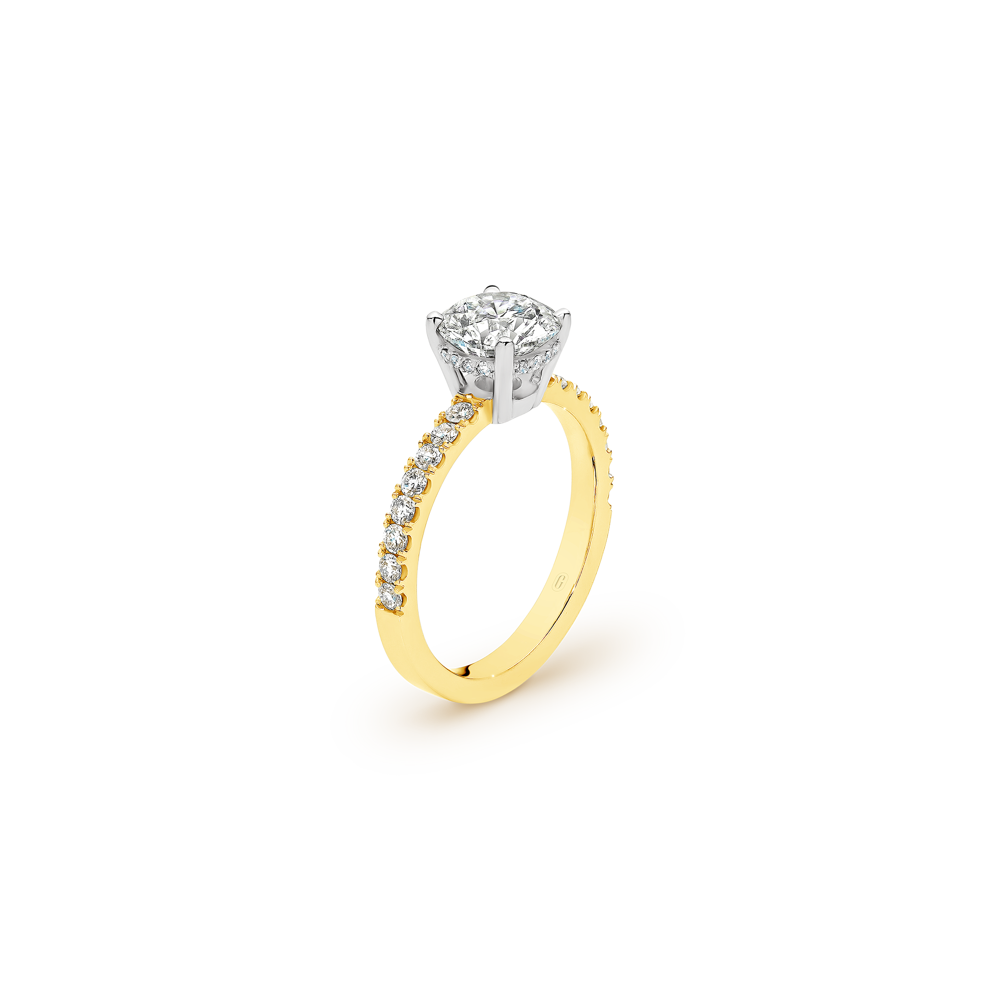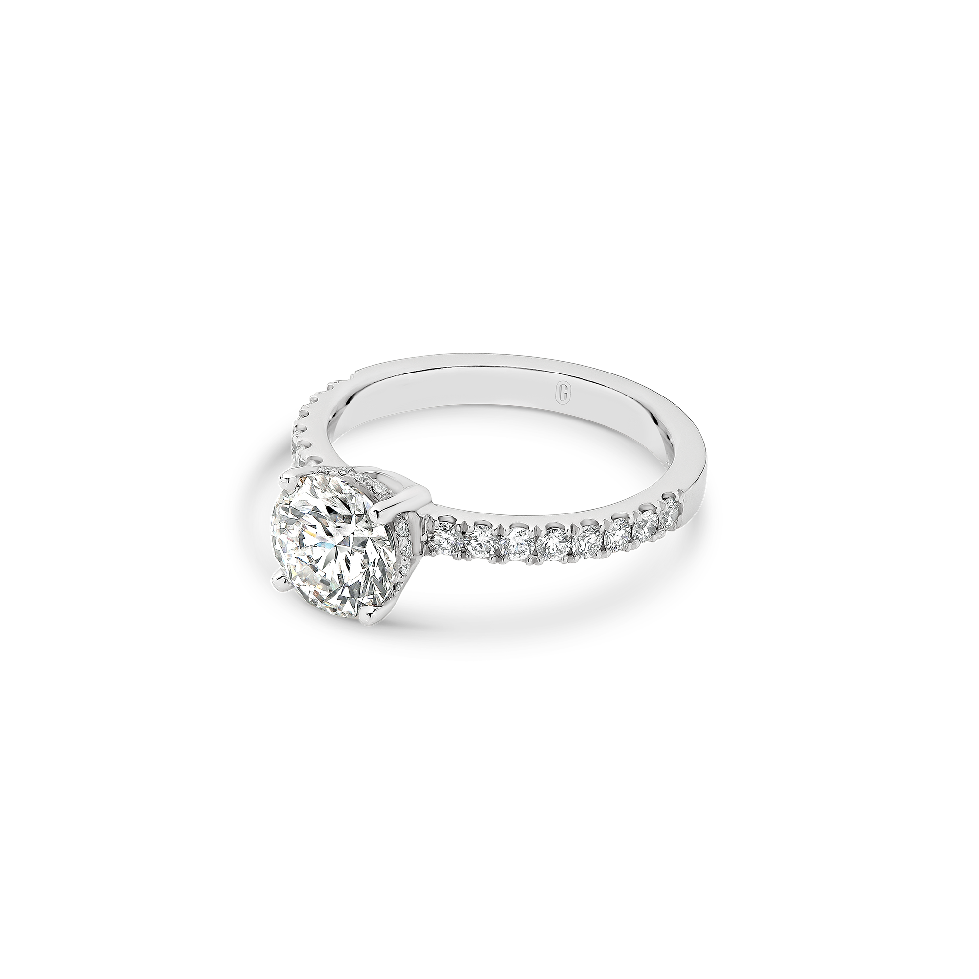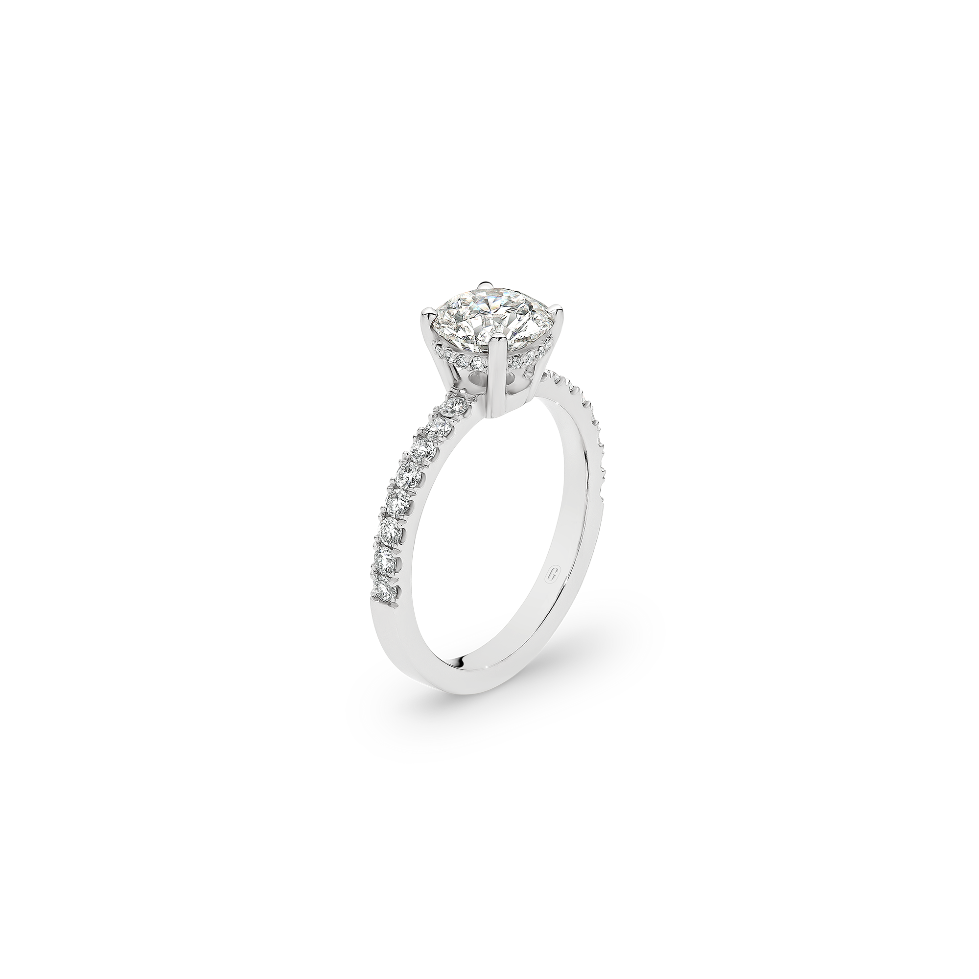 A classic choice for those looking for a high silhouette in their engagement ring. The claw set diamond band is crowned by a brilliant round cut diamond atop a gallery featuring a stunning ‘hidden’ halo. More subtle than a traditional diamond halo setting and a great way to give the centre stone a lift.