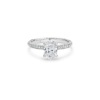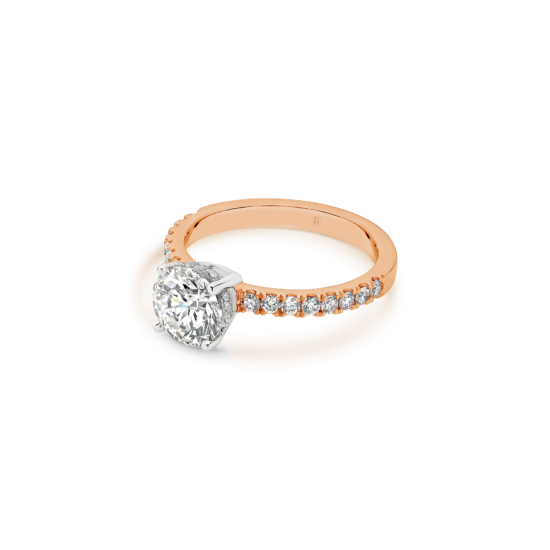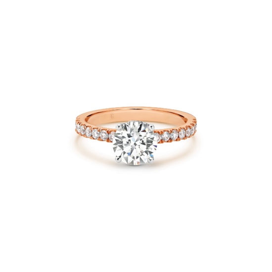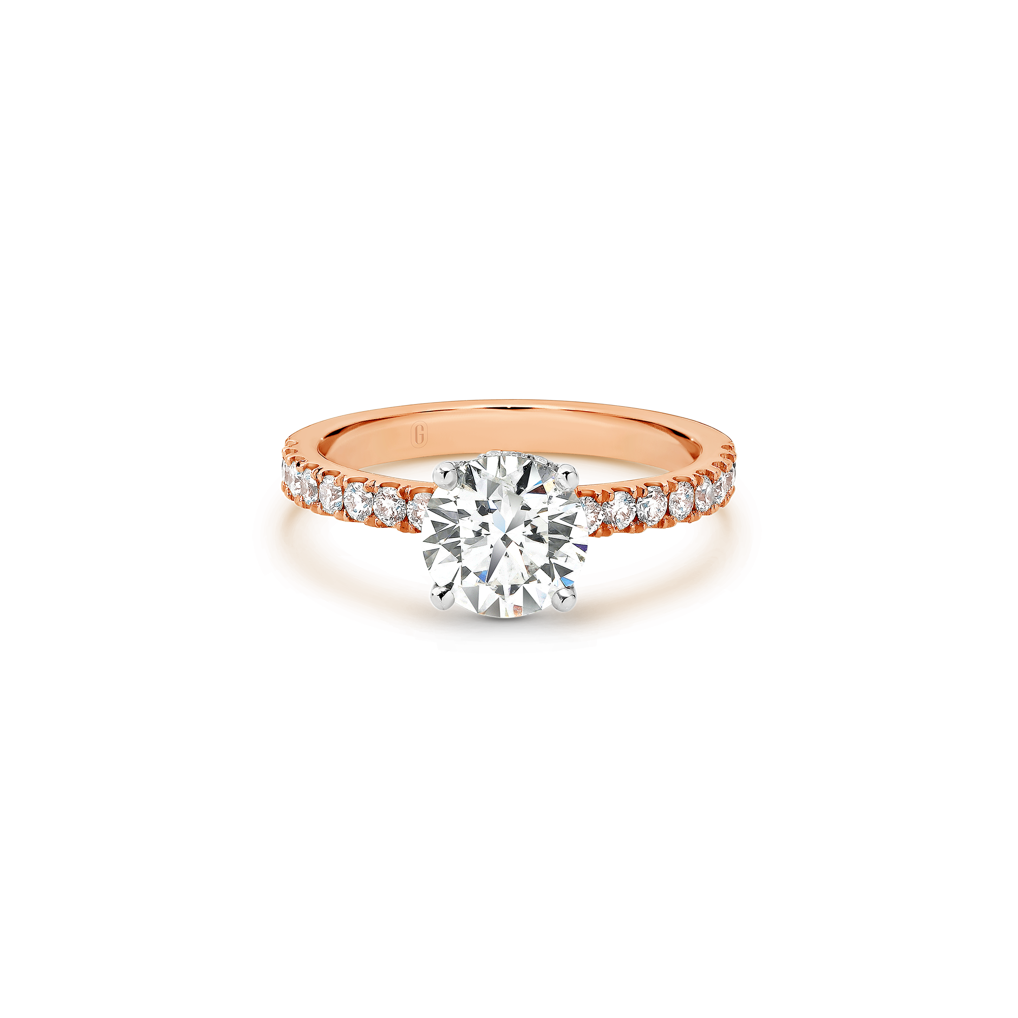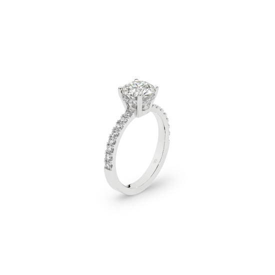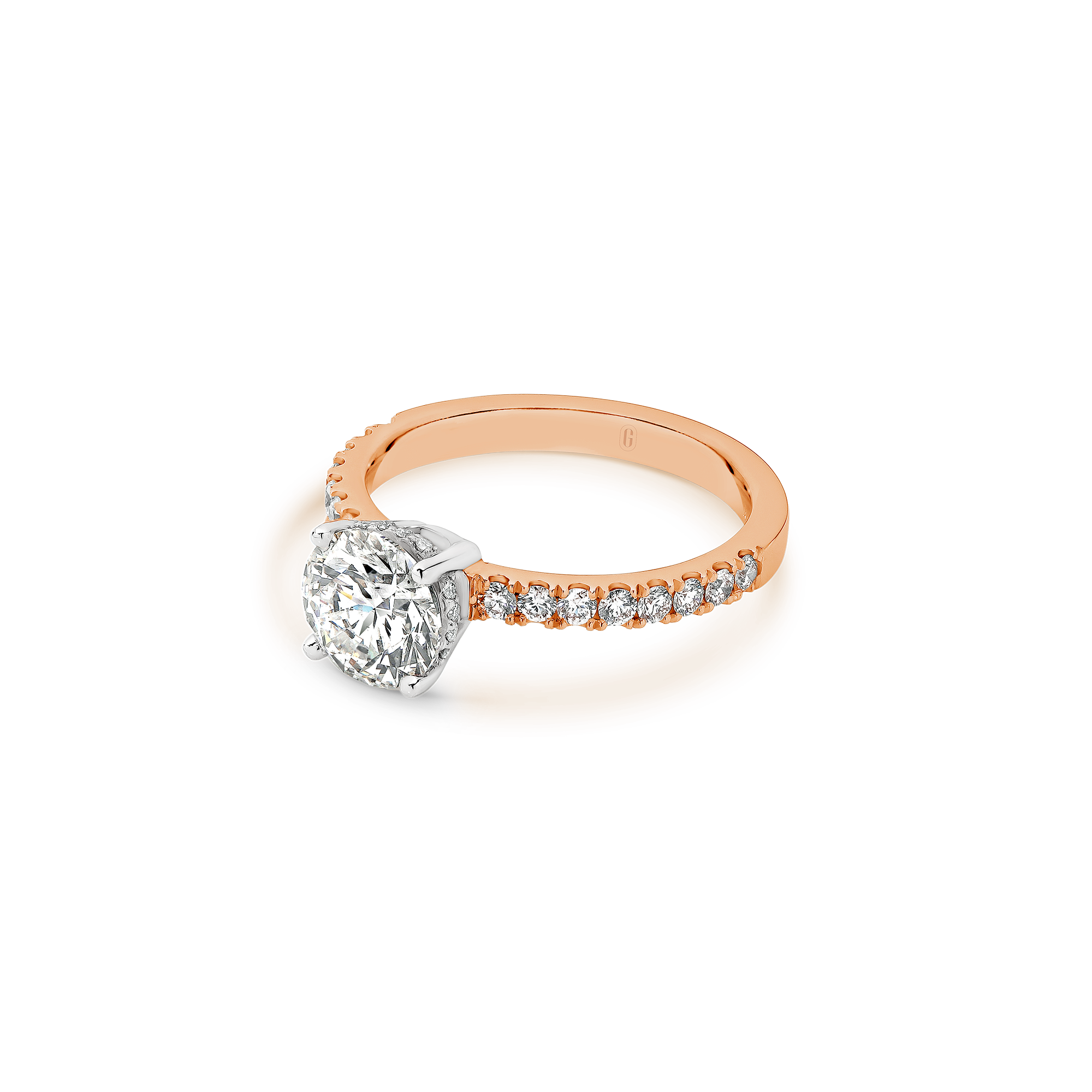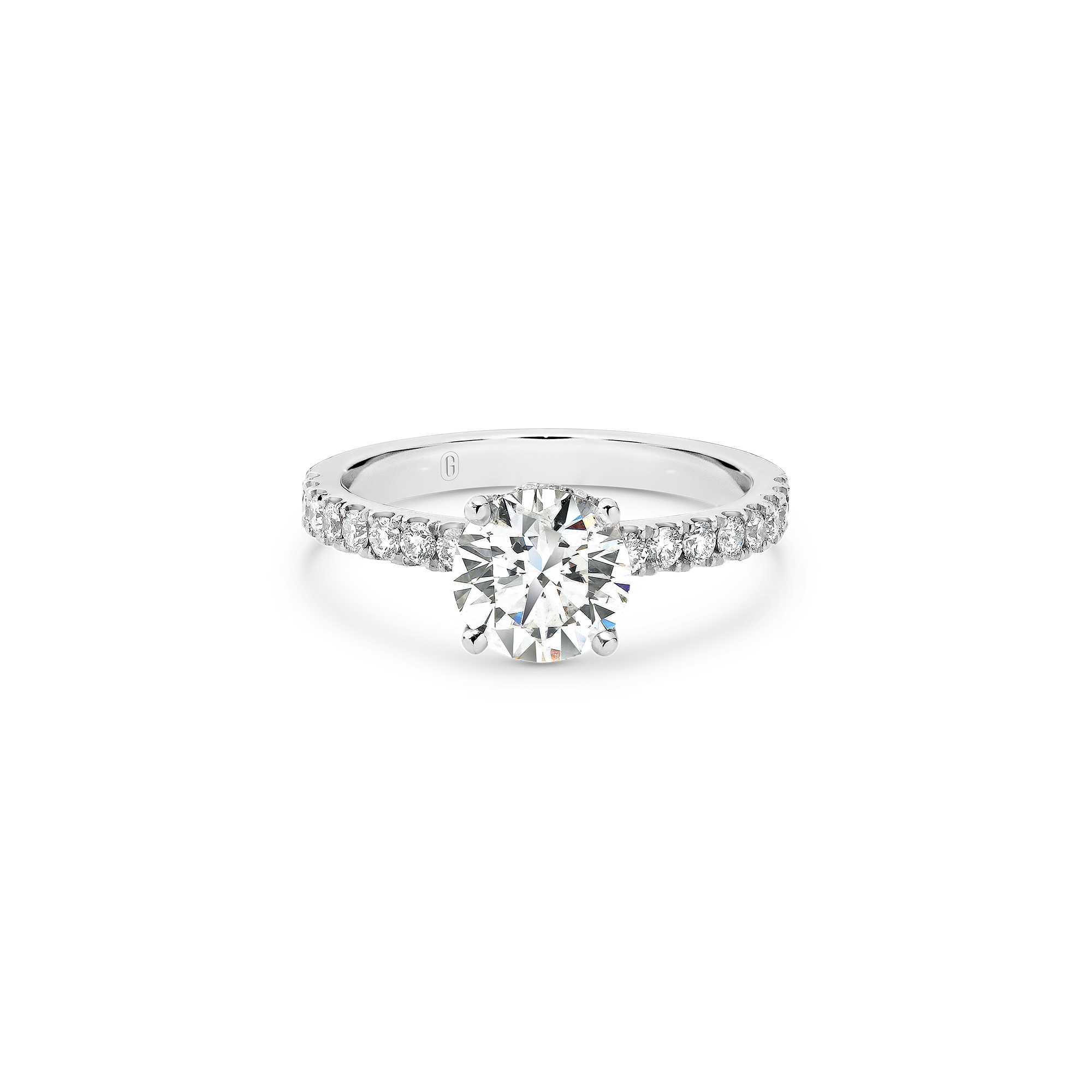 A classic choice for those looking for a high silhouette in their engagement ring. The claw set diamond band is crowned by a brilliant round cut diamond atop a gallery featuring a stunning ‘hidden’ halo. More subtle than a traditional diamond halo setting and a great way to give the centre stone a lift.