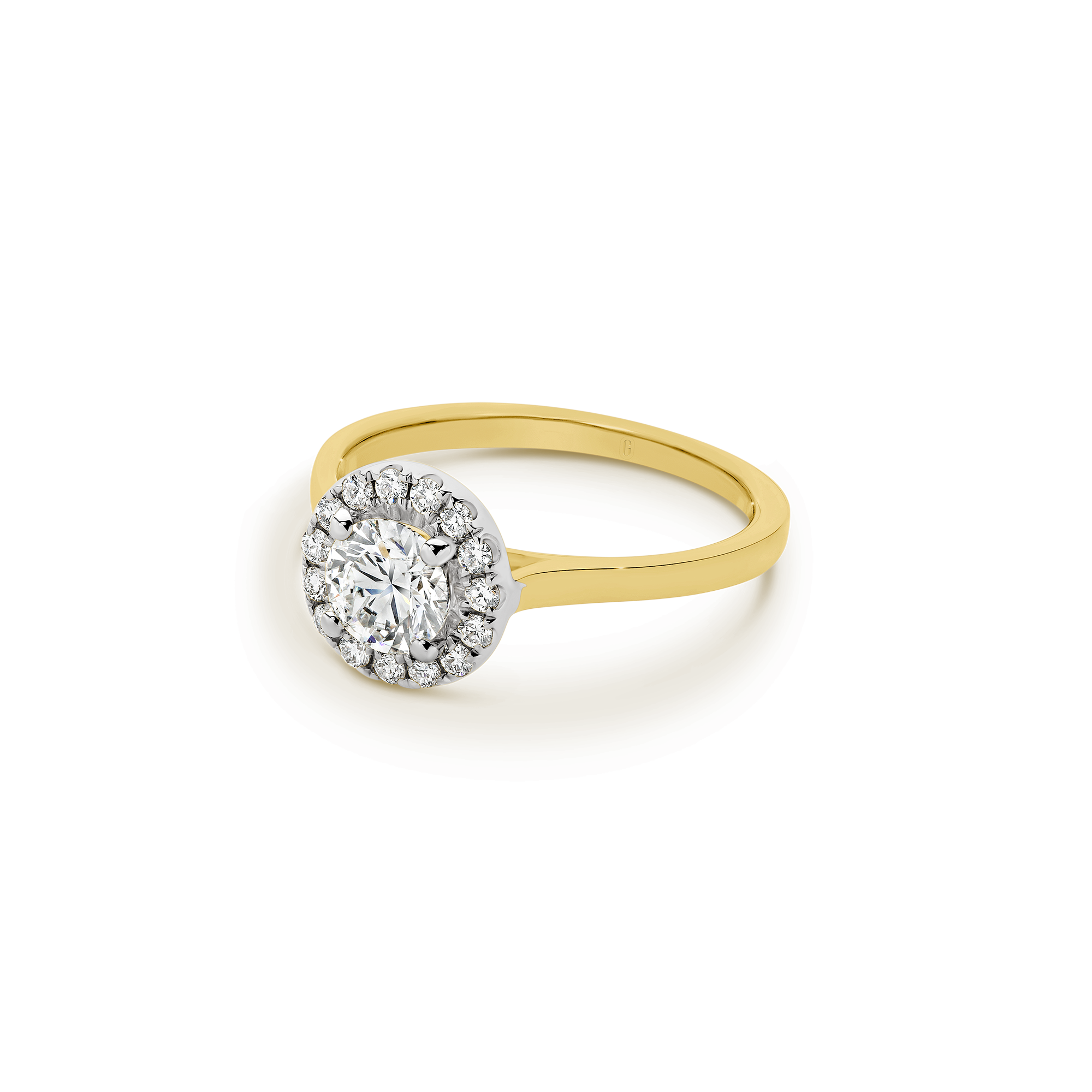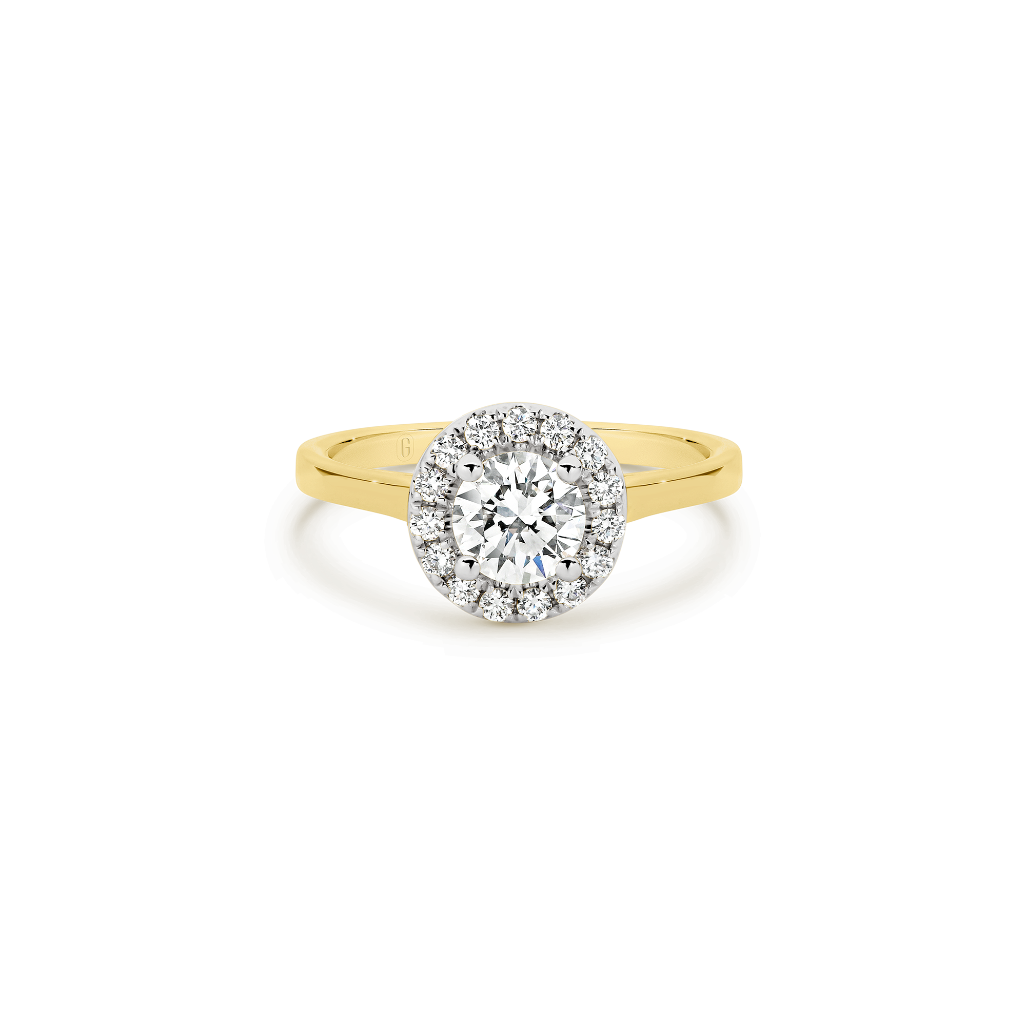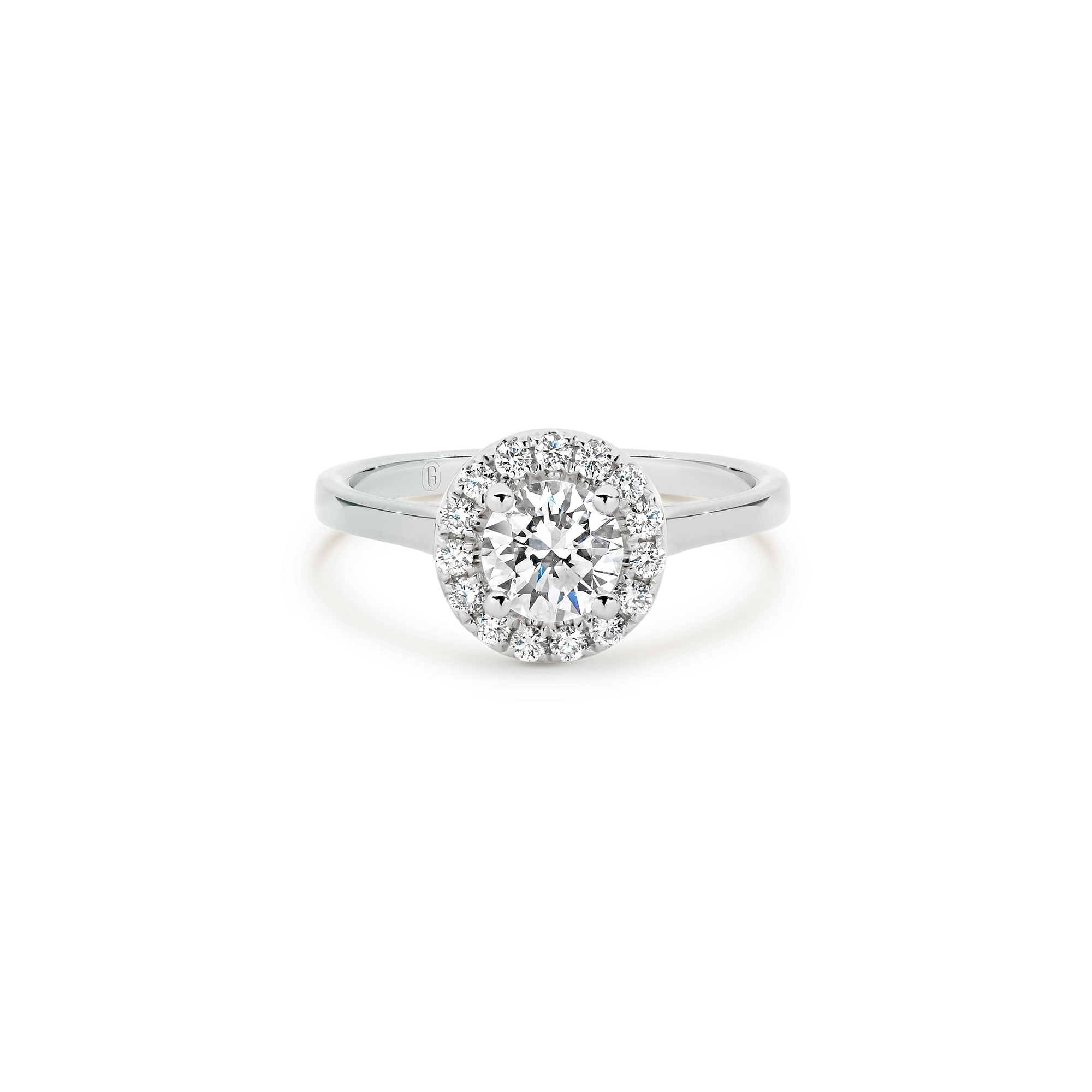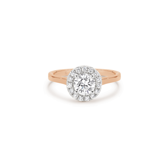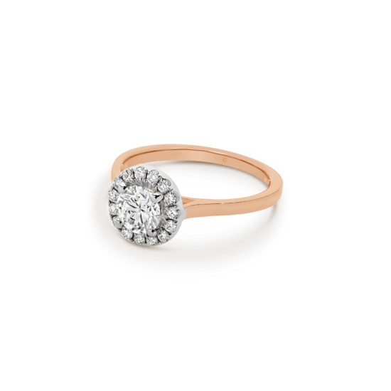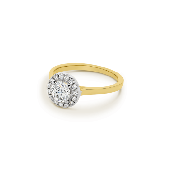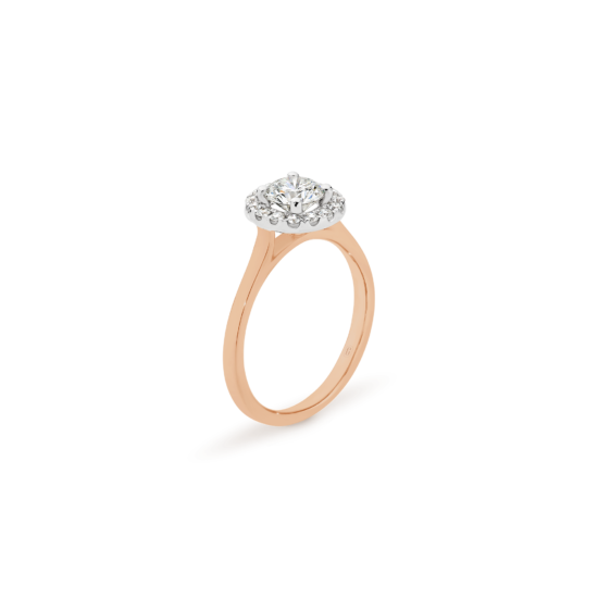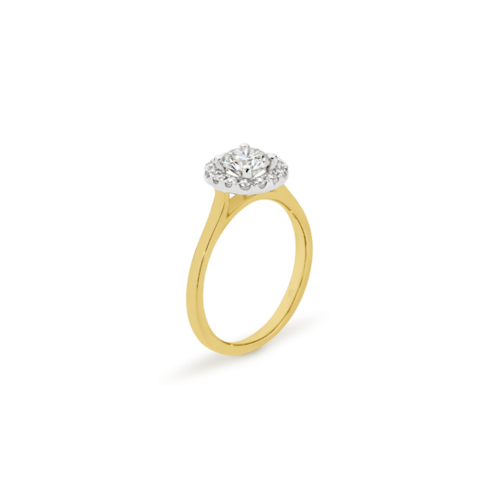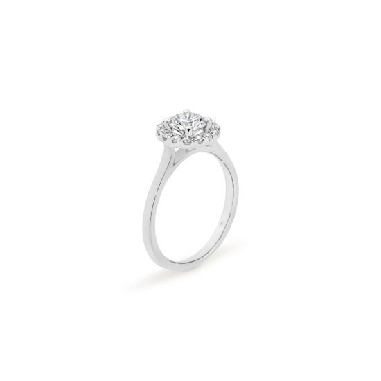 Halos are not just for angels! The round brilliant cut diamond in this magnificent engagement ring is ensconced with a swirl of claw set diamonds. A forever classic, the diamond halo gives the illusion of a larger centre stone and the flurry of sparkle that comes from the light dancing off multiple diamond facets is a win!
