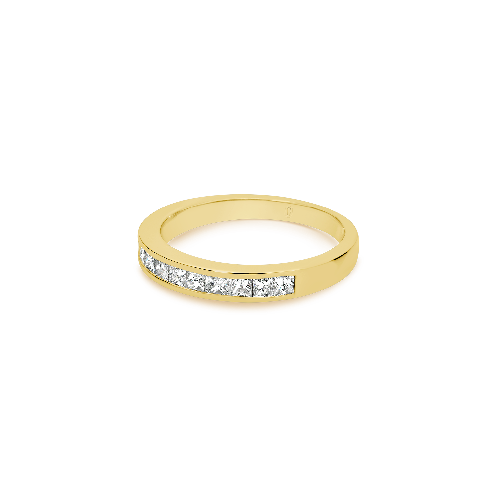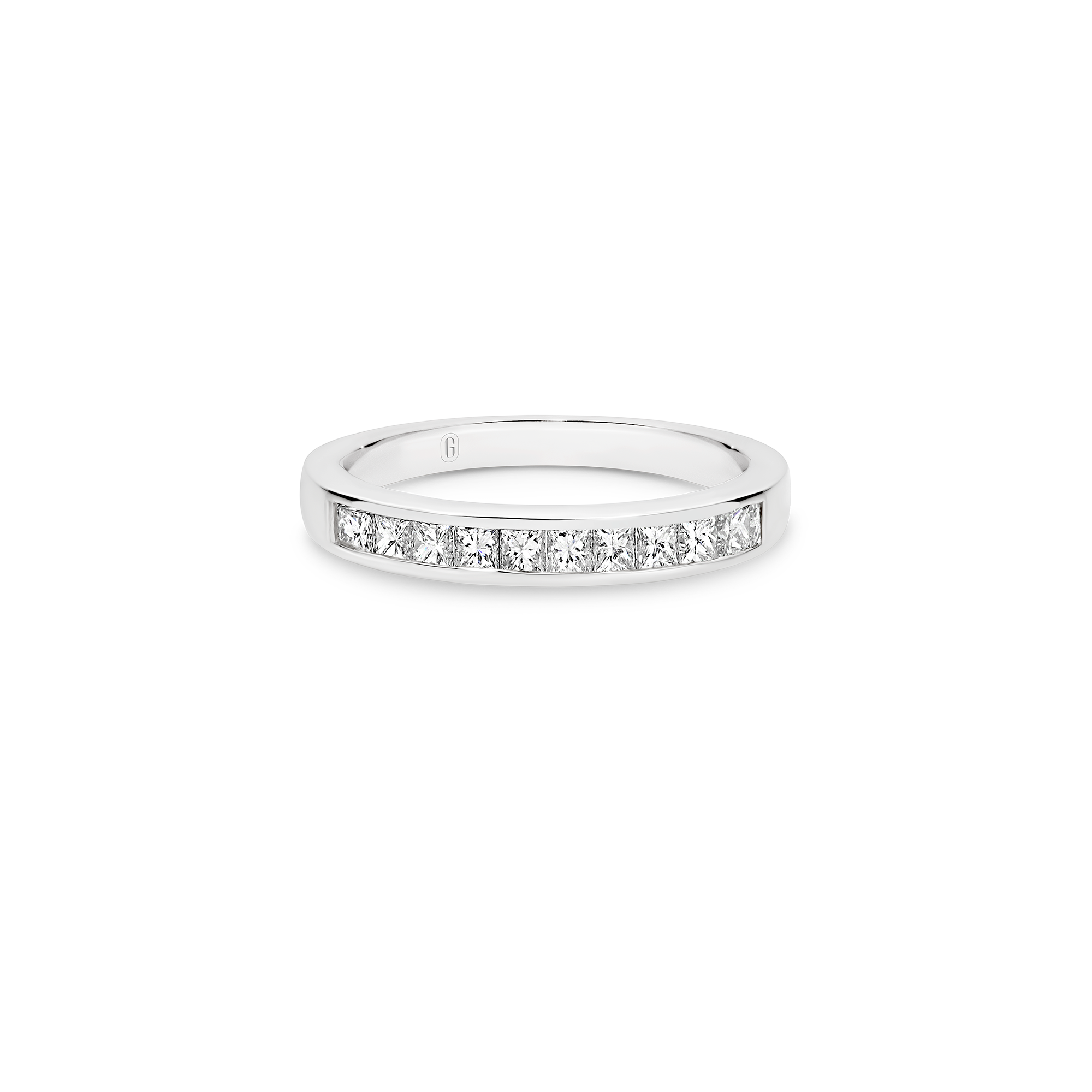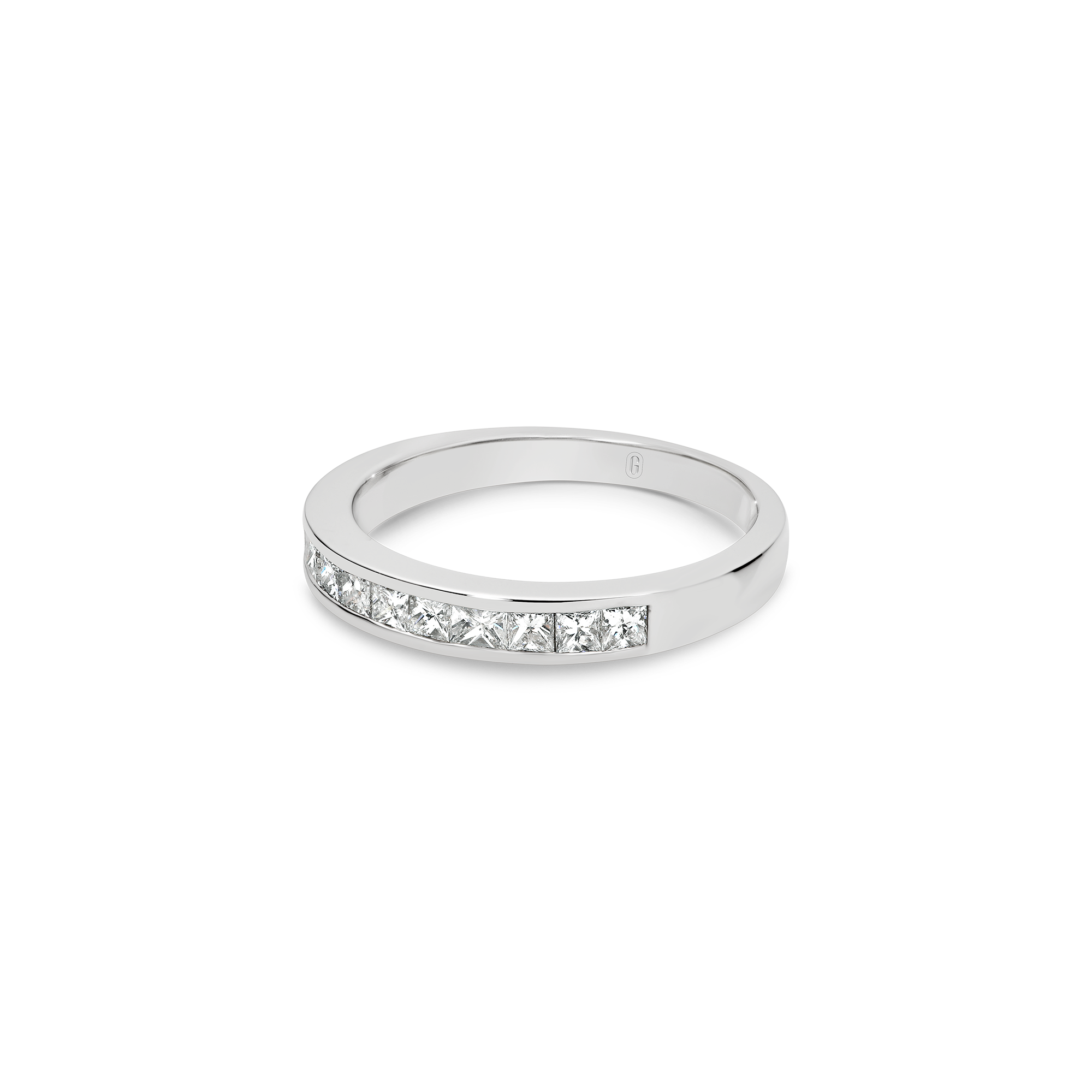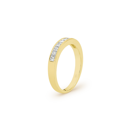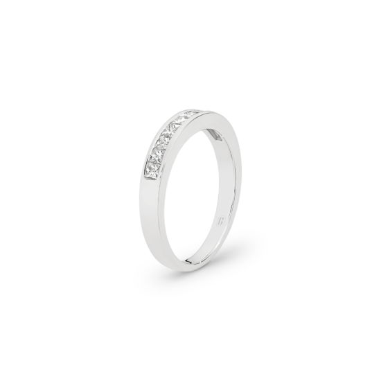Ten glistening channel set, princess cut, diamonds decorate this unique half eternity band, forming an uninterrupted row of dazzling fire! Teams up effortlessly with any engagement ring and makes for a meaningful anniversary gift.