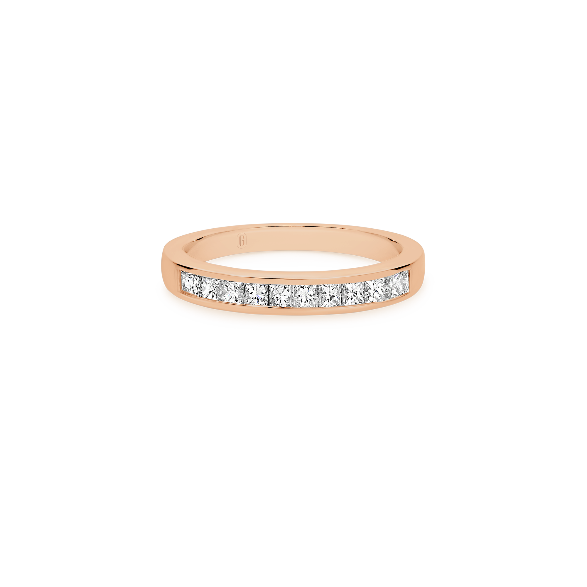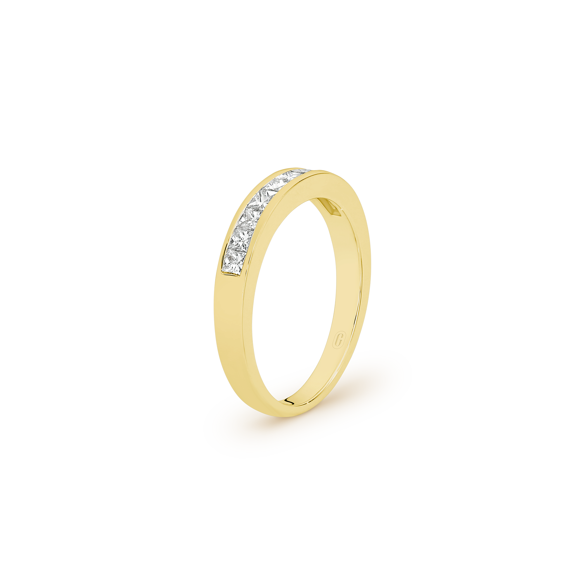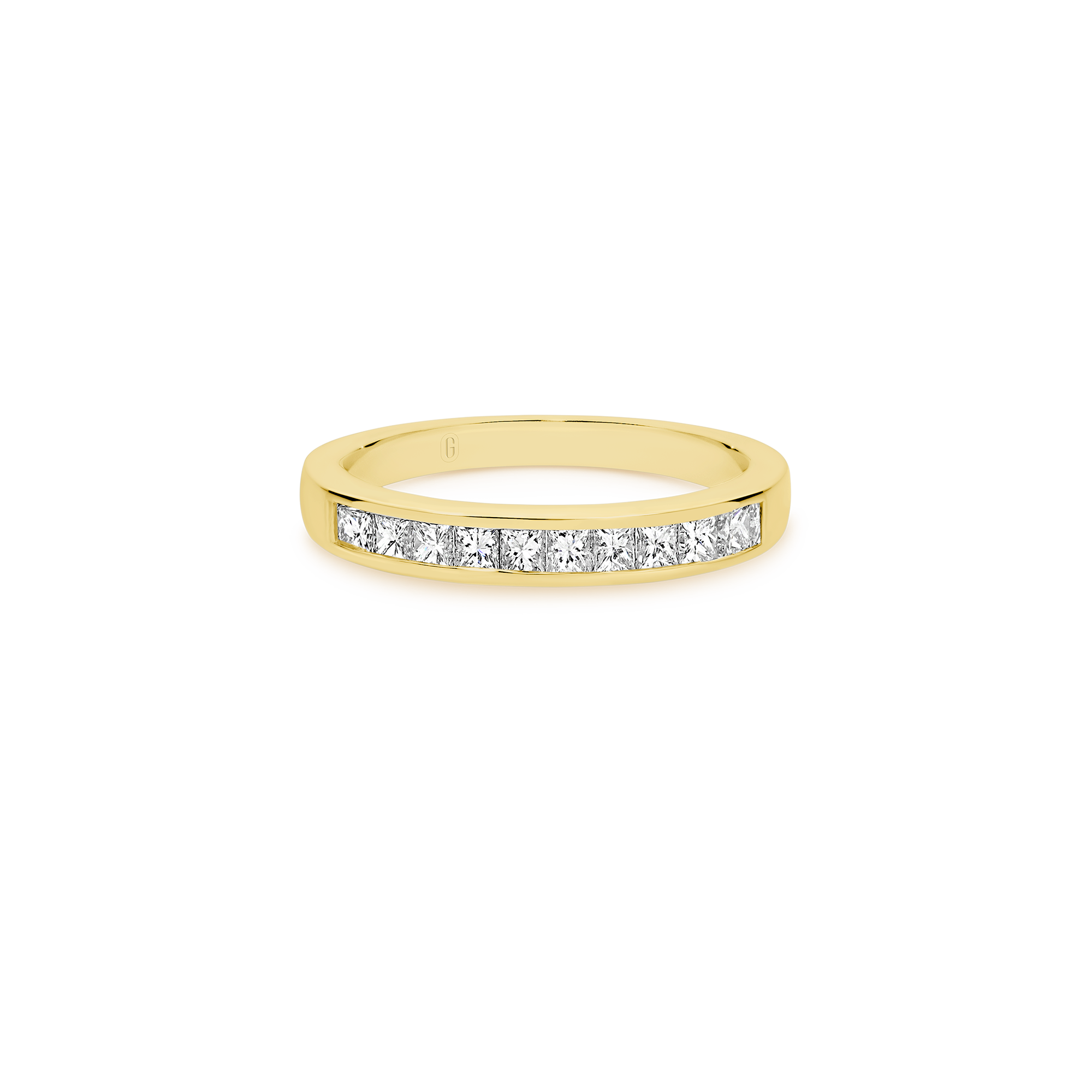 Ten glistening channel set, princess cut, diamonds decorate this unique half eternity band, forming an uninterrupted row of dazzling fire! Teams up effortlessly with any engagement ring and makes for a meaningful anniversary gift.