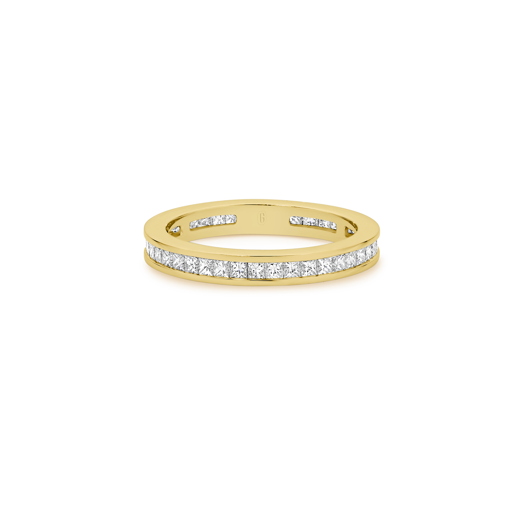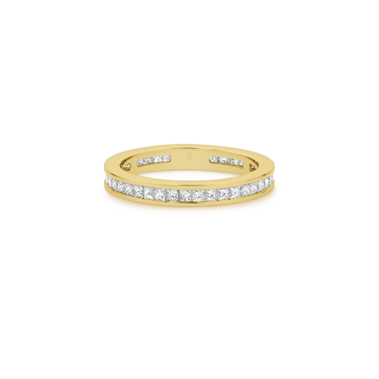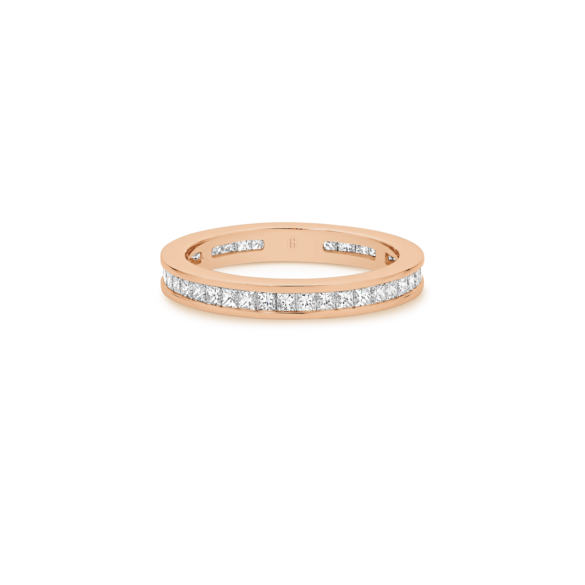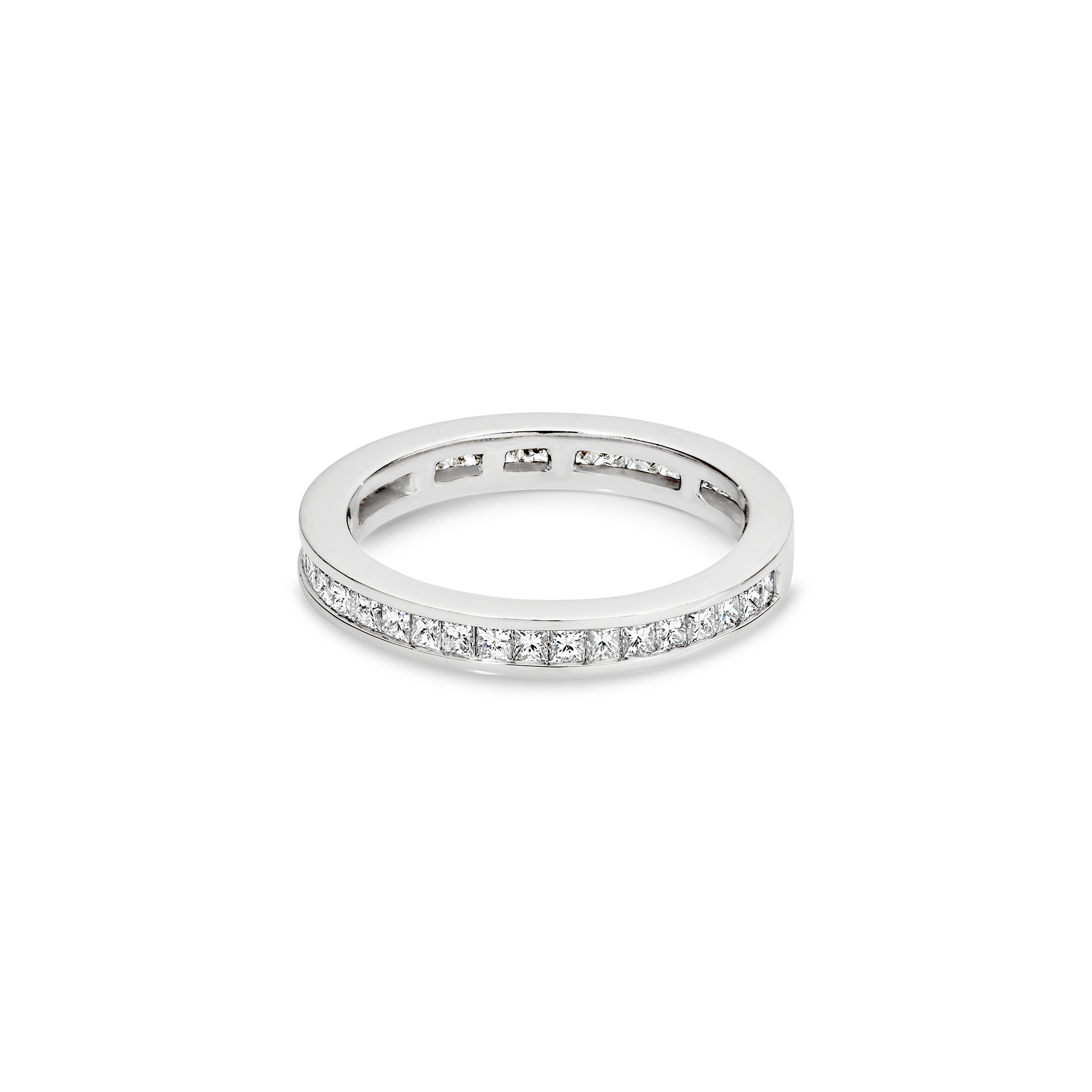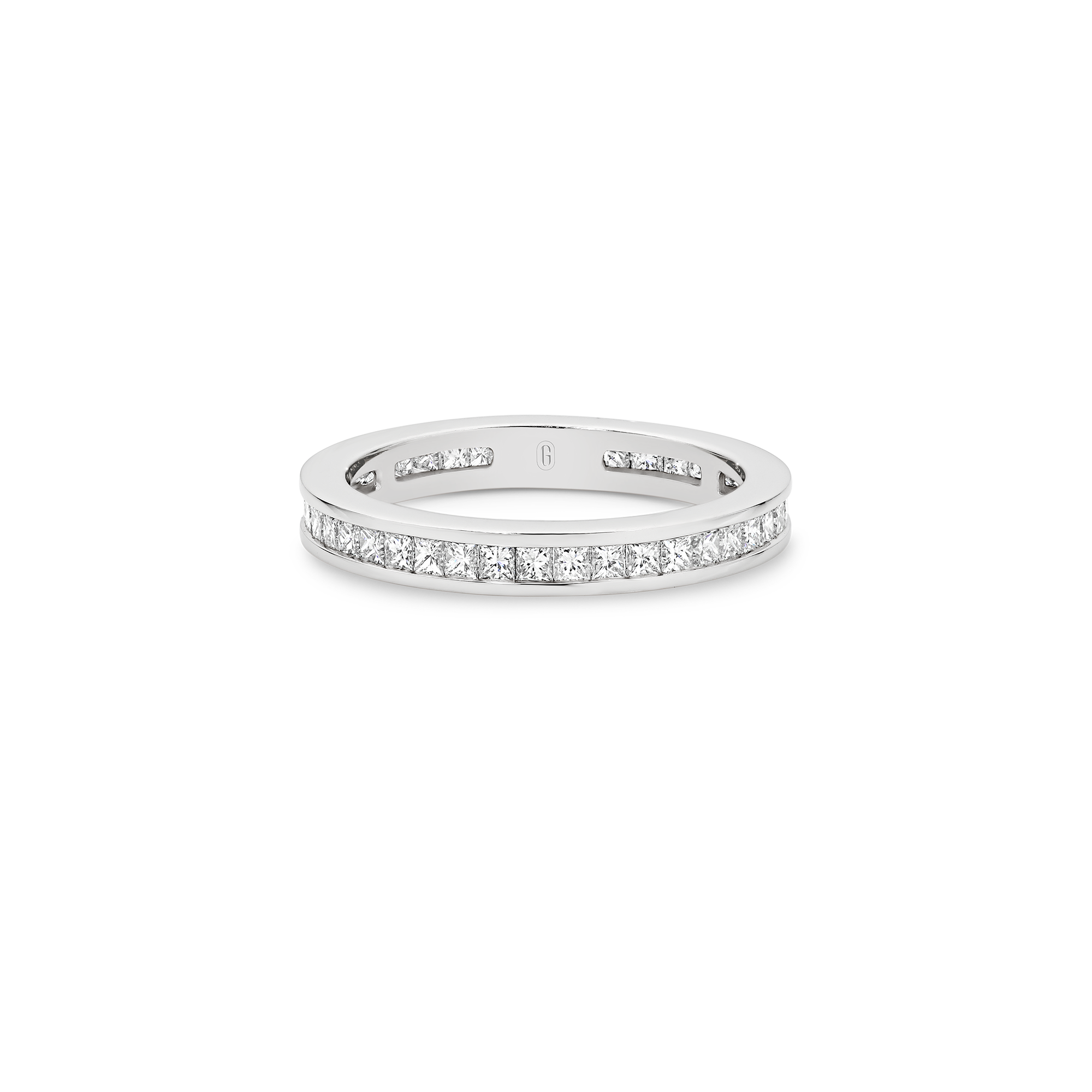 A celebration of love and devotion, this unique eternity band is distinguished by a row of princess cut diamonds that fit seamlessly inside a channel-set band. Timeless style, created to endure a lifetime.