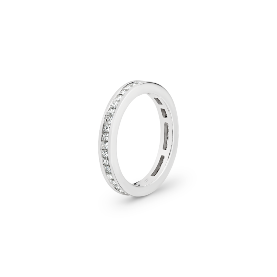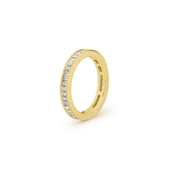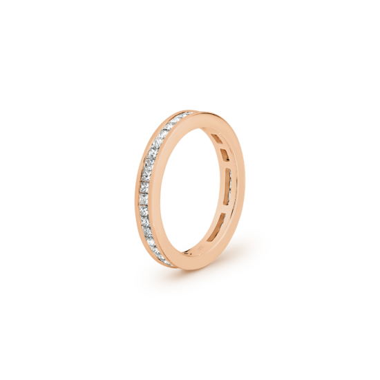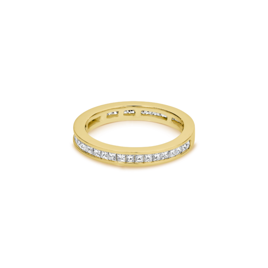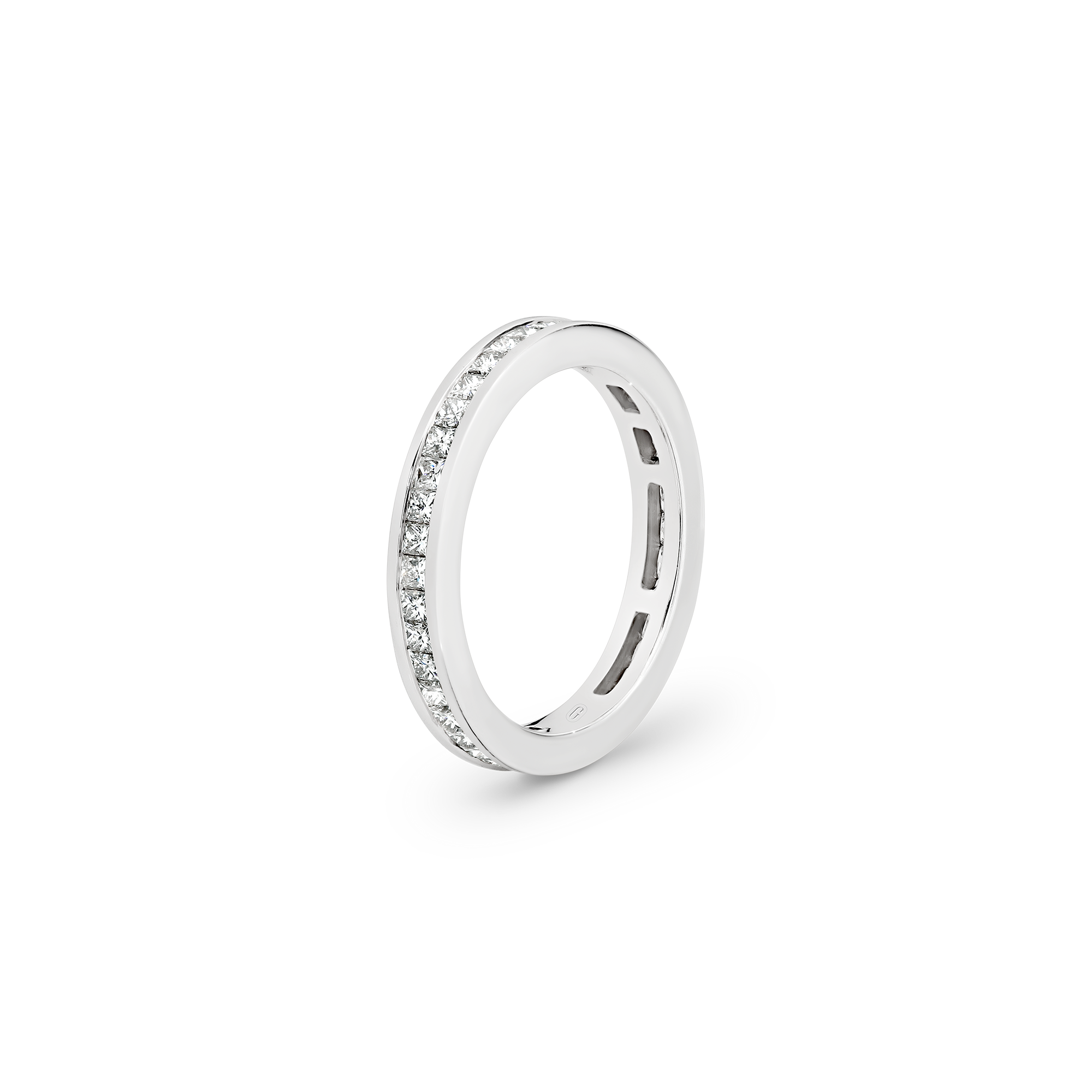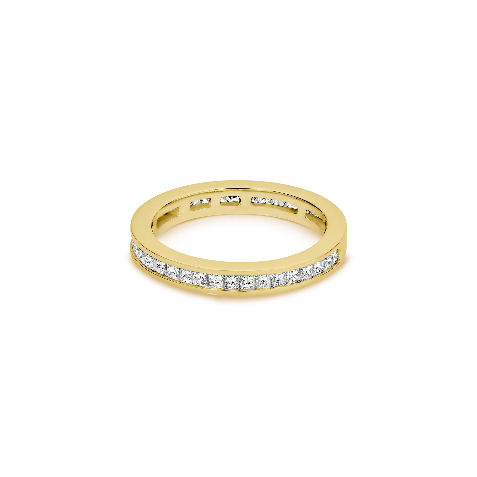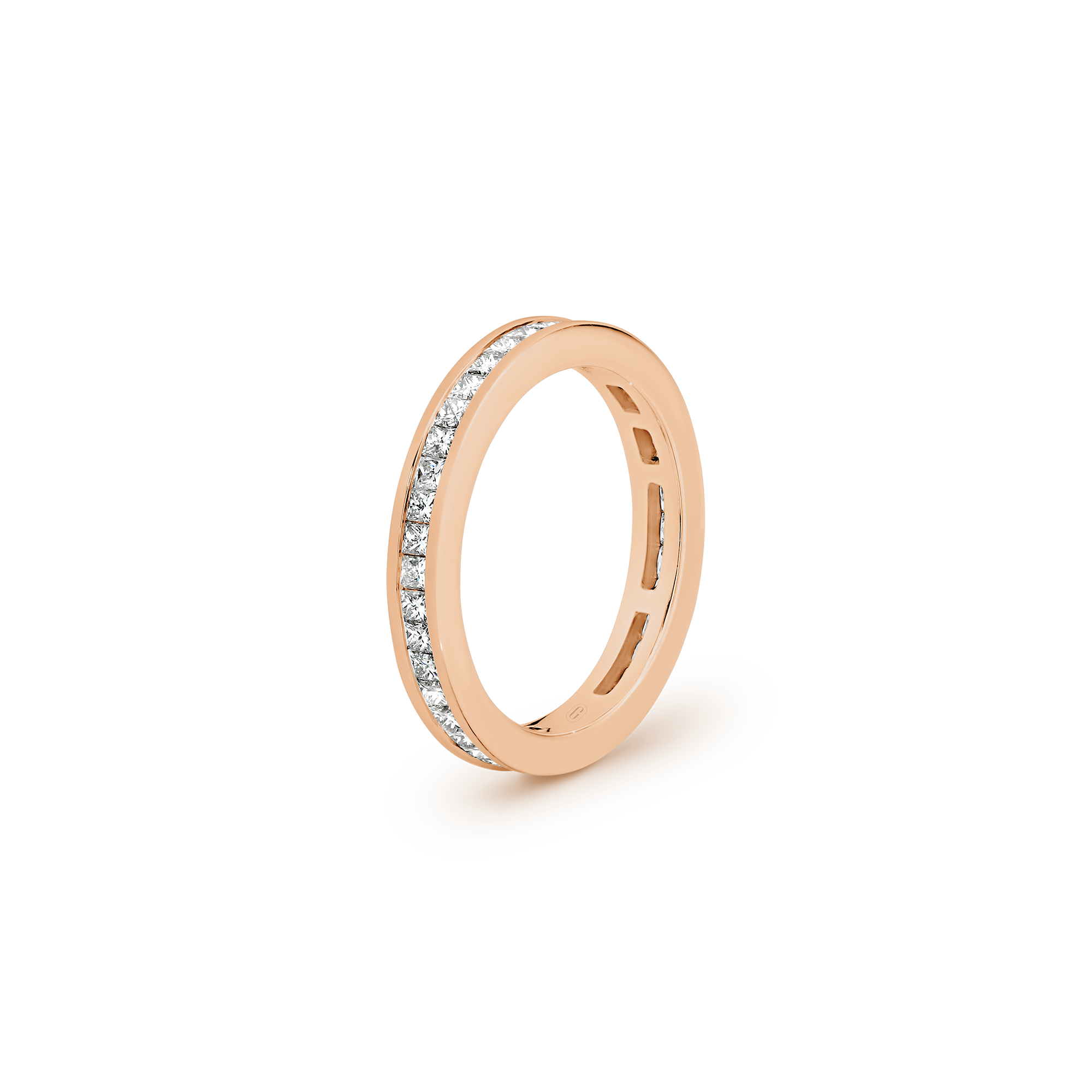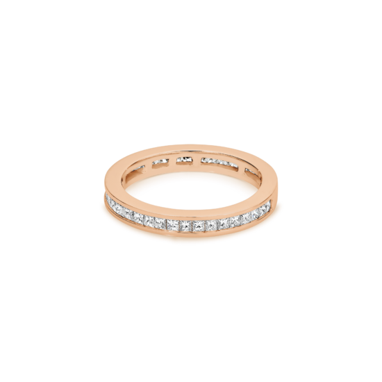 A celebration of love and devotion, this unique eternity band is distinguished by a row of princess cut diamonds that fit seamlessly inside a channel-set band. Timeless style, created to endure a lifetime.
