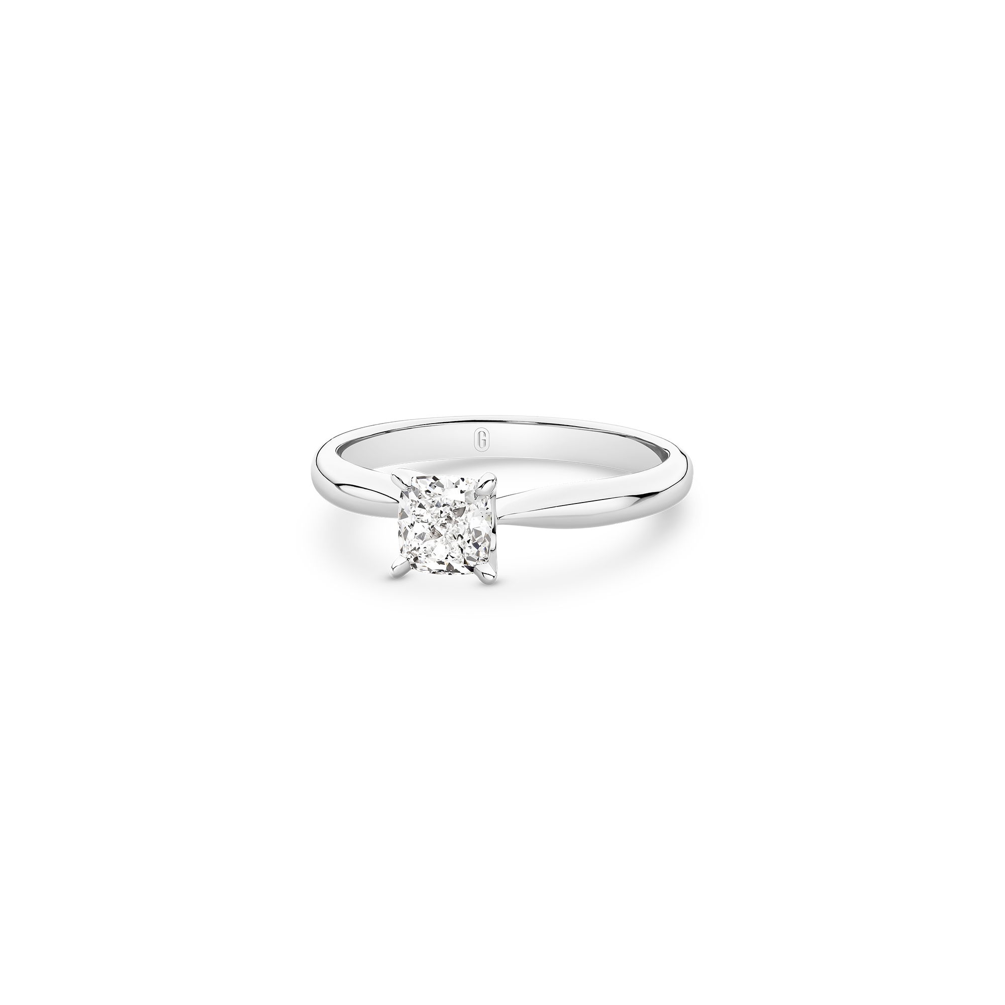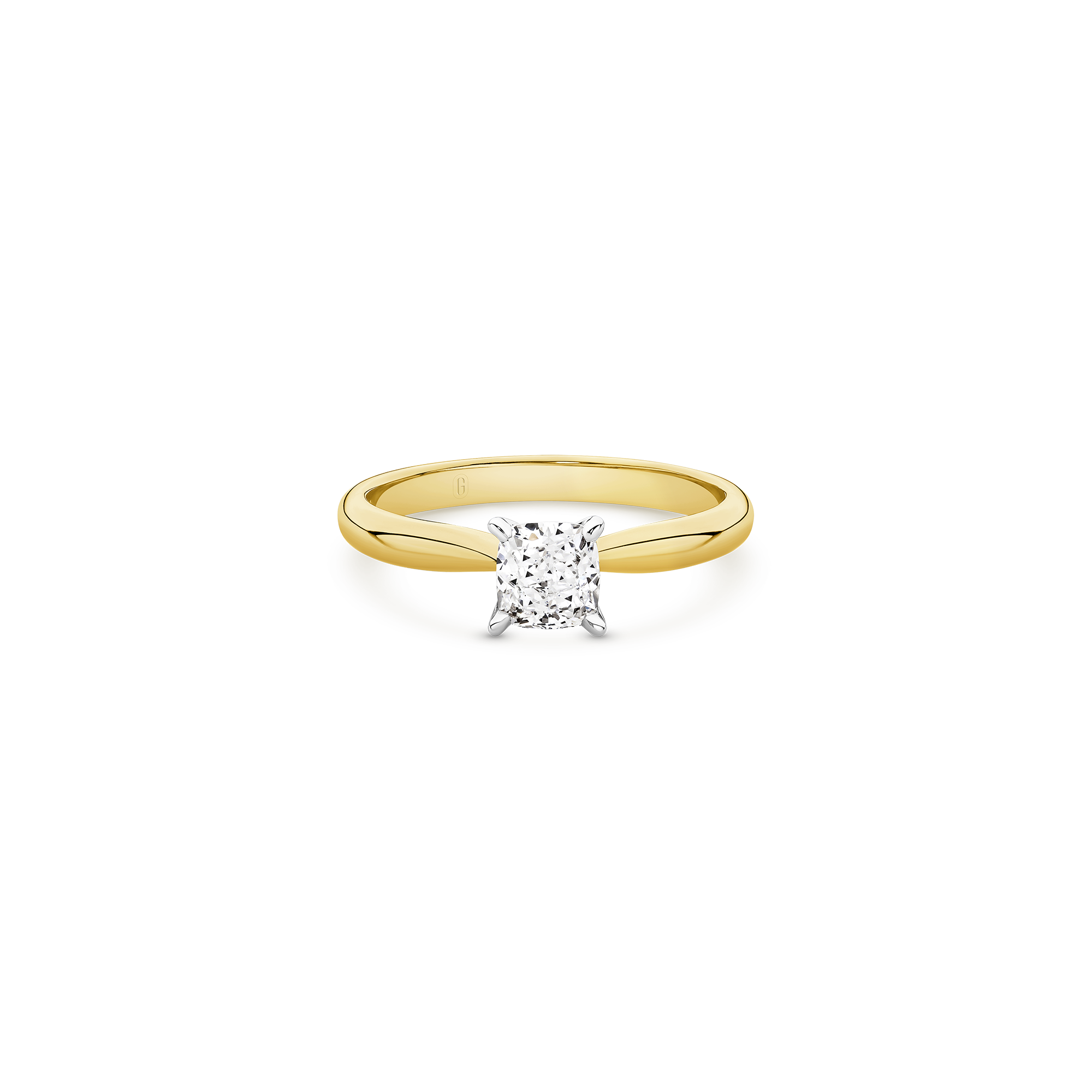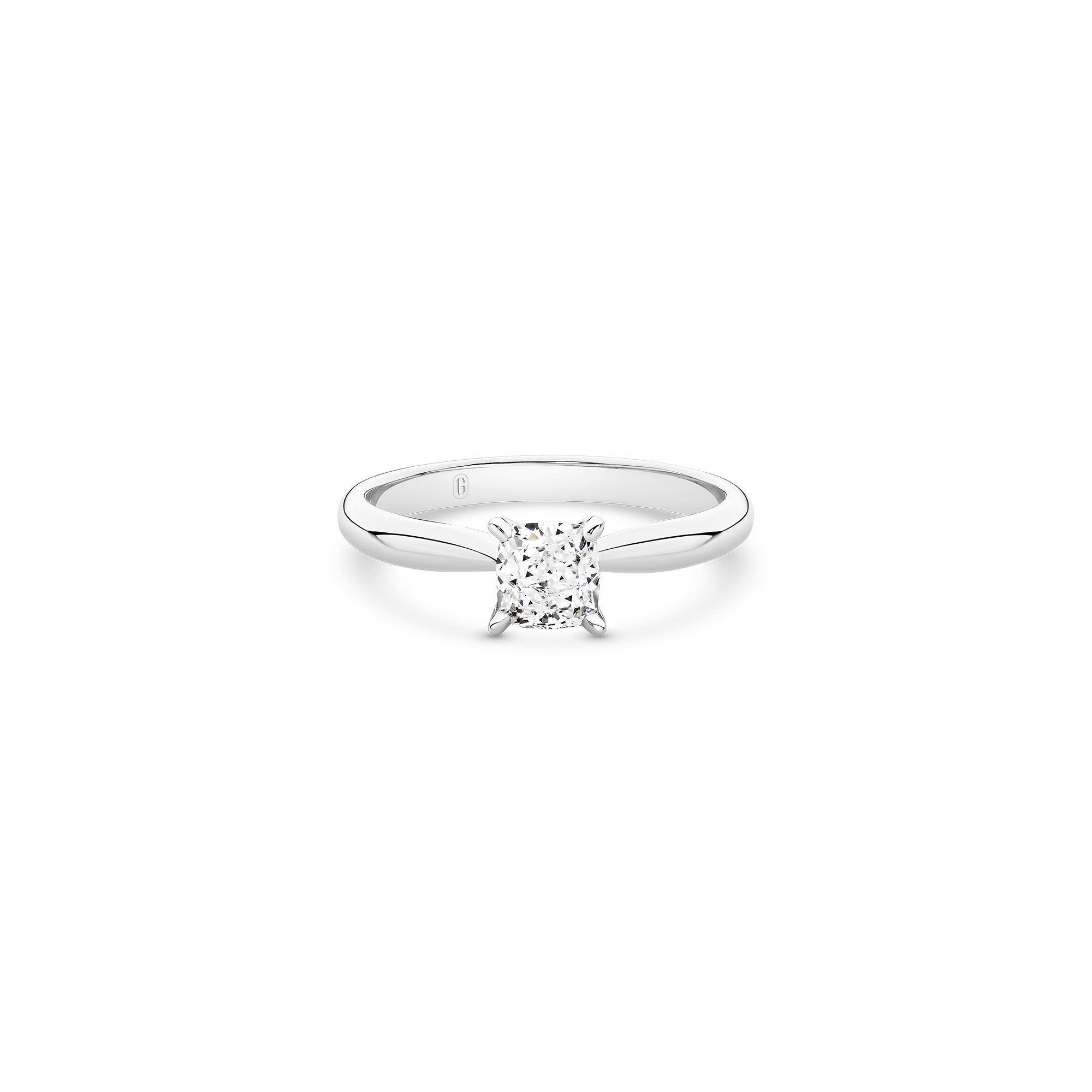 This exceptional piece is a tribute to timeless beauty, featuring a mesmerizing cushion cut diamond secured by a delicate 4-claw setting on a tapered solitaire band. The cushion cut, renowned for its romantic allure, takes centre stage in this exquisite design. Its unique blend of soft curves and brilliant facets creates a dance of light that is both captivating and enduring. Crafted with precision and passion, this ring is a symbol of your unique love story — a perfect fusion of tradition and contemporary style.