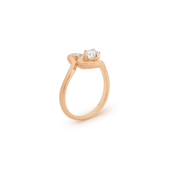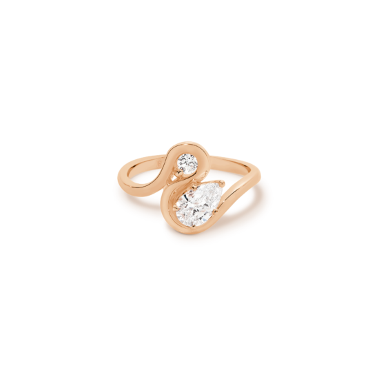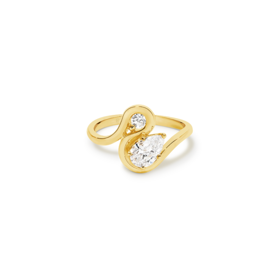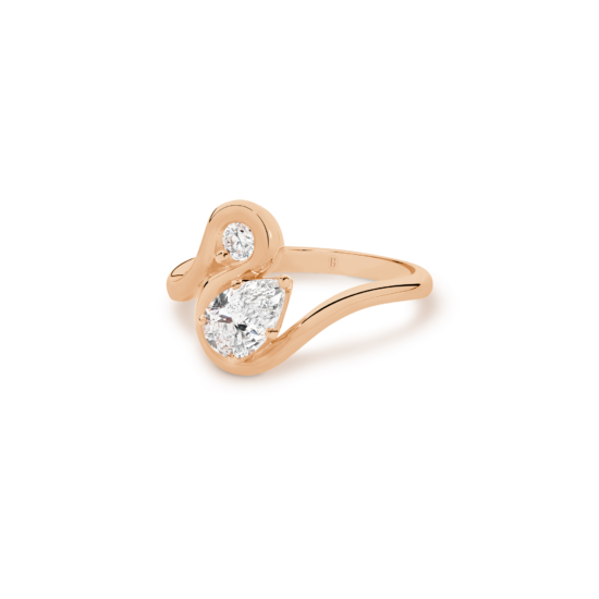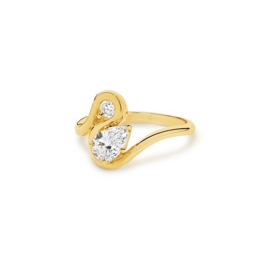 A sinuous and delightful take on the Toi et Moi ring that unites a brilliant round-cut and pear-shaped diamond in a jaw-dropping display of light and sparkle. The open bezel-style setting really allows each stone to be displayed to the fullest, while the twists and turns of the gorgeous 18k gold band create an elegant design that you will fall in love with!