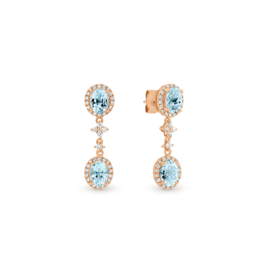 These gorgeous two-tiered earrings offer nonstop sparkle. Oval cut aquamarines are enveloped in diamond encrusted halos, separated by round cut diamonds set to imitate stars on an 18k gold drop. Perfect for every day, or even your special day!