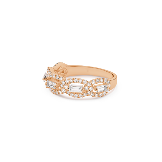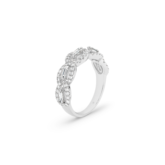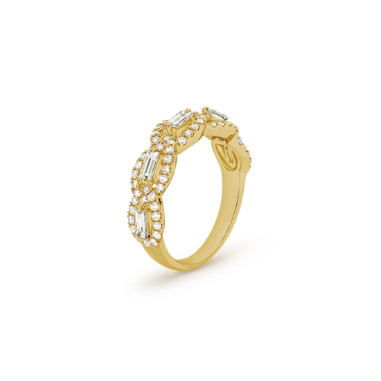 This exceptional piece showcases the perfect fusion of classic and contemporary design, featuring a mesmerizing arrangement of baguette and round diamonds. The baguette diamonds, with their sleek and elongated shapes, bring an air of modernity to this classic piece. Their parallel arrangement exudes a sense of order and balance. On the other hand, the round diamonds offer timeless radiance, capturing the light and reflecting it in a symphony of brilliance.