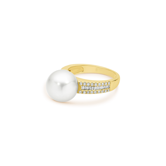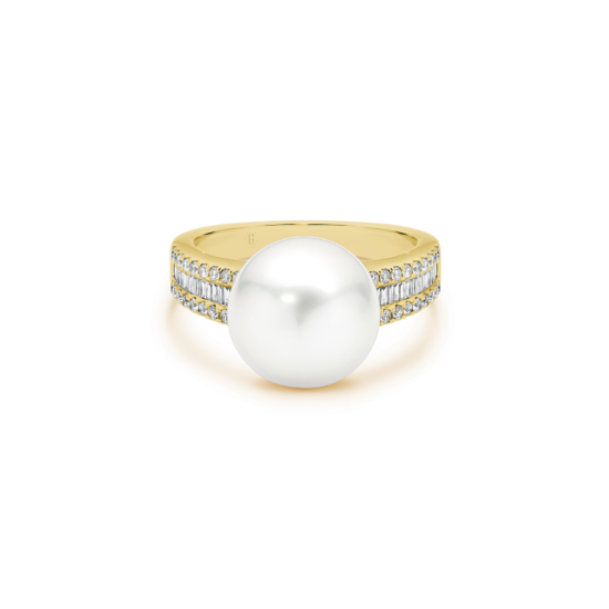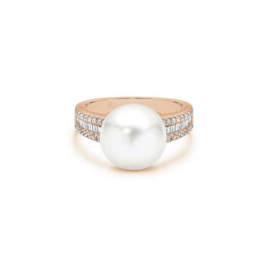 We can’t decide what we love most about this ring – the voluminous South Sea Pearl that seems to float effortlessly atop the band, or the magnificent tapestry of round and baguette cut diamonds! A high gallery means there’s enough space to pair it with another band!