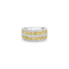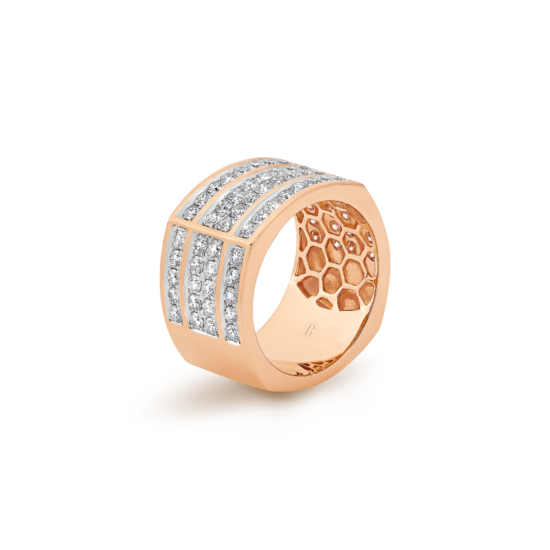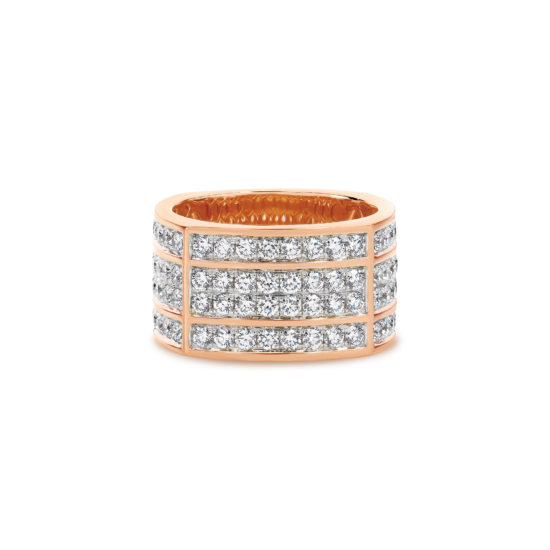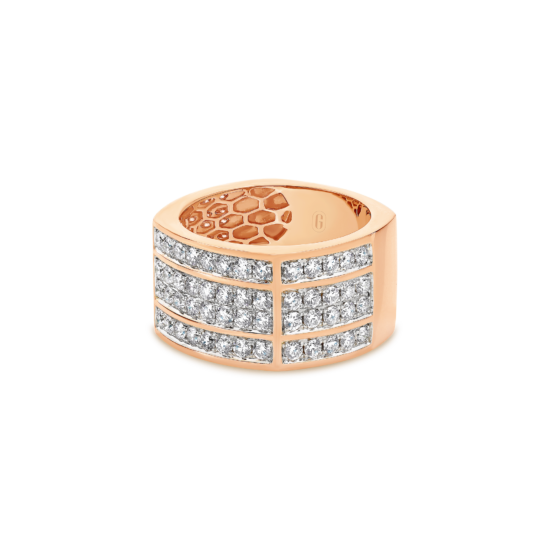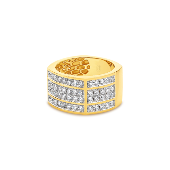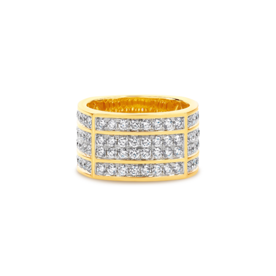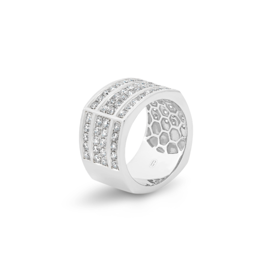 Bold and edgy, this blinding statement ring is paved with four rows of round brilliant cut diamonds! Luminous, yet decidedly masculine in design – with its geometric lines, ample width and sharp corners.