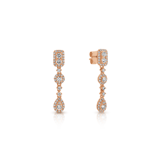 Stunning shapes combine to create a spellbinding effect in these unforgettable 18K gold drop earrings. 1.20 carat of round brilliant and pear cut diamonds will guarantee all eyes are on you! The perfect finishing touch for a blushing bride — exquisite when paired with our classic tennis necklace.