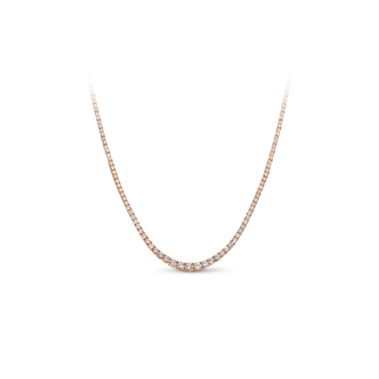 Few pieces of jewellery make a statement quite like the tennis necklace, and this piece does just that! Atop a sleek evening gown or glistening between a crisp white shirt, this necklace is the ultimate in versatile glamour that will be treasured forever. A seamless row of spectacular brilliant cut round diamonds dazzle in a minimal 18k gold claw setting, sitting flush just below the collarbone for a breathtaking profile. The graduating size of the diamonds adds a refined air to our design – own it today!