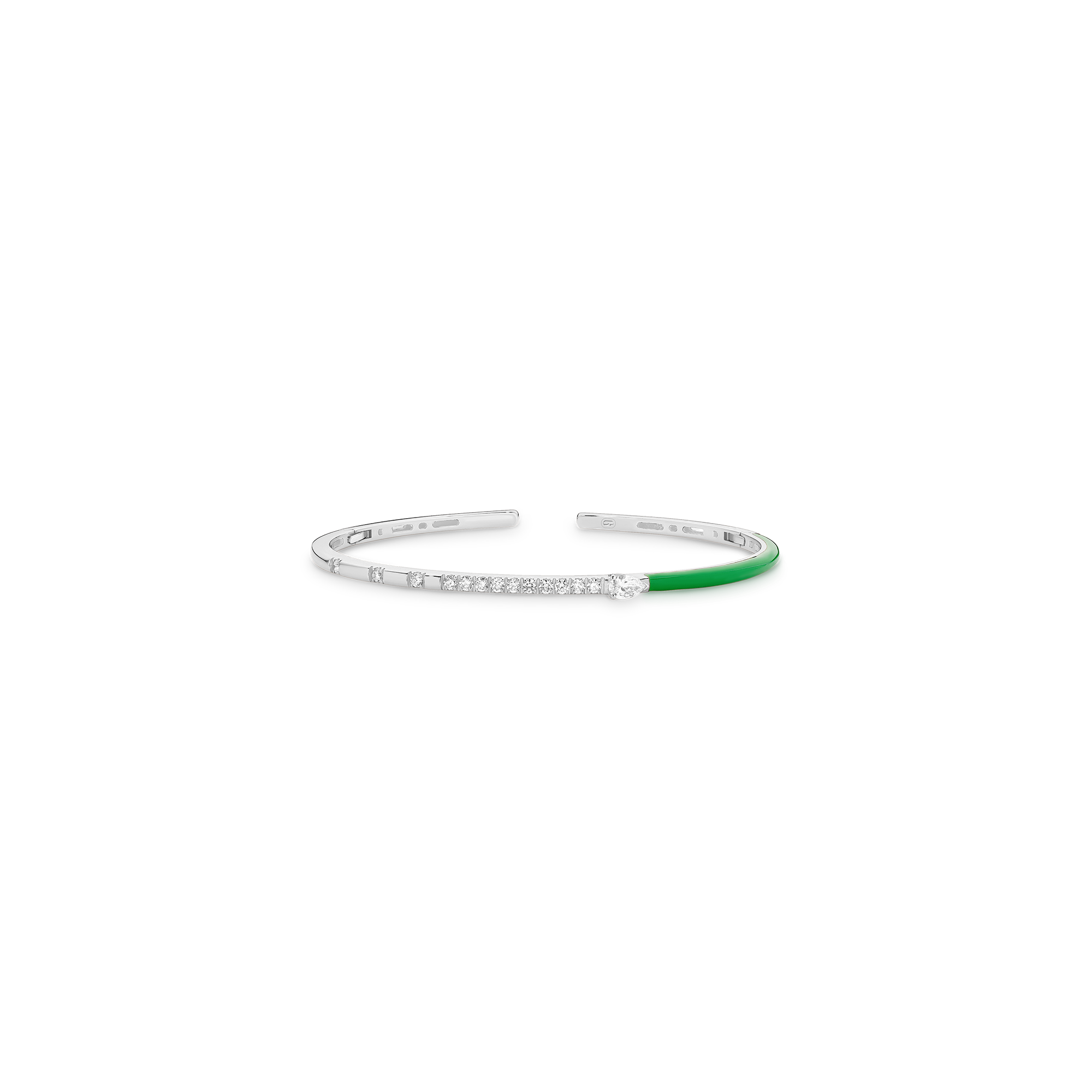 Stay on trend with this flamboyant 18k rose gold bangle, half of which is ensconced in rich forest green enamel, further enhanced by an array of diamonds. Guaranteed to stand out in a crowd! To complete the look, layer with the other mesmerizing colours in this exciting range – each piece is one-of-a-kind!