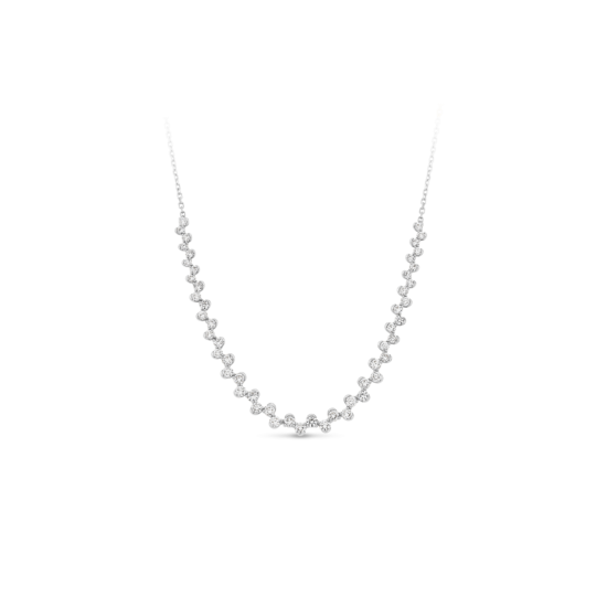 This half-bezel diamond collier necklace is the perfect balance of dainty sophistication and refined brilliance. Each diamond is partially framed in a sleek half-bezel setting, allowing for maximum sparkle while maintaining a modern, minimal look. The delicate design sits gracefully on the neckline, making it an effortless choice for both everyday wear and special occasions. Understated yet dressy, this piece is a timeless addition to any jewellery collection.