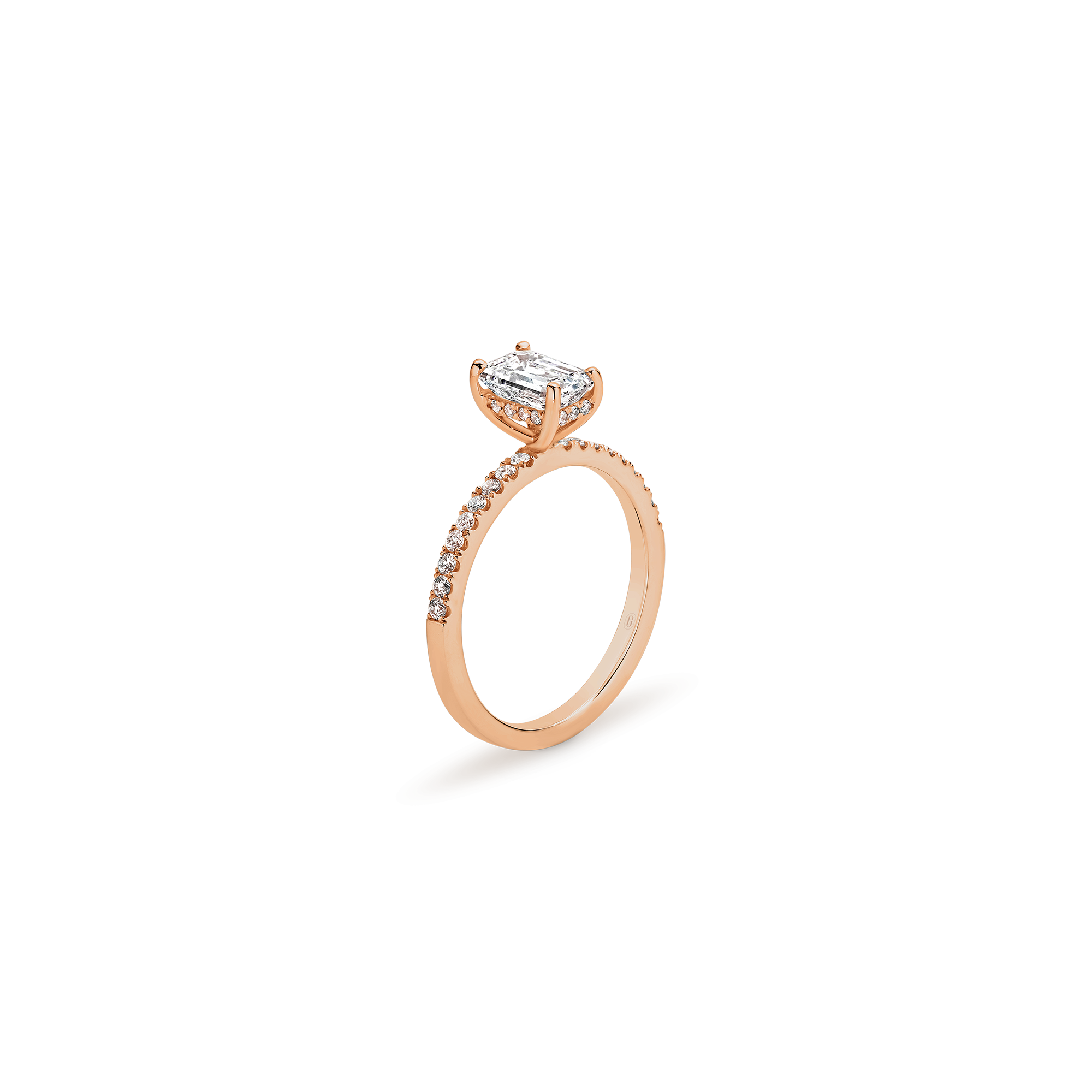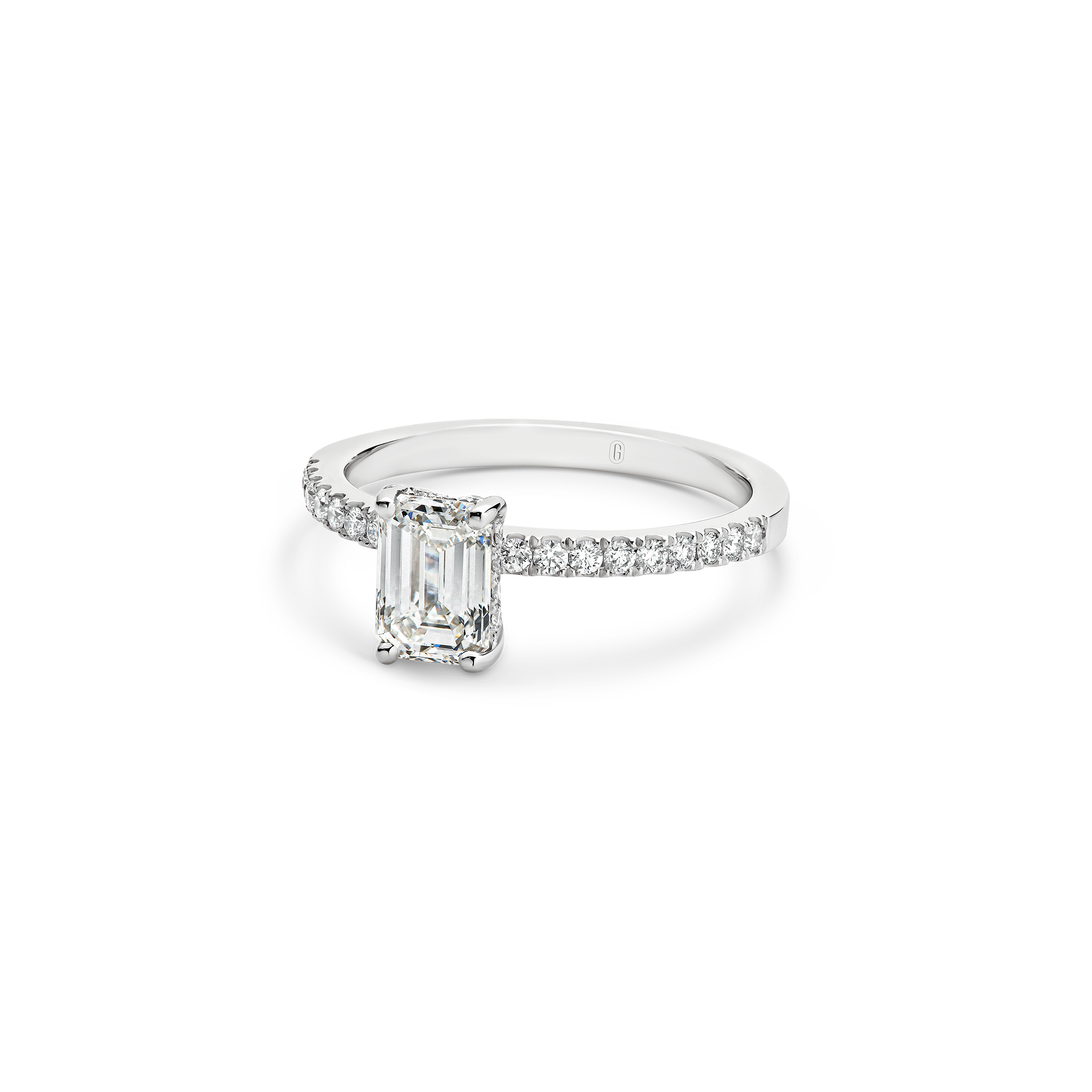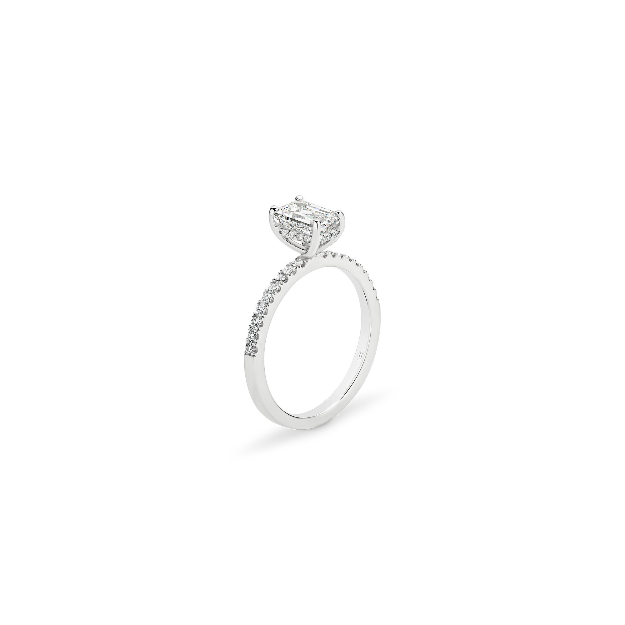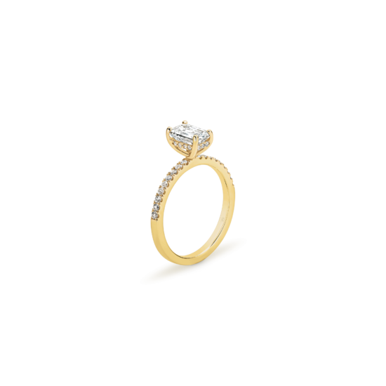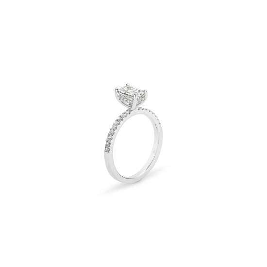 This emerald cut diamond engagement ring has a mystique all of its own! A step cut diamond catches the light in its own unique way – creating dazzling flashes of light, as opposed to the uniform shimmer of a brilliant cut. Paired with the sparkle of a claw set diamond band, and the hidden halo nestled within the gallery, this ring has luminary effect like no other.