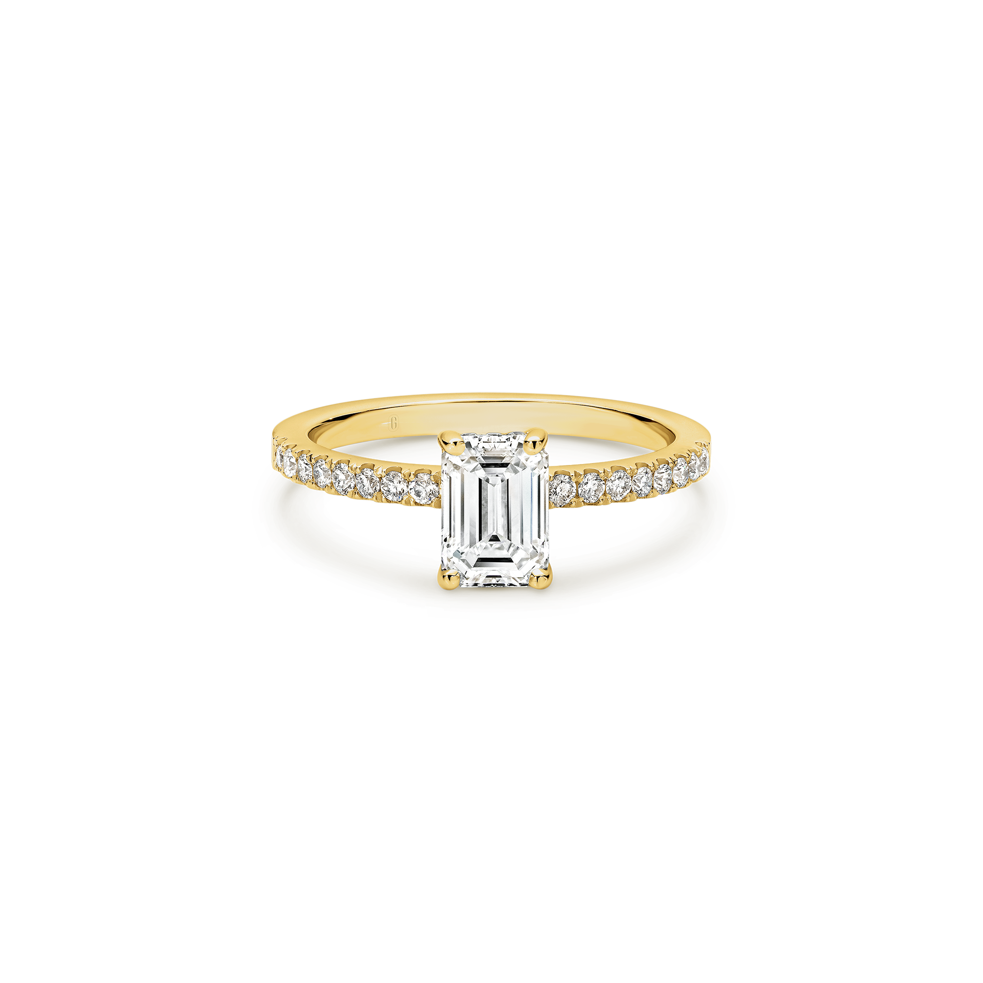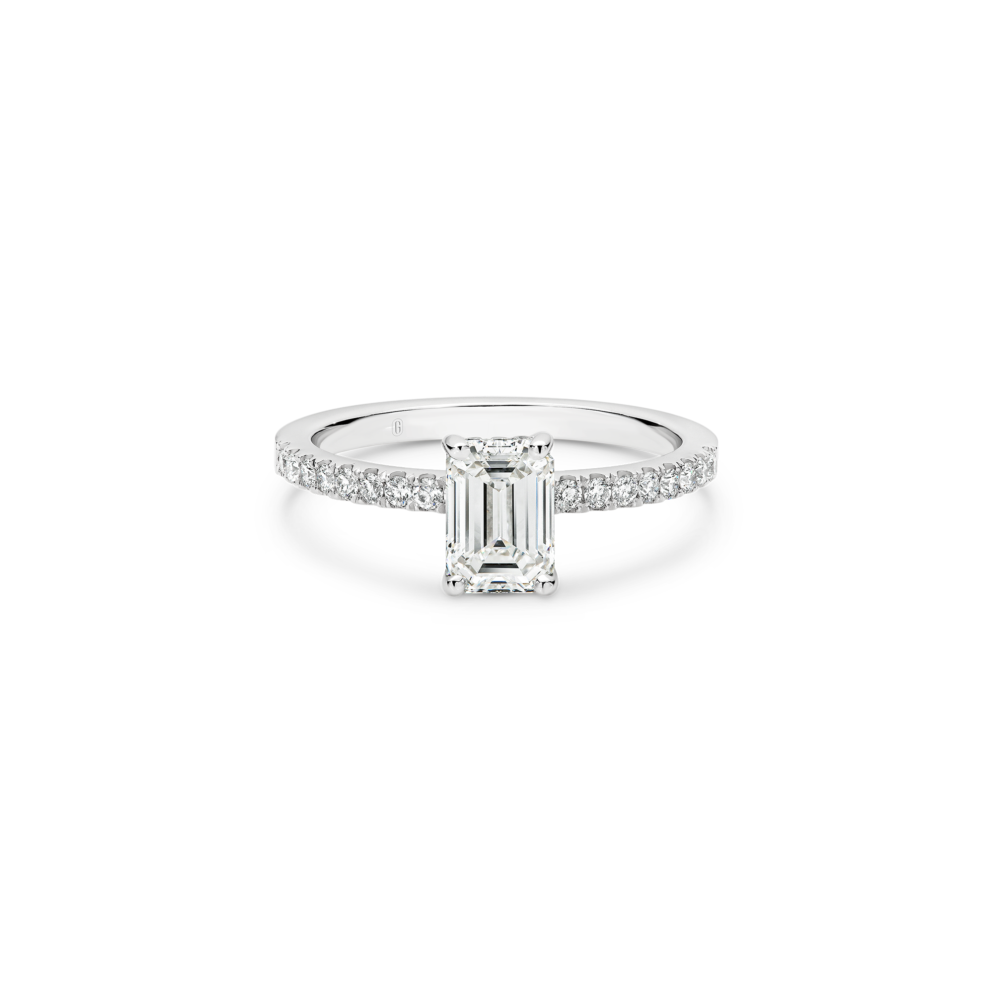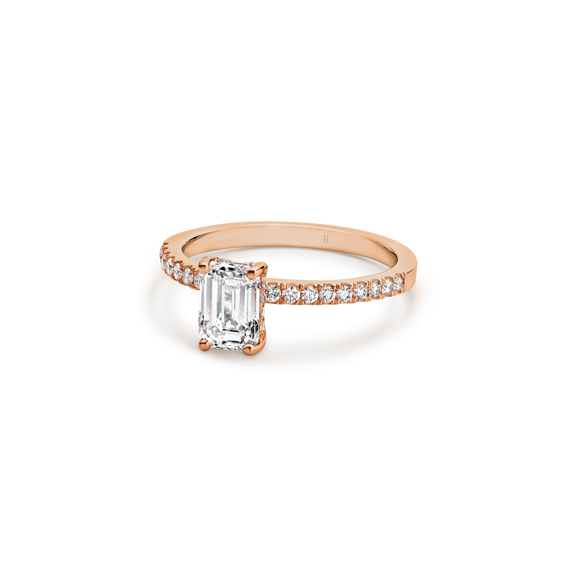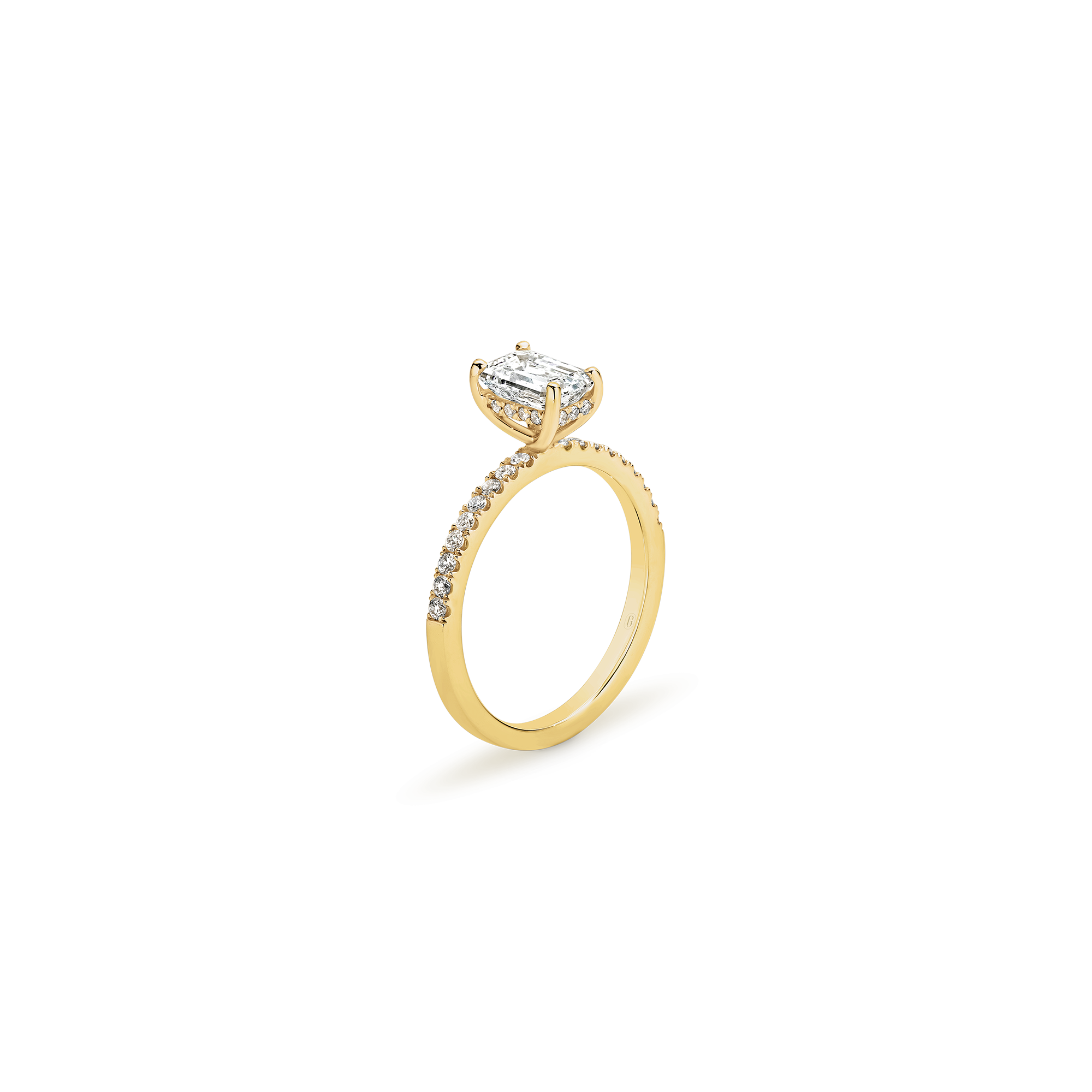 This emerald cut diamond engagement ring has a mystique all of its own! A step cut diamond catches the light in its own unique way – creating dazzling flashes of light, as opposed to the uniform shimmer of a brilliant cut. Paired with the sparkle of a claw set diamond band, and the hidden halo nestled within the gallery, this ring has luminary effect like no other.