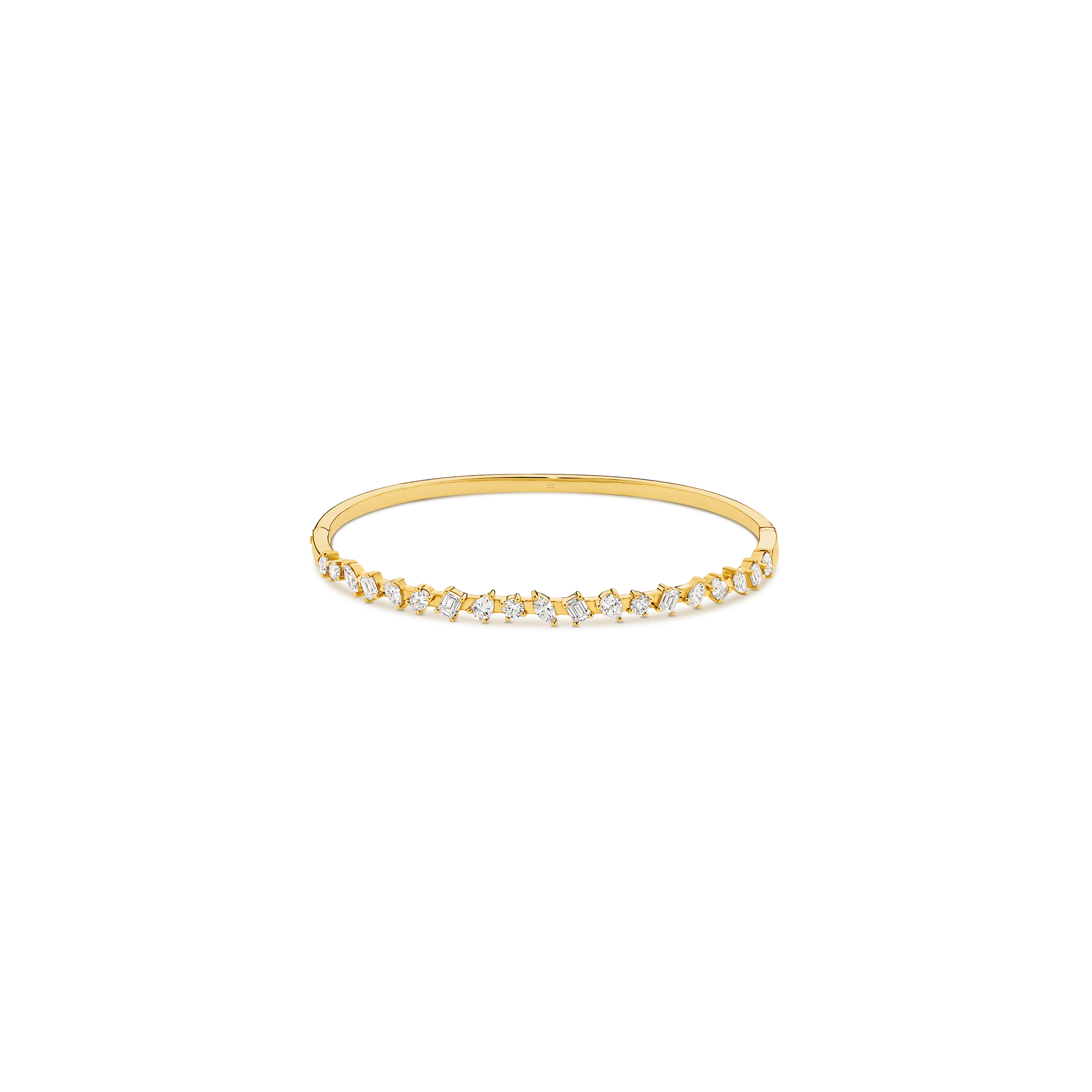 This bangle is a masterclass in geometry, showcasing a sophisticated rotation of oval, pear, marquise, round, and emerald-cut diamonds. Each stone is claw-set in high-polish gold, creating a structural yet radiant silhouette that celebrates the unique fire of each diamond shape.