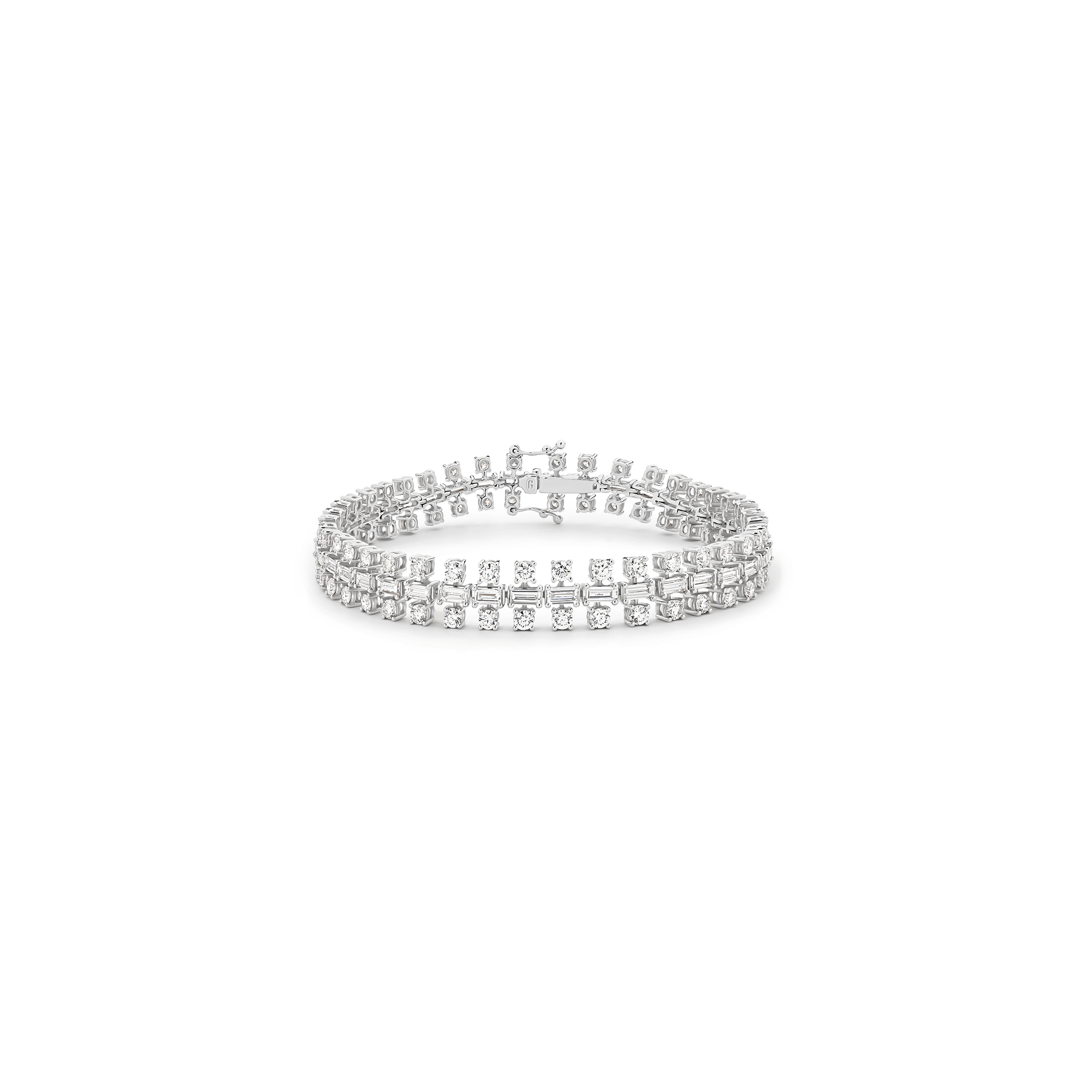 A study in shimmering contrast, the bracelet features a core of precision-set baguettes running through the centre for a streamlined, infinite glow. Along the edges, round brilliant diamonds are scattered like stardust, breaking the linear form with organic flashes of light. This combination of geometric precision and “scattered” brilliance creates a rhythmic visual flow that never breaks, no matter how you move.