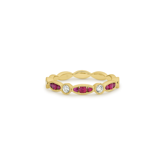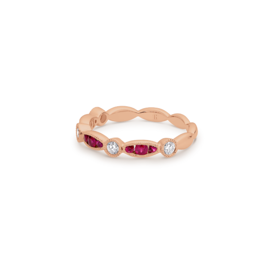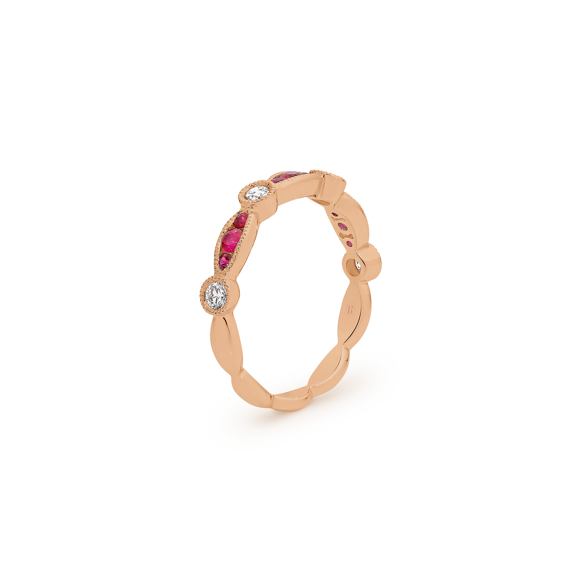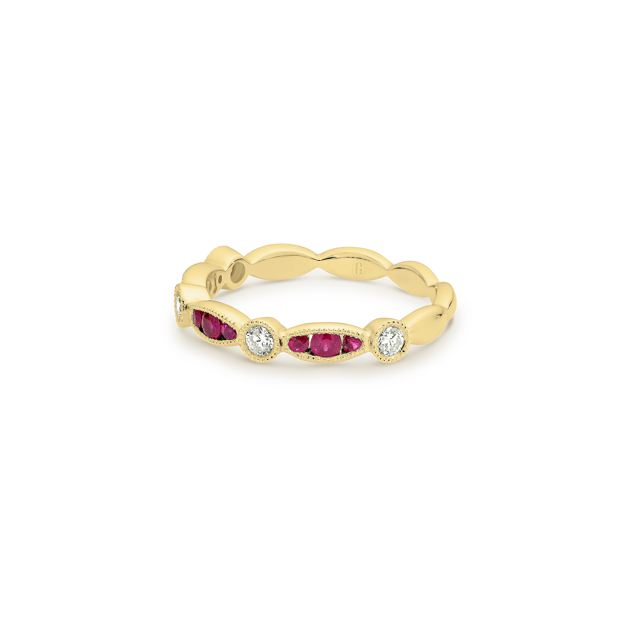 Desire a traditional diamond engagement ring, but still want a glorious flash of colour? This art-deco inspired ruby and diamond half eternity band is the perfect solution! The alternating round and marquise bezel settings is populated with brilliant diamonds and natural deep red rubies, finished off with a classic milgrain setting. Extra special in the middle of a diamond eternity ring stack!