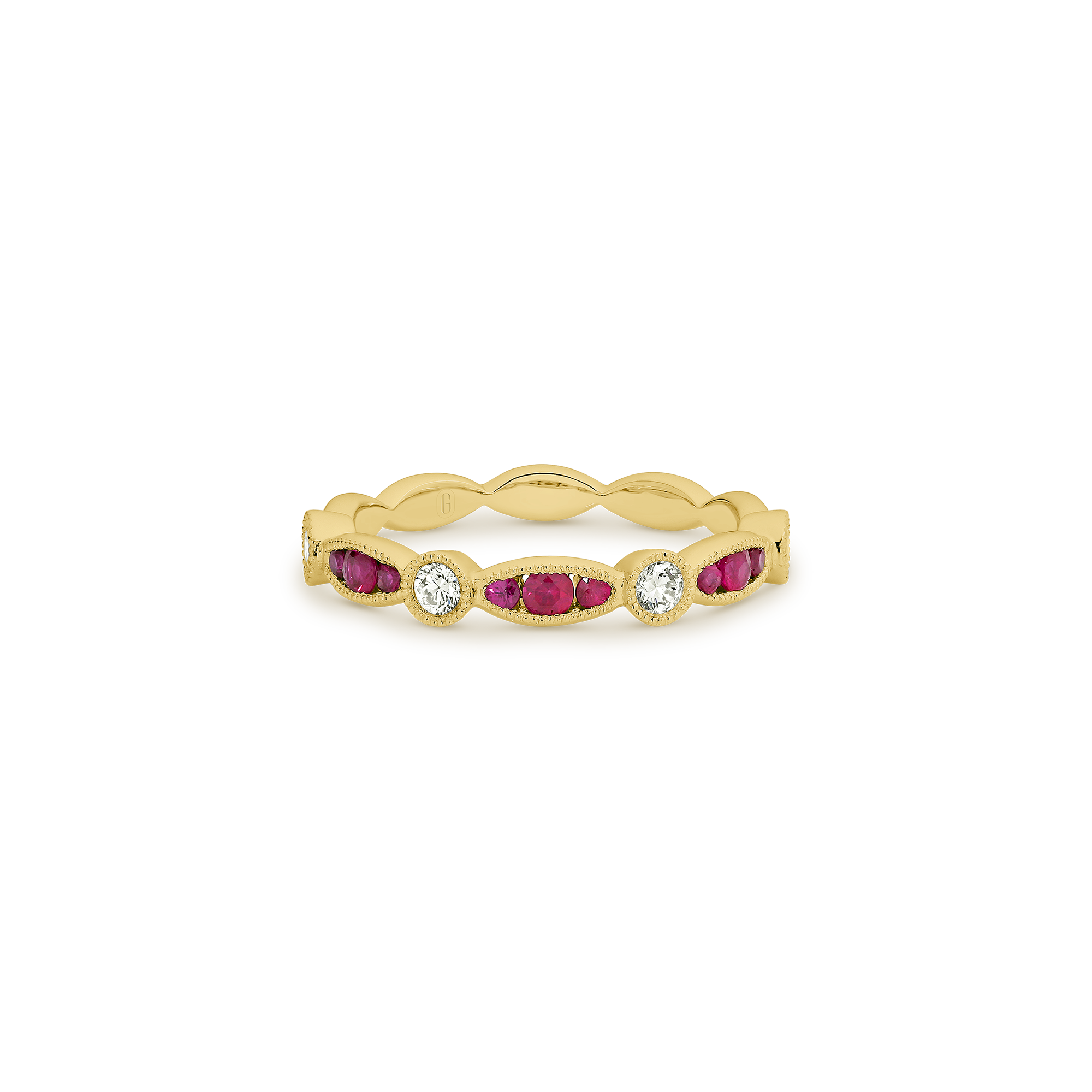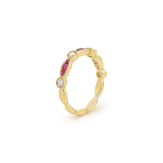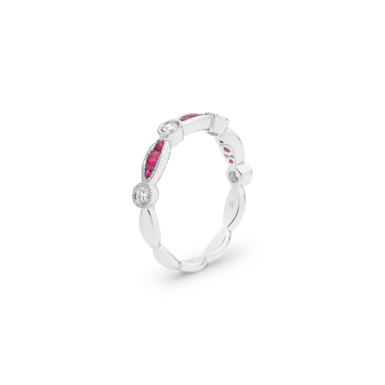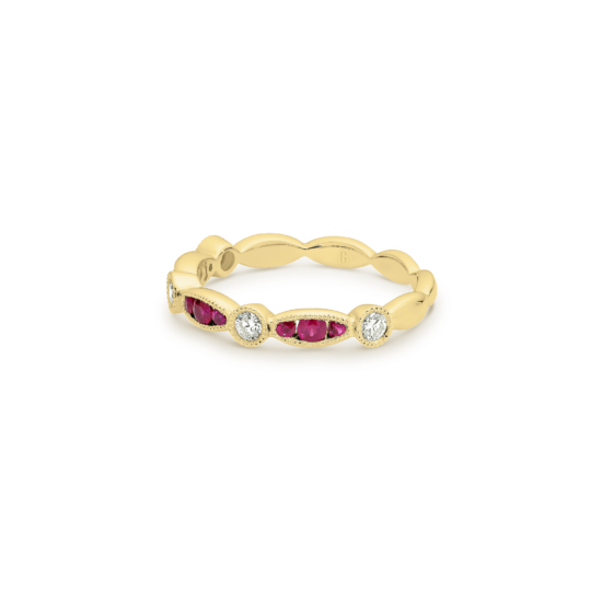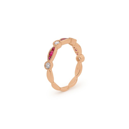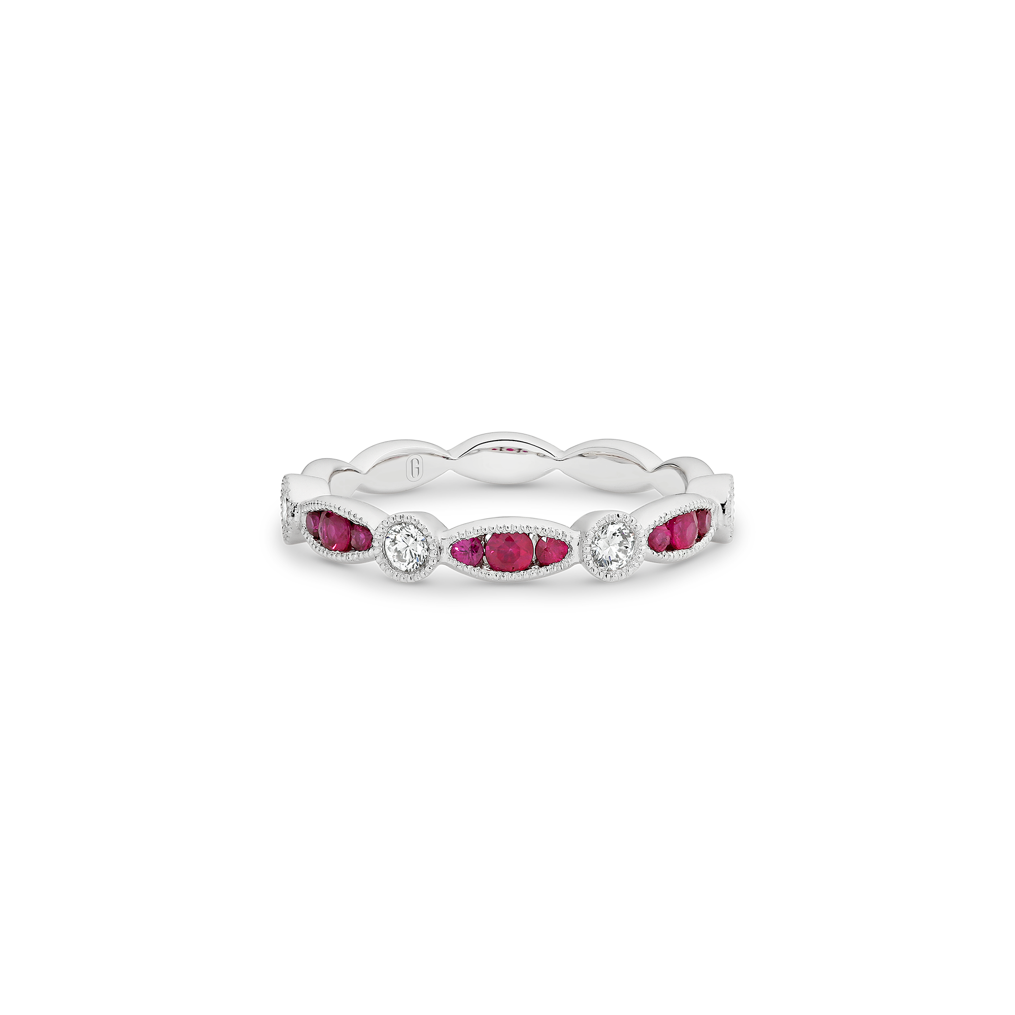 Desire a traditional diamond engagement ring, but still want a glorious flash of colour? This art-deco inspired ruby and diamond half eternity band is the perfect solution! The alternating round and marquise bezel settings is populated with brilliant diamonds and natural deep red rubies, finished off with a classic milgrain setting. Extra special in the middle of a diamond eternity ring stack!