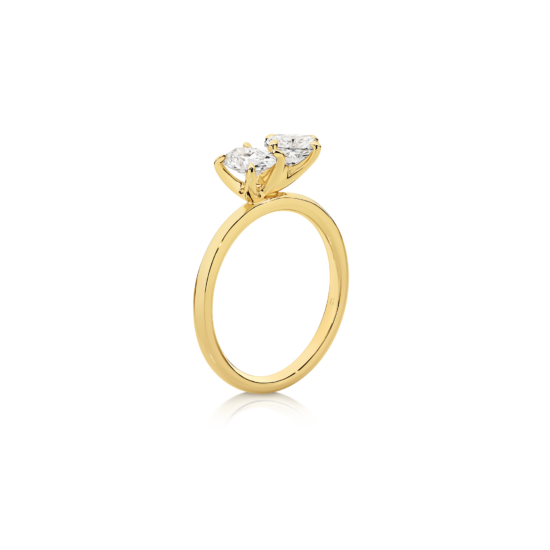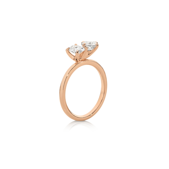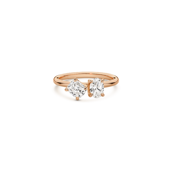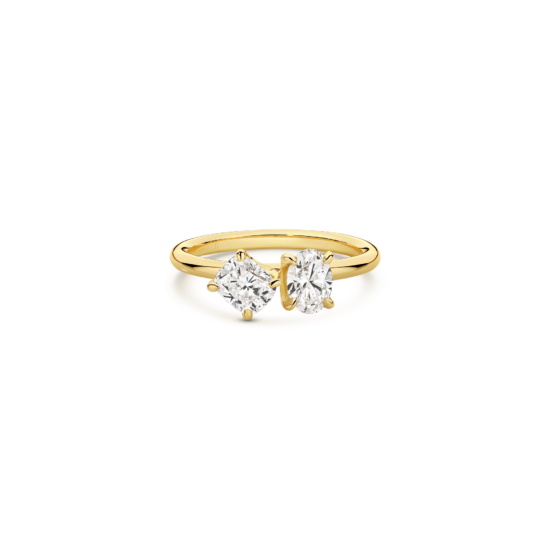 Embrace the beauty of contrast with this exceptional ring, featuring an oval cut diamond and a cushion cut diamond set on a sleek solitaire band. The pairing of these two distinct diamond shapes creates a modern, sophisticated design that catches the eye from every angle. This ring beautifully symbolizes the union of two lives, making it a perfect choice for those seeking a unique and meaningful expression of love.