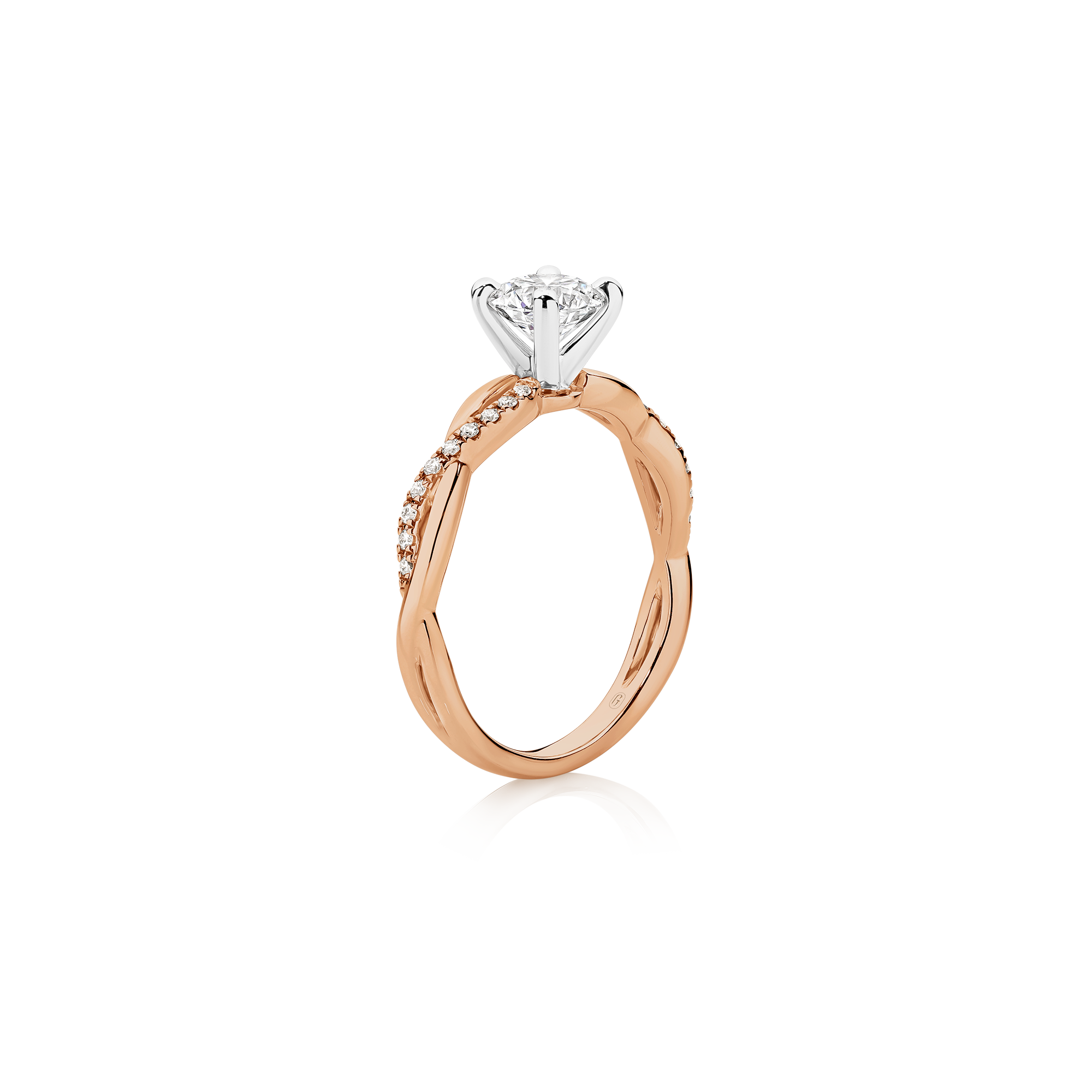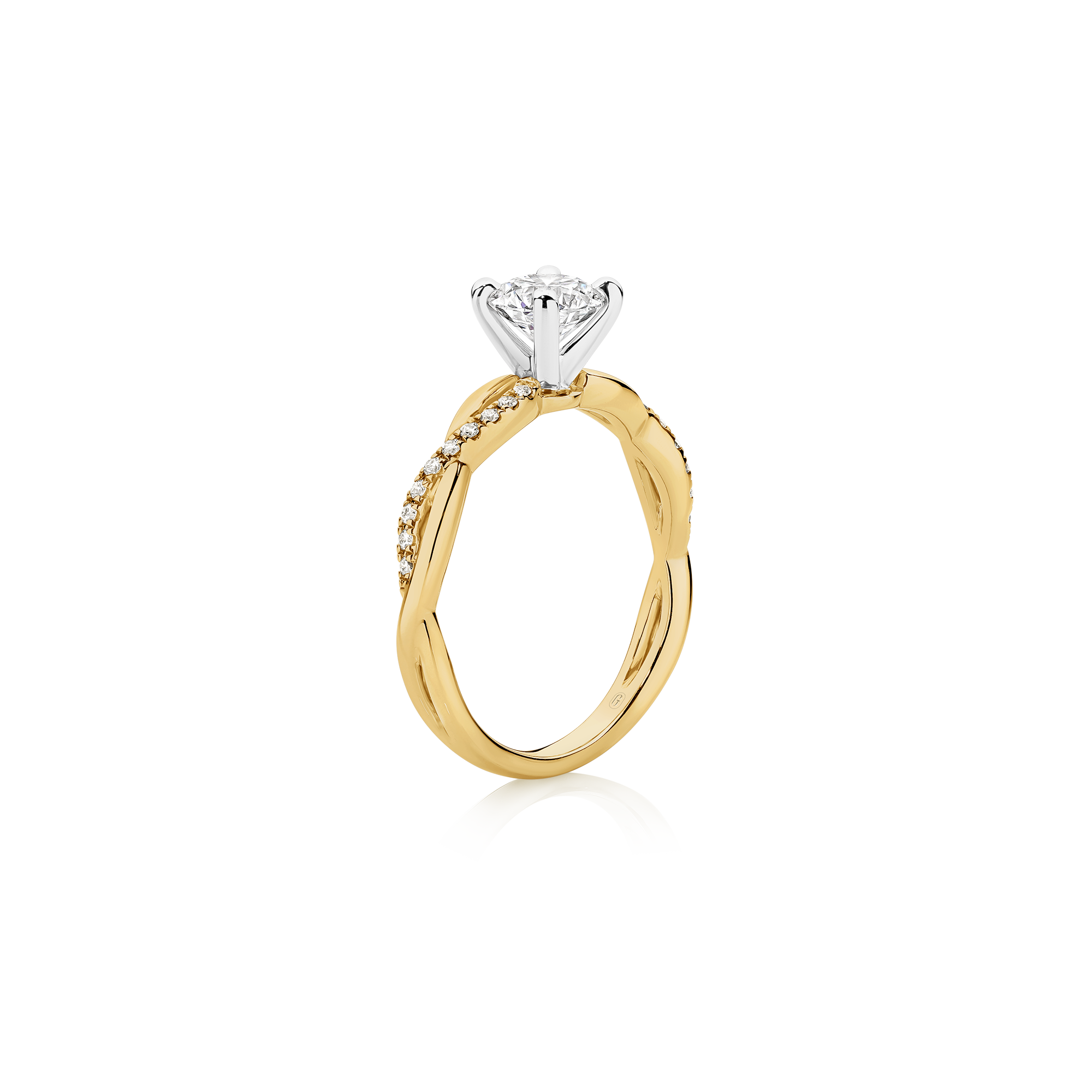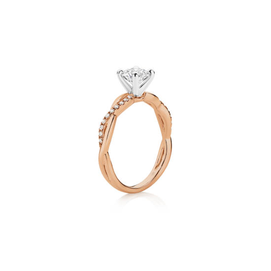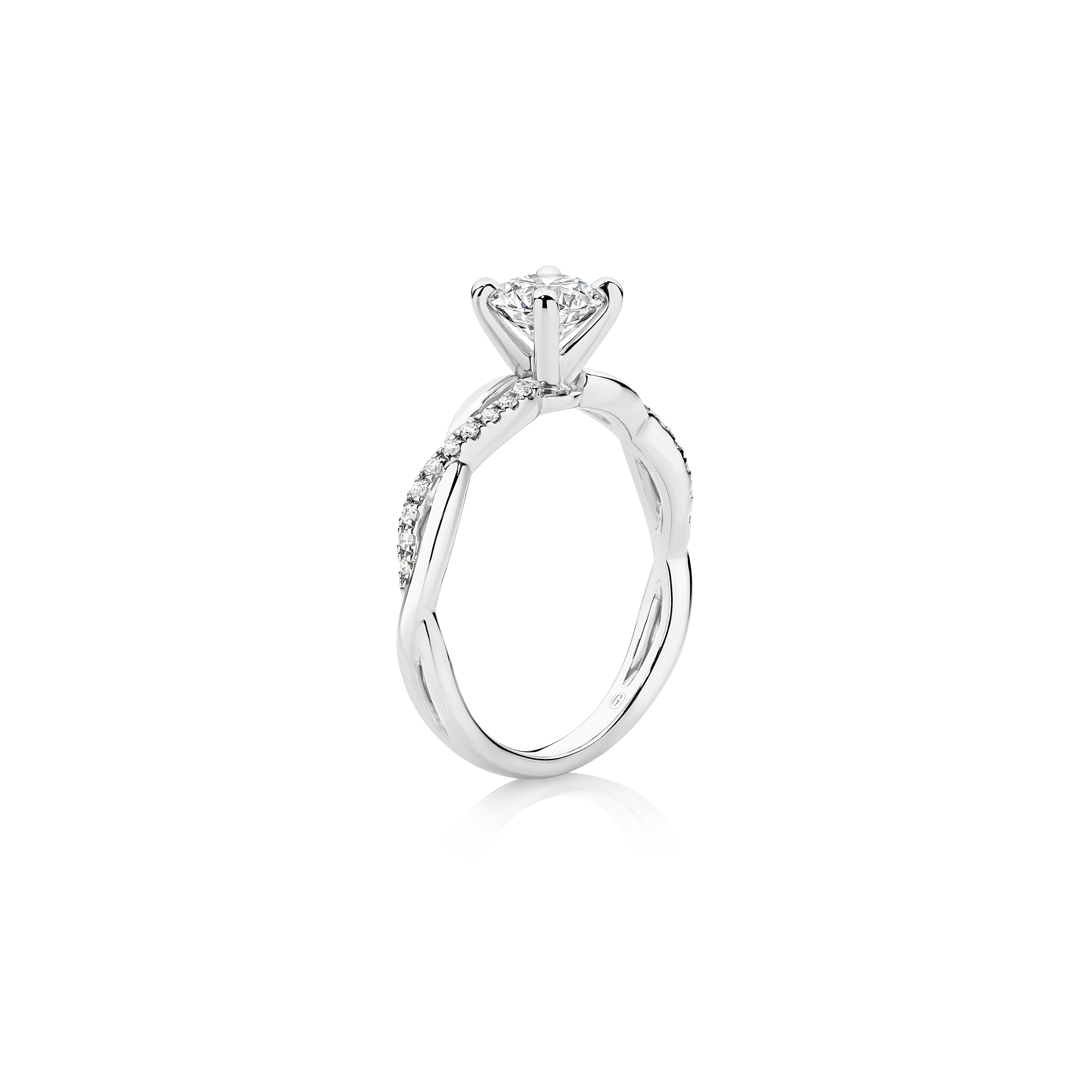 Indulge in the perfect balance of timeless beauty and modern elegance. At its heart lies a brilliant round diamond, radiating light and brilliance. The band features a simple, twisted design, offering a sleek, understated look that lets the diamond take centre stage.