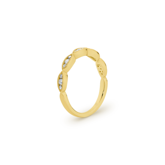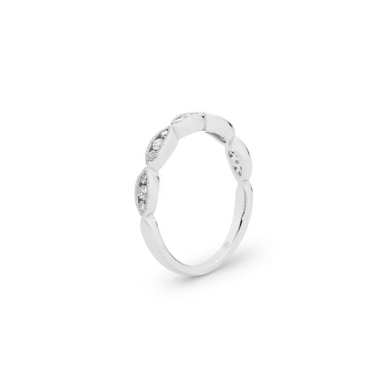Simple, yet oh-so effective. This beautifully unique band gives a sense of movement and shine with dazzling round cut diamonds set in a series of marquee-shaped encasements — enhanced with subtle milgrain detailing.