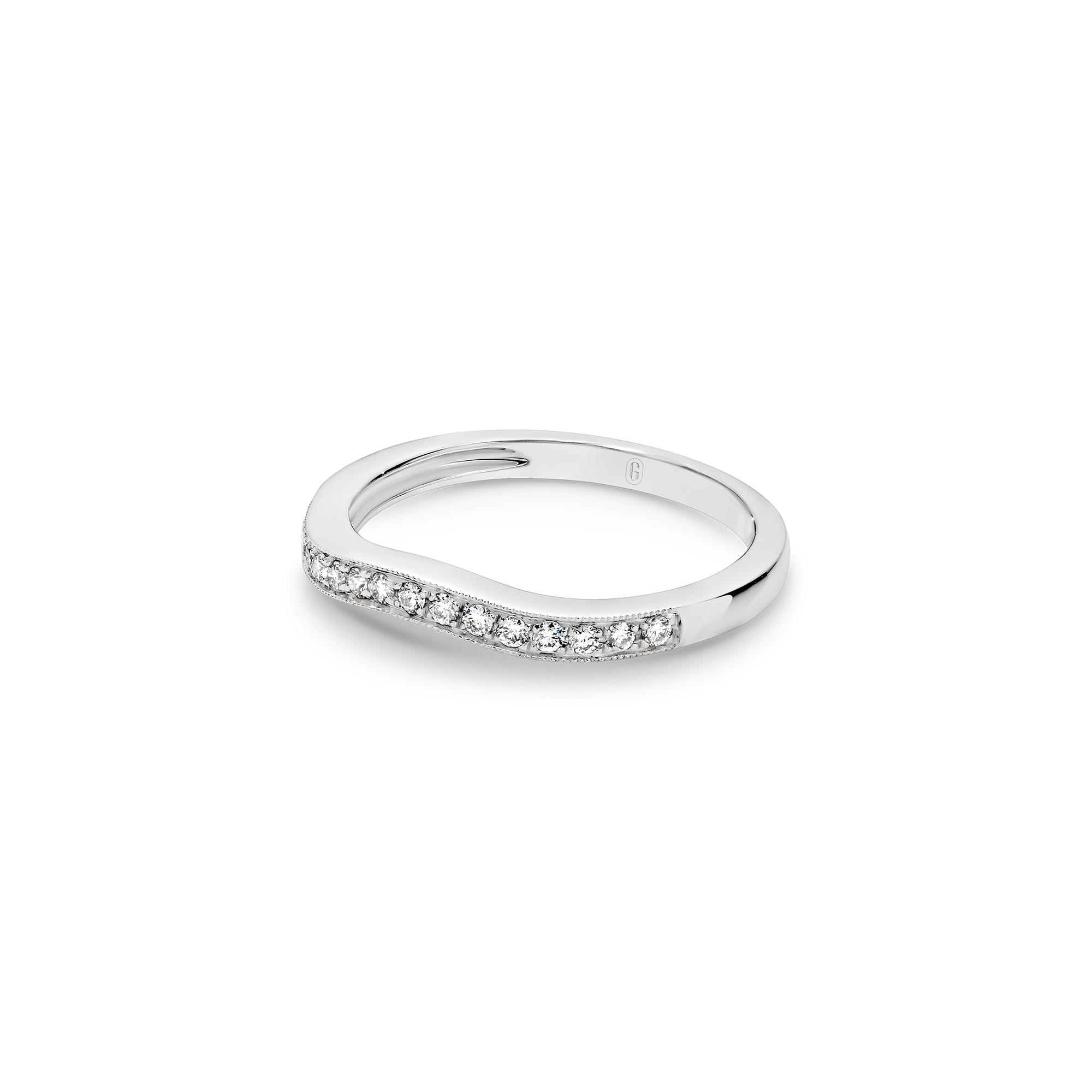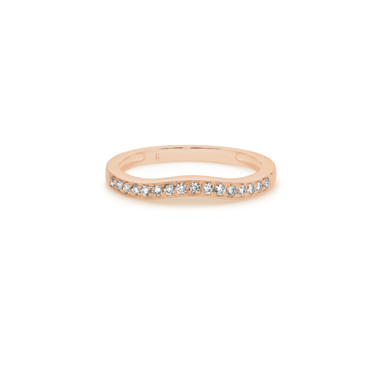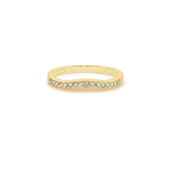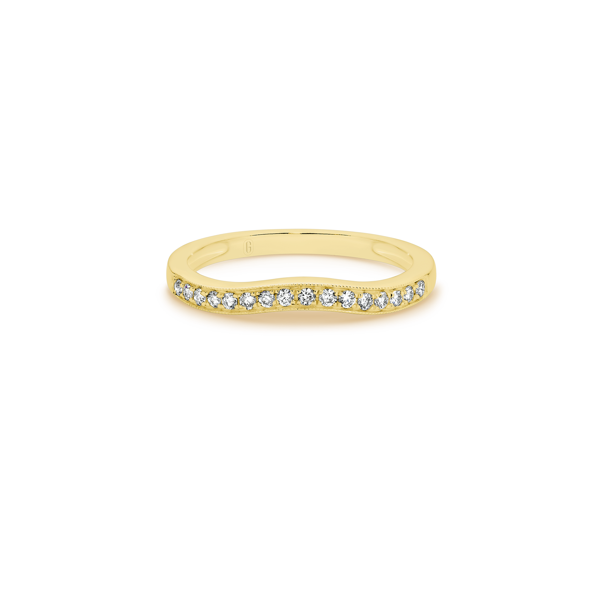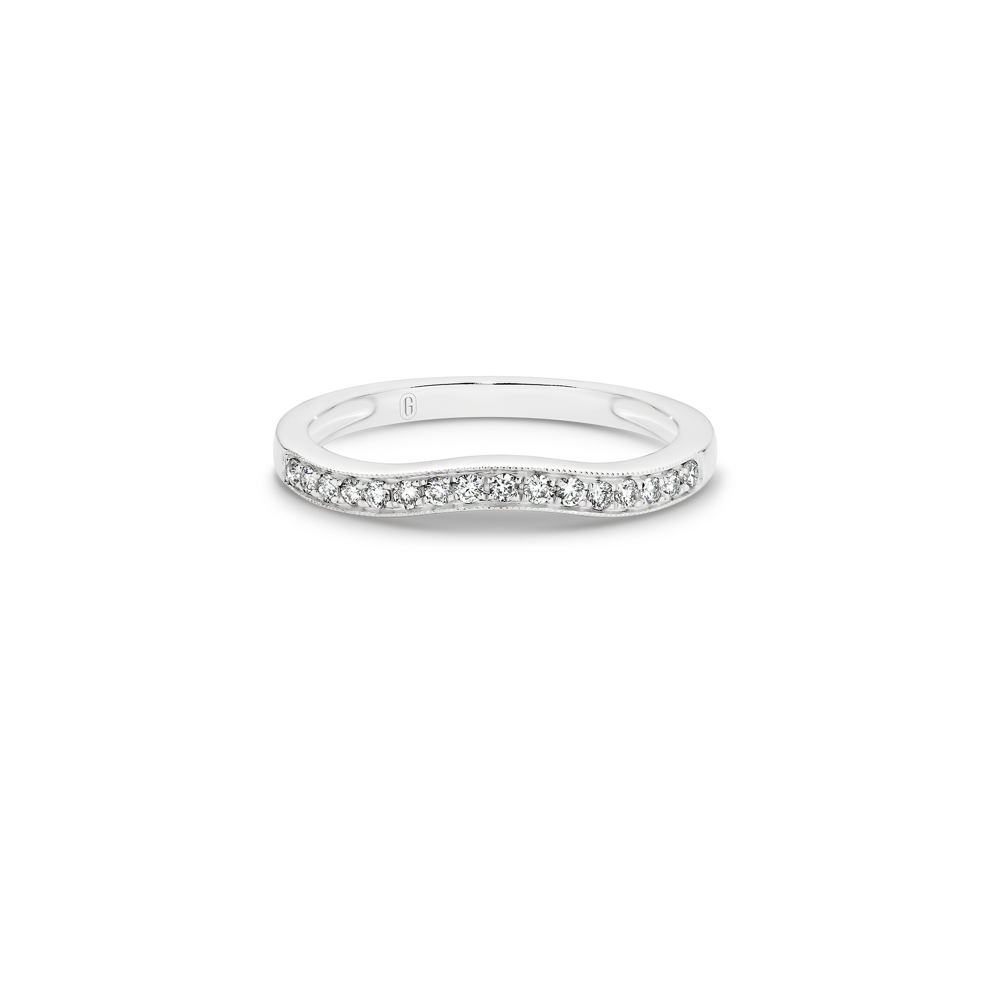 Each dazzling diamond, delicately set in a graceful curve, radiates brilliance, capturing the essence of your shared journey. Enhanced with exquisite milgrain detailing, this masterpiece exudes vintage charm and modern allure, making it the perfect complement to your everlasting union.