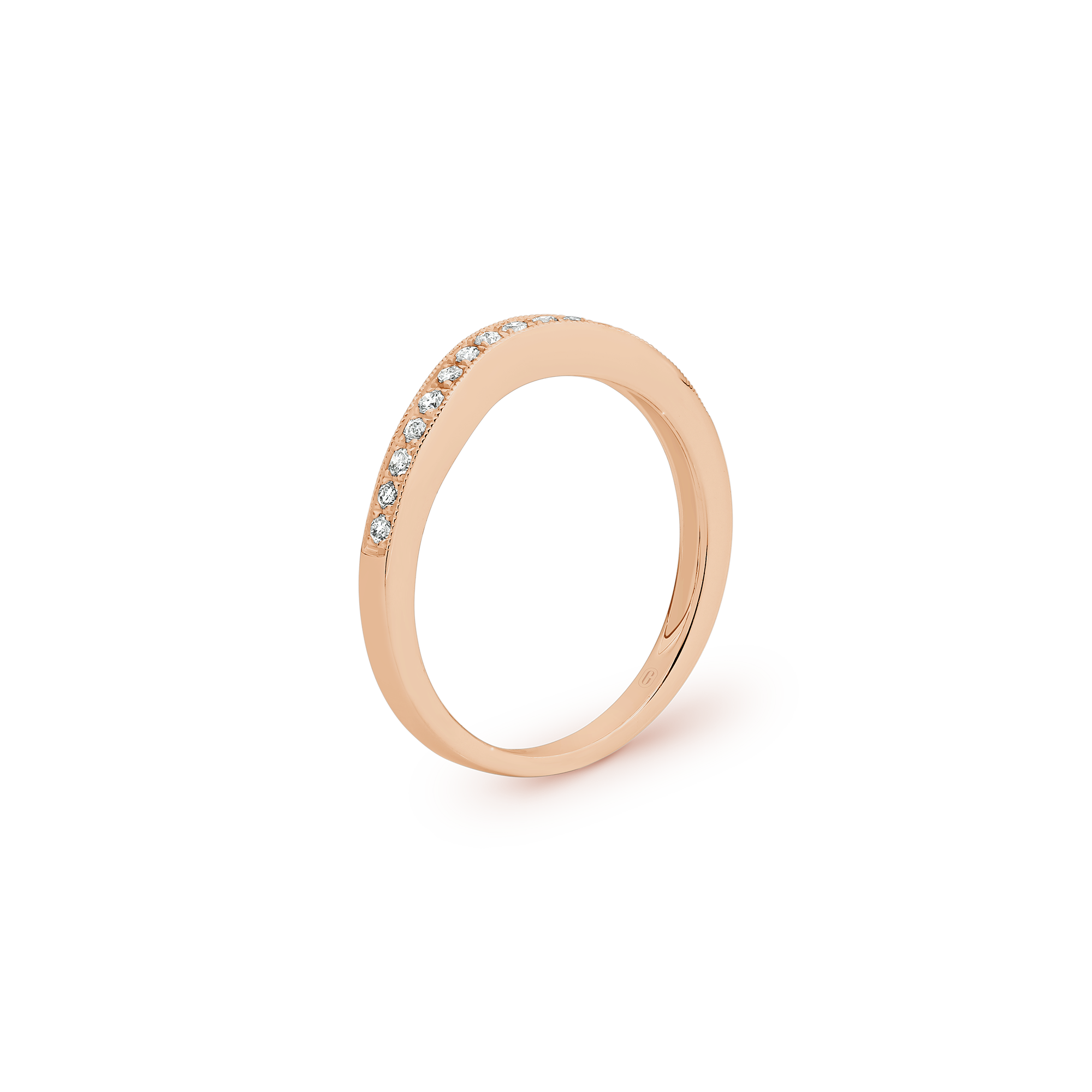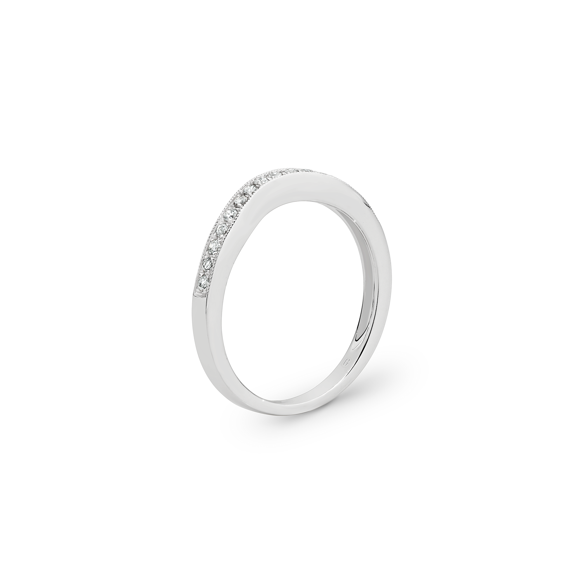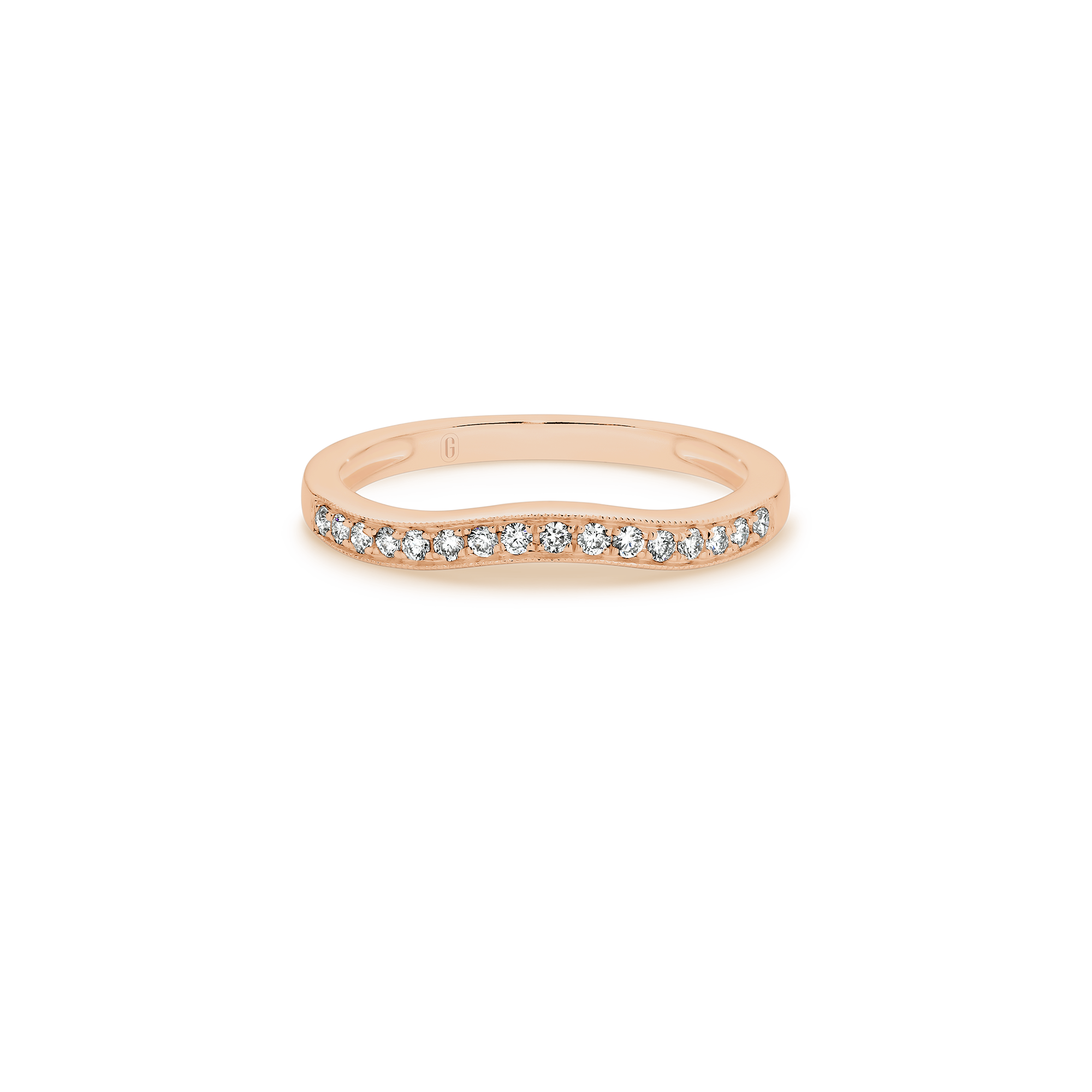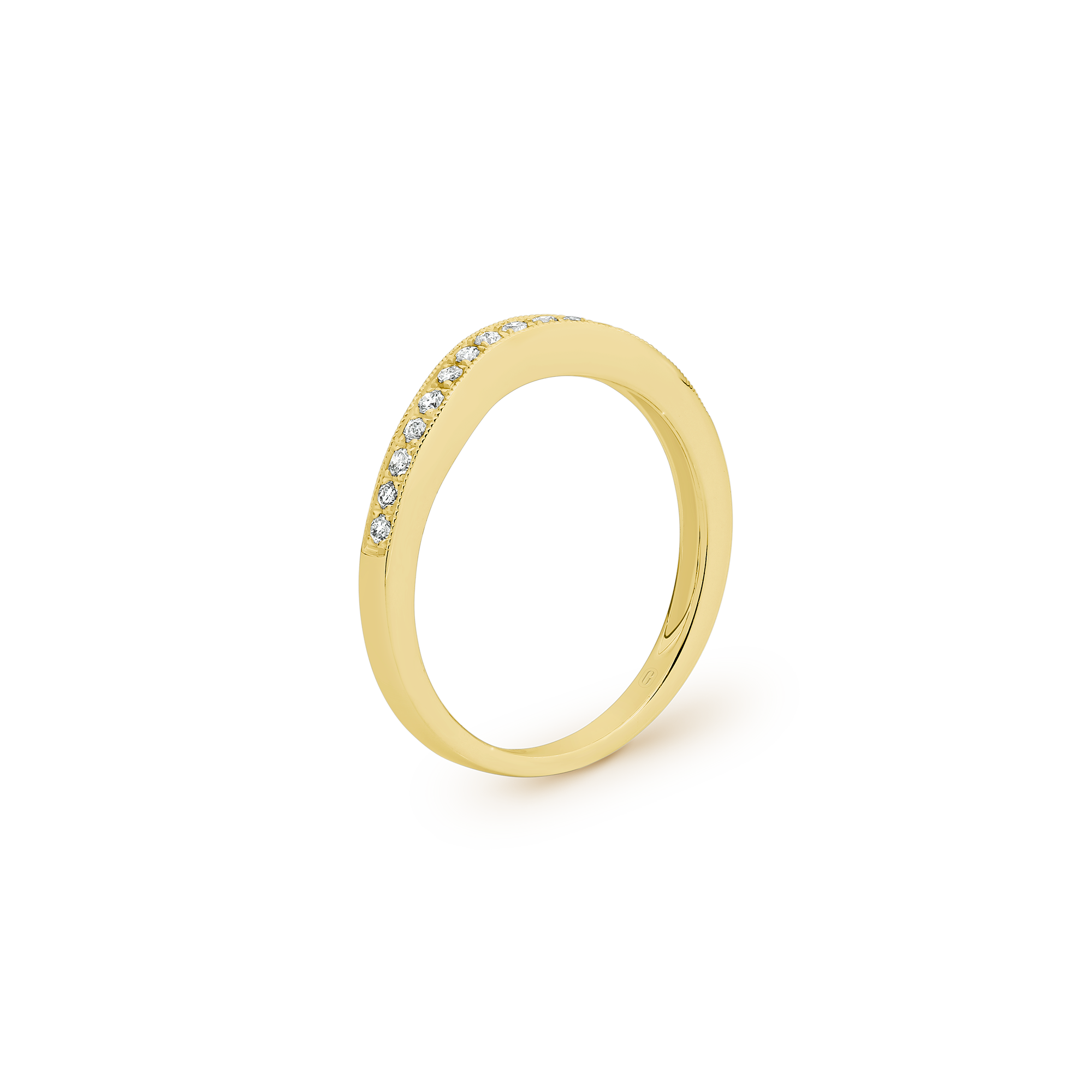 Each dazzling diamond, delicately set in a graceful curve, radiates brilliance, capturing the essence of your shared journey. Enhanced with exquisite milgrain detailing, this masterpiece exudes vintage charm and modern allure, making it the perfect complement to your everlasting union.