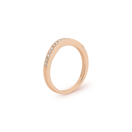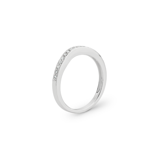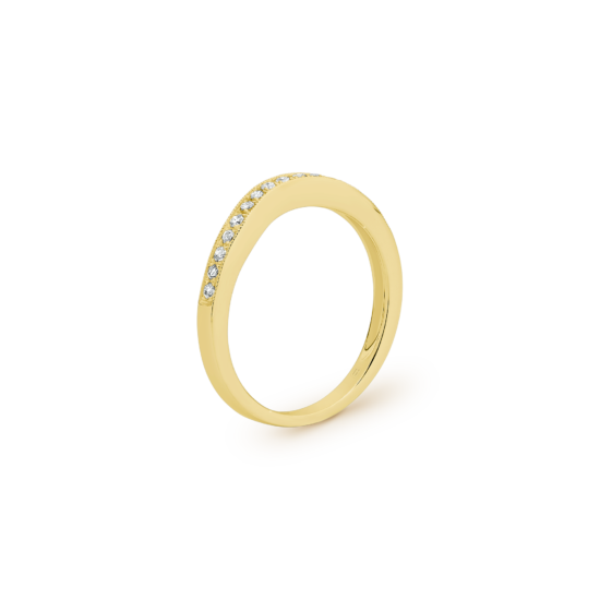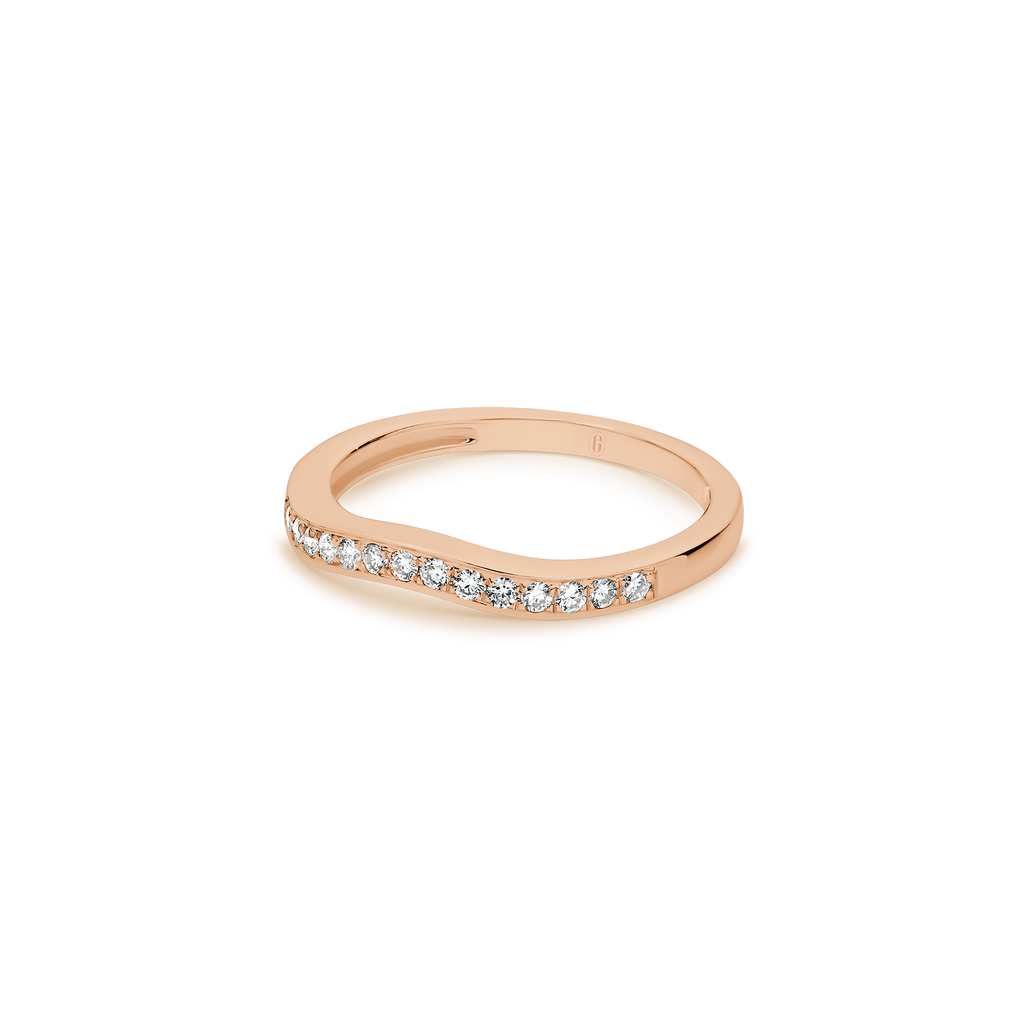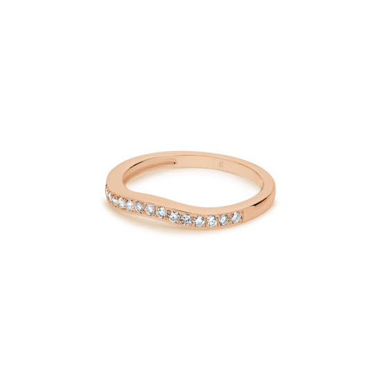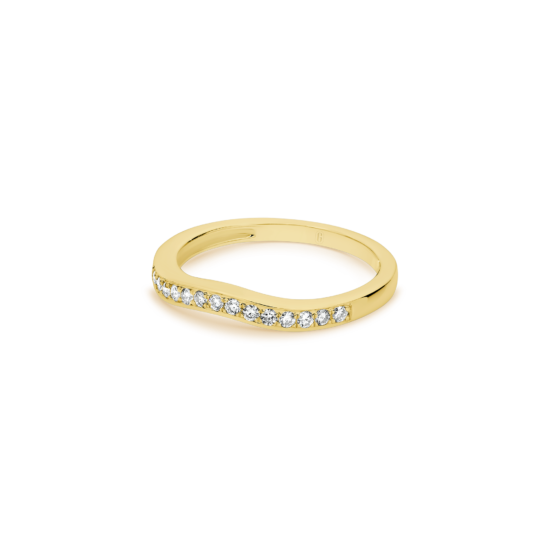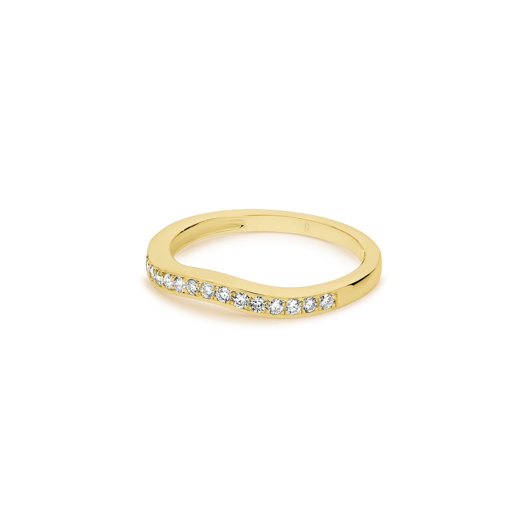 Each dazzling diamond, delicately set in a graceful curve, radiates brilliance, capturing the essence of your shared journey. Enhanced with exquisite milgrain detailing, this masterpiece exudes vintage charm and modern allure, making it the perfect complement to your everlasting union.