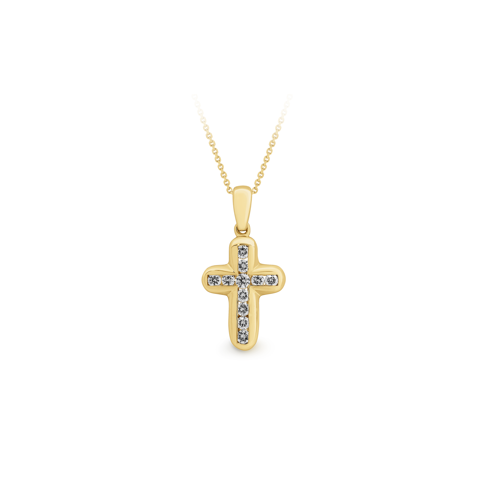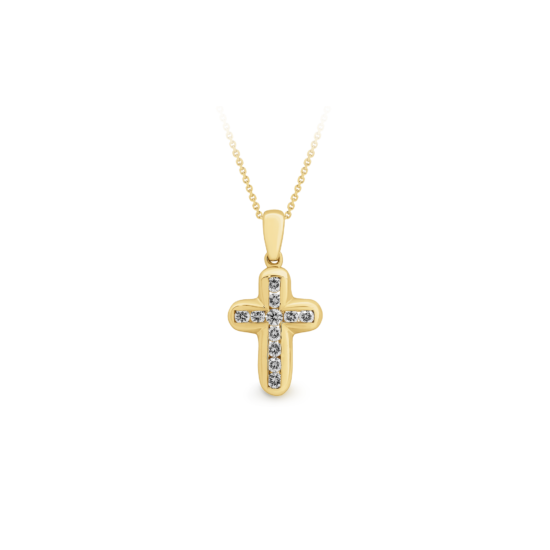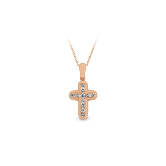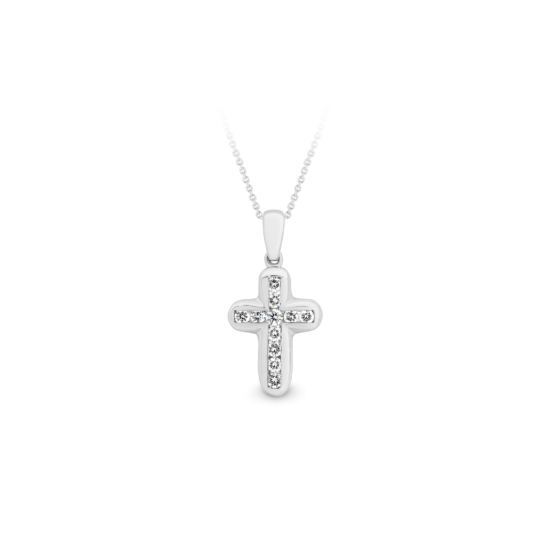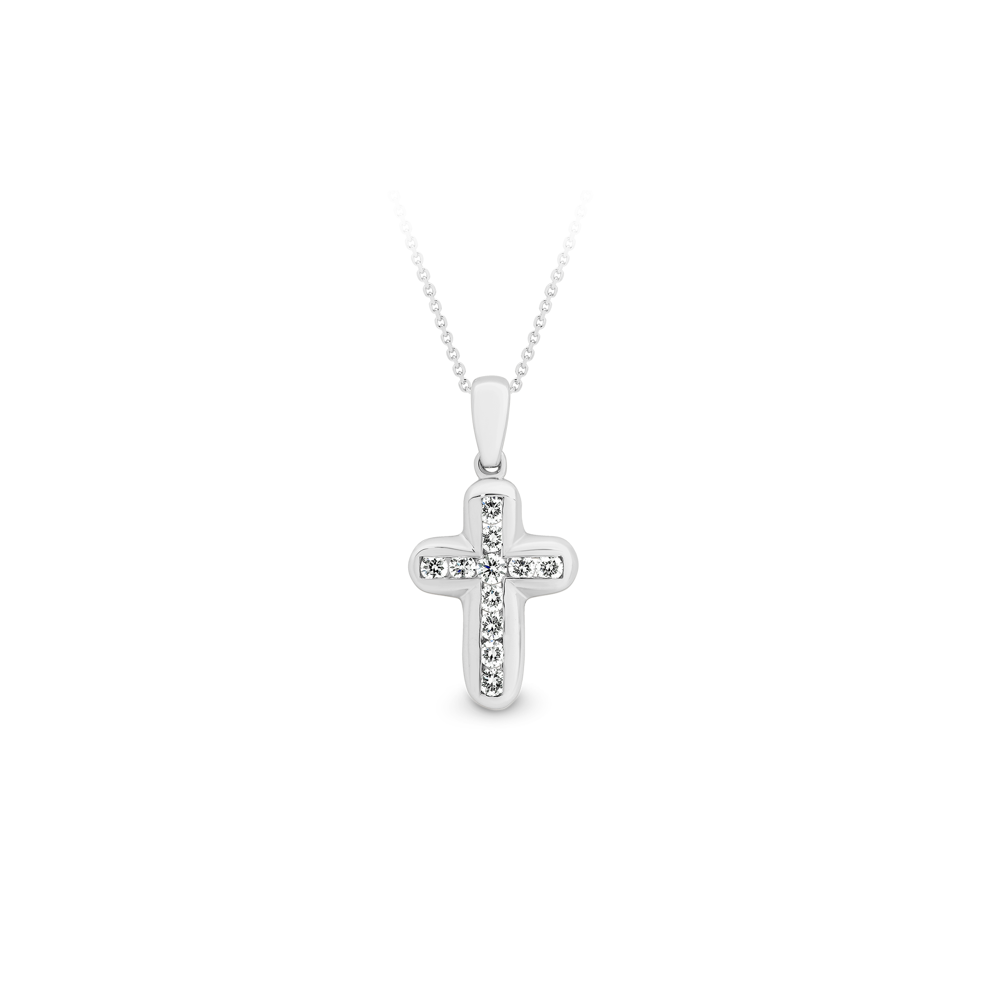 Soft rounded corners crafted from sublime 18k gold encircle 11 brilliant round cut diamonds in a bezel setting to create a petite and plush cross pendant that dazzles. The perfect Christening cross!