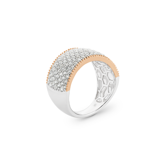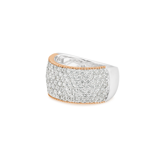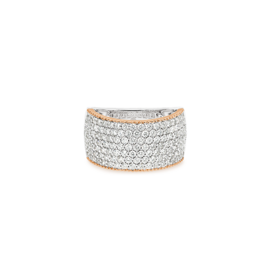 We’re obsessed with this breathtaking statement ring that is at once intricate and imposing. Fitting seamlessly on the finger to create a statement that demands attention. 129 uninterrupted round brilliant cut diamonds in a micro-pavé setting create a luminous sheen that is hard to look away from! Painstakingly crafted with the finest detail in mind. Even more exquisite with a border of milgrain rose or yellow gold – available on request!