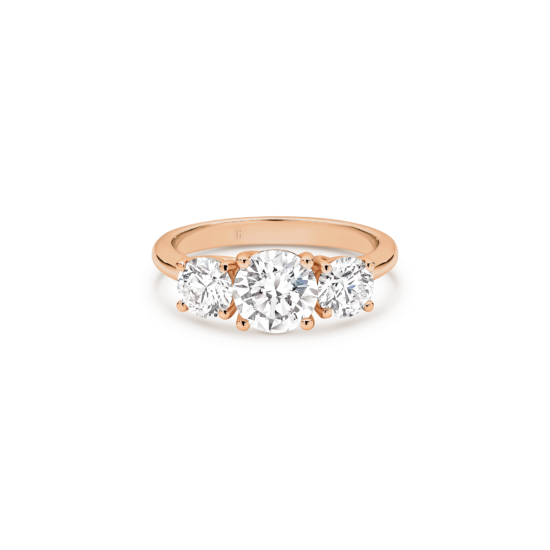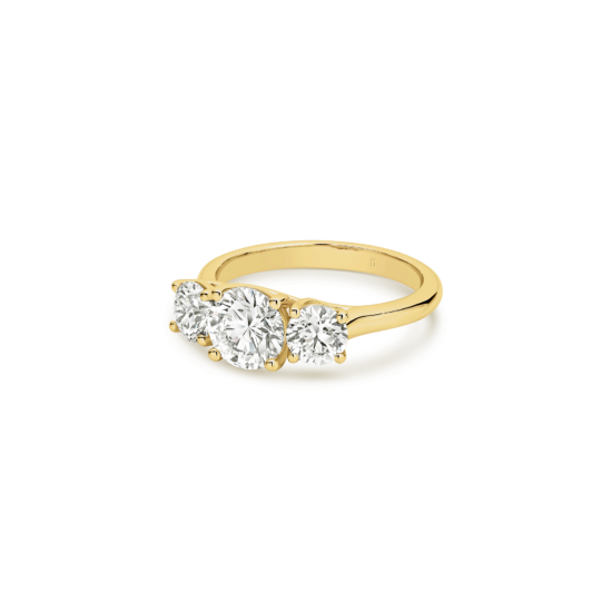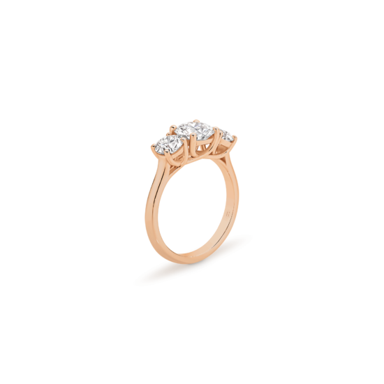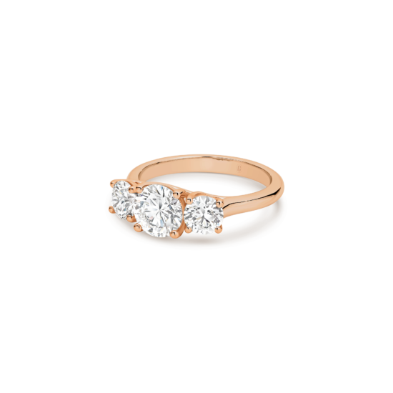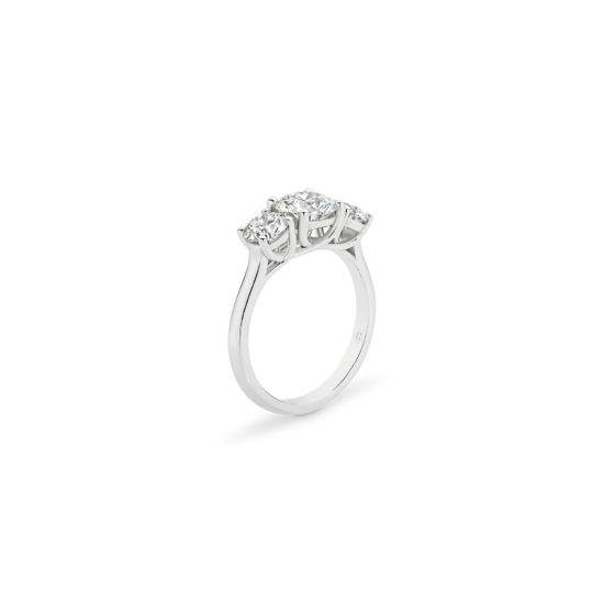 Nothing says ‘I’m engaged’ quite like this round cut trilogy ring! Defined by simplicity and sophistication, the no-frills design will never go out of style. The spectacular centre diamond is flanked by matching round-cut diamond side stones. Elegantly draping the finger in a brilliant display of sparkle, the delicate proportions of this masterfully crafted ring create a sense of balance no matter what carat size you choose.
