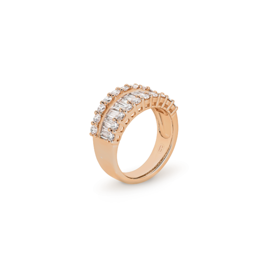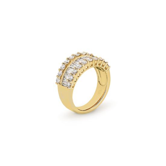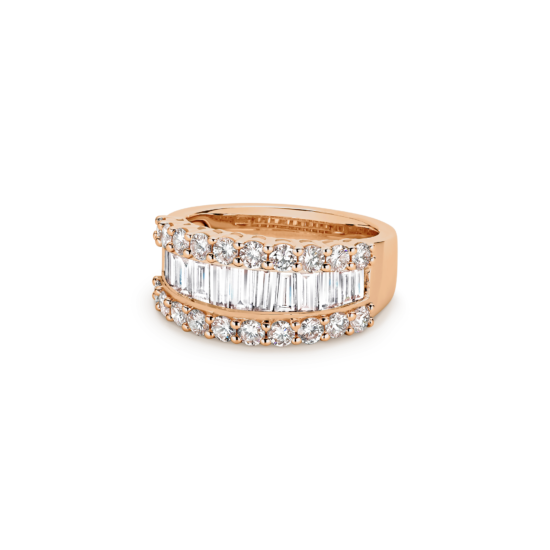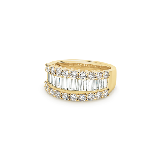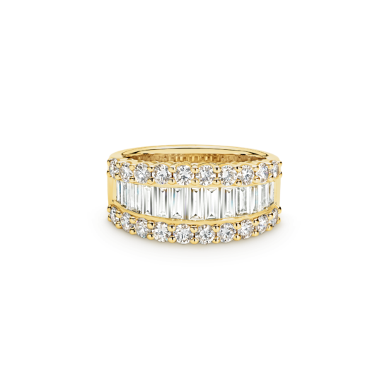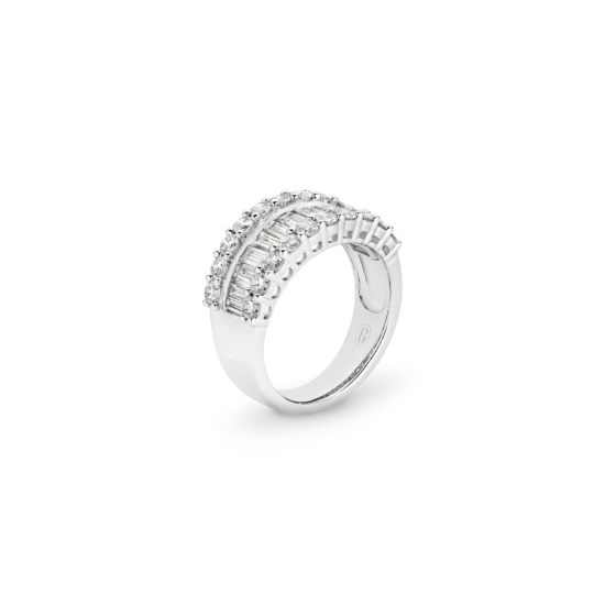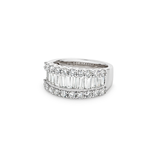 A masterpiece designed to catch the light and make it dance! This blindingly bright ring contrasts two of the most spectacular diamond cuts to make a powerful statement. A row of beautiful baguettes in an uninterrupted channel setting is ensconced between two rows of brilliant round cut diamonds. Pure magic!