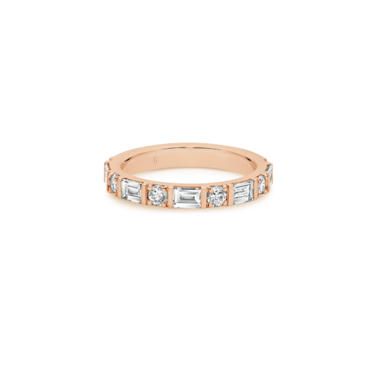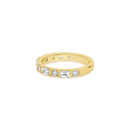 Can’t decide which diamond shape you love more? You don’t have to! Just under 1 carat of baguette and brilliant round cut diamonds make the most of the real estate on this sensational band.