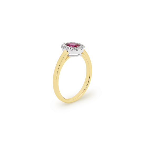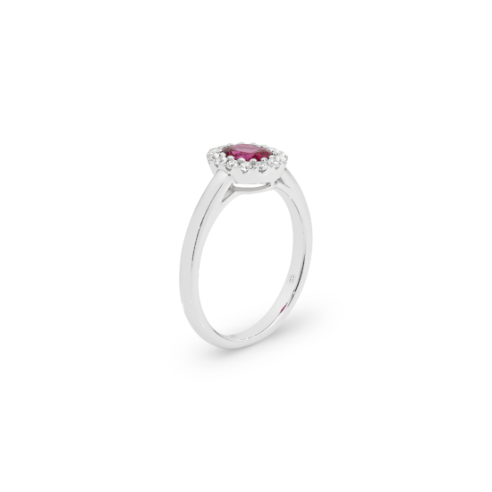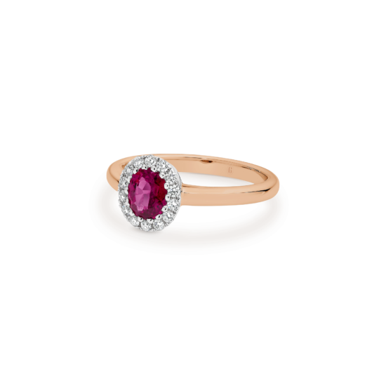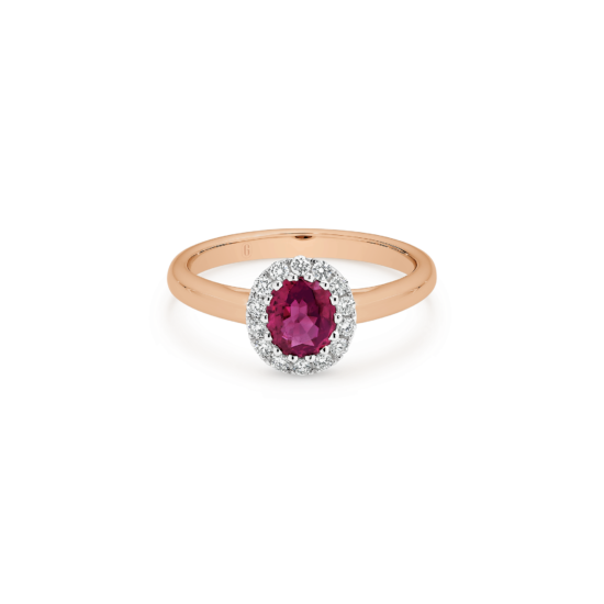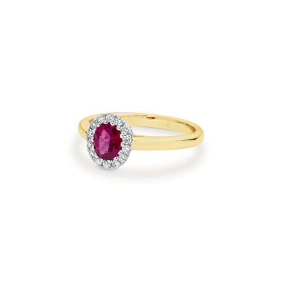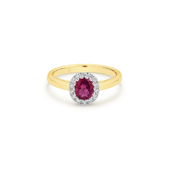 Simple, but still packing a beautiful punch, this ruby and diamond ring is a bright idea for anyone born in March, looking to celebrate love, or wishing to add a pop of colour to their style! An oval cut ruby is the star of the show, ensconced in a halo of glittering round cut diamonds on a polished 18k gold band.