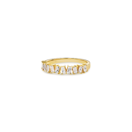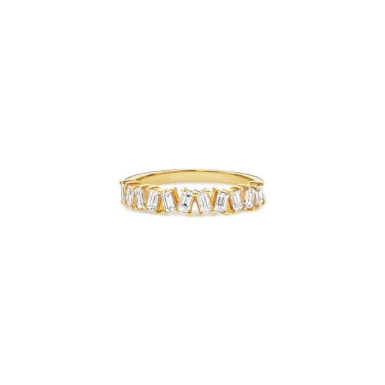 Crafted with precision and passion, this diamond band is designed to embrace your individuality. The slanted baguette cut diamonds in this band create a dynamic and contemporary visual appeal. Each diamond is carefully angled to form a harmonious alignment, resulting in a unique and eye-catching design. The baguette cut, known for its sleek and elongated shape, brings a touch of modernity to this classic piece.