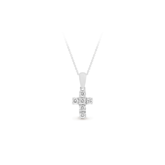 0.20 carats of diamonds adorn this petite cross pendant. The simple lines and claw setting deliver minimalist appeal, while the brilliant round cut diamonds deliver divine dazzle that really draws the eye!