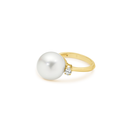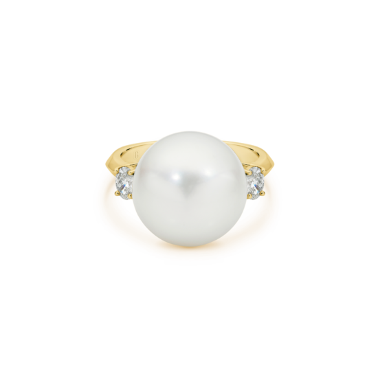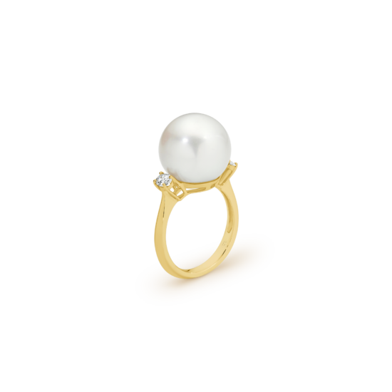 Two round cut diamonds grace the shoulders of a simple 18k gold band, allowing all the focus to stay on the lustrous white South Sea Pearl at the heart of the design. The diamonds serve to add balance and the slightest hint of sparkle.