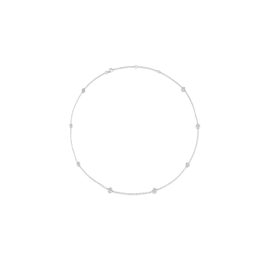 This simple, yet elegant, “By the Yard” necklace is embellished with 16 brilliant round cut diamonds. Each diamond has been set in a solid round 18k gold station in such a way as to resemble a brilliant 4-pointed star, ablaze along the delicate 18k gold chain. A stellar choice for day or night!