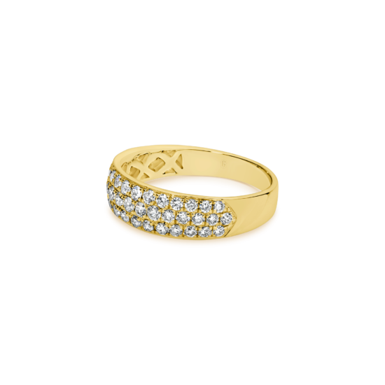 Our 18k gold three-row diamond band features intricately set brilliant round cut diamonds in a micro-pavé setting that delivers major flare! A must for those looking for a bold ring that still retains a delicate aesthetic.