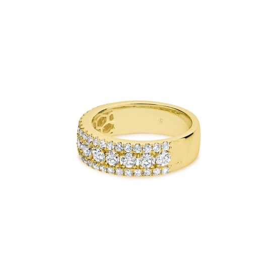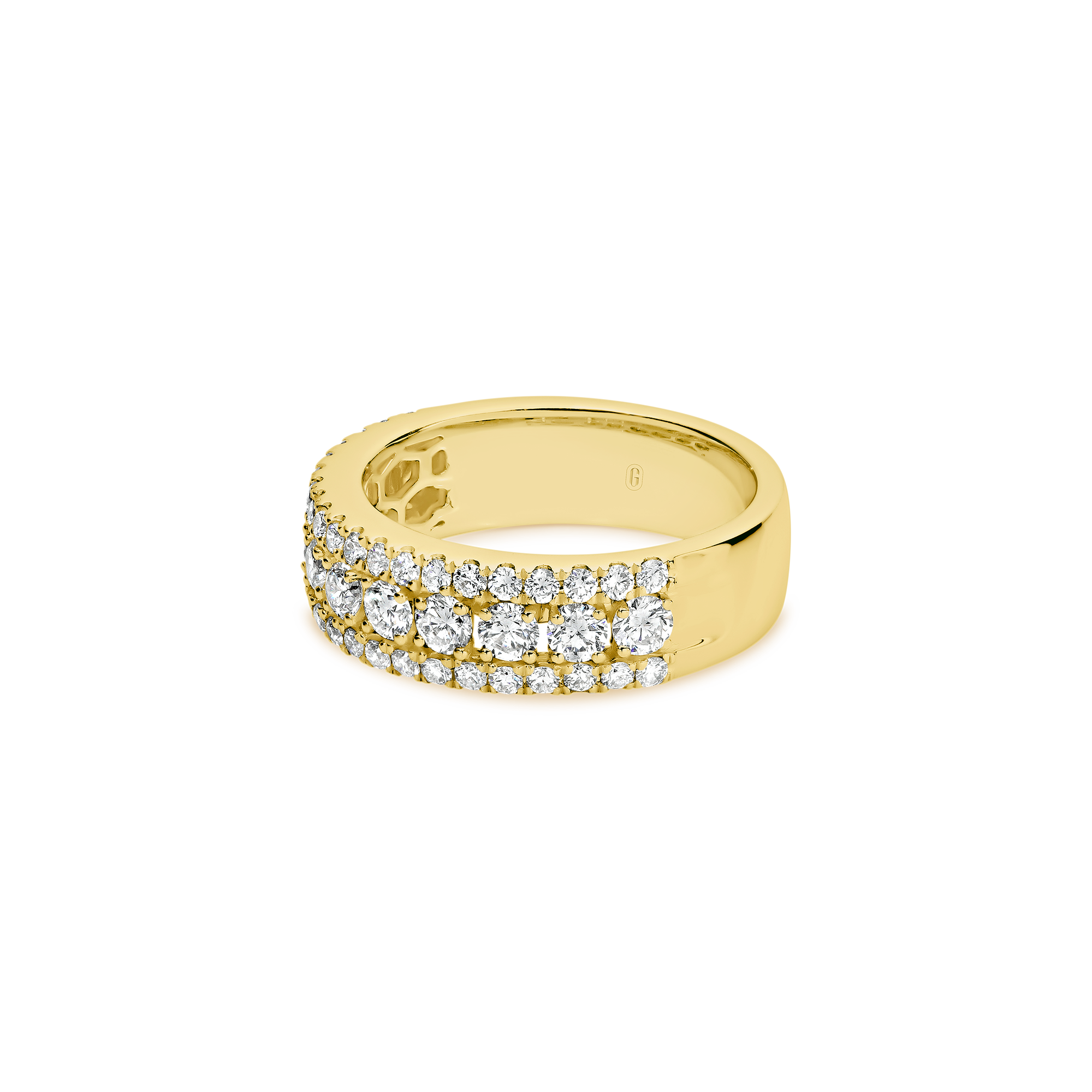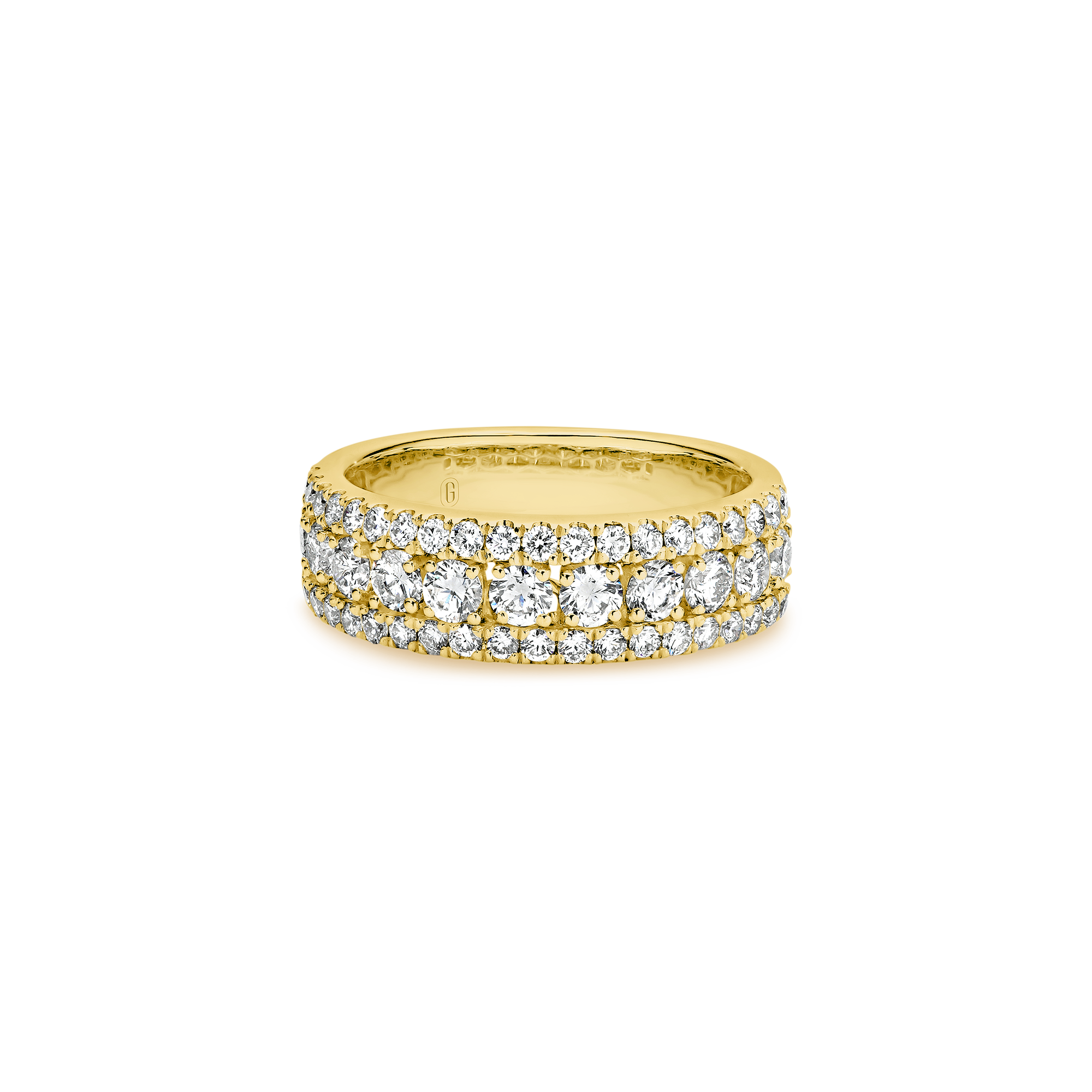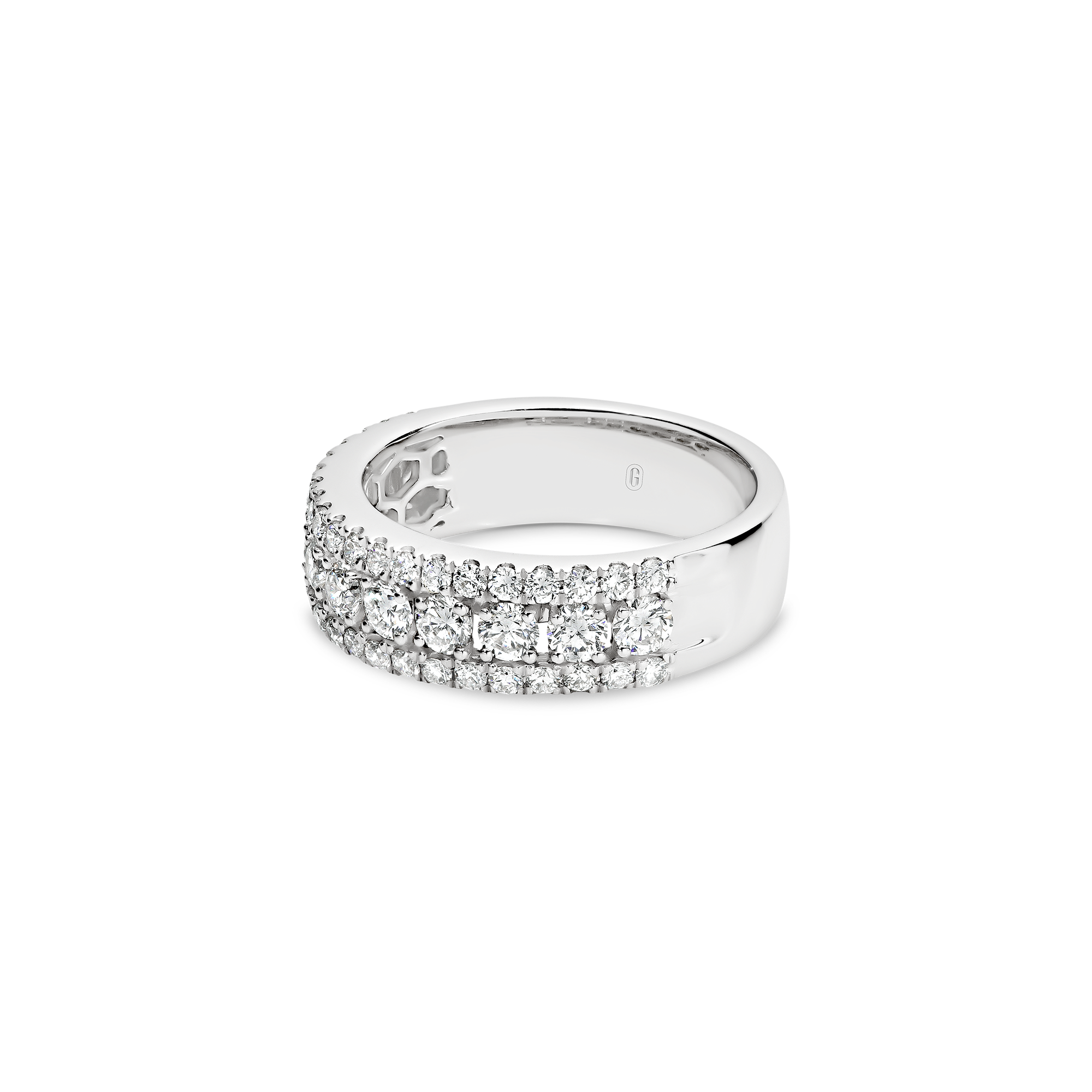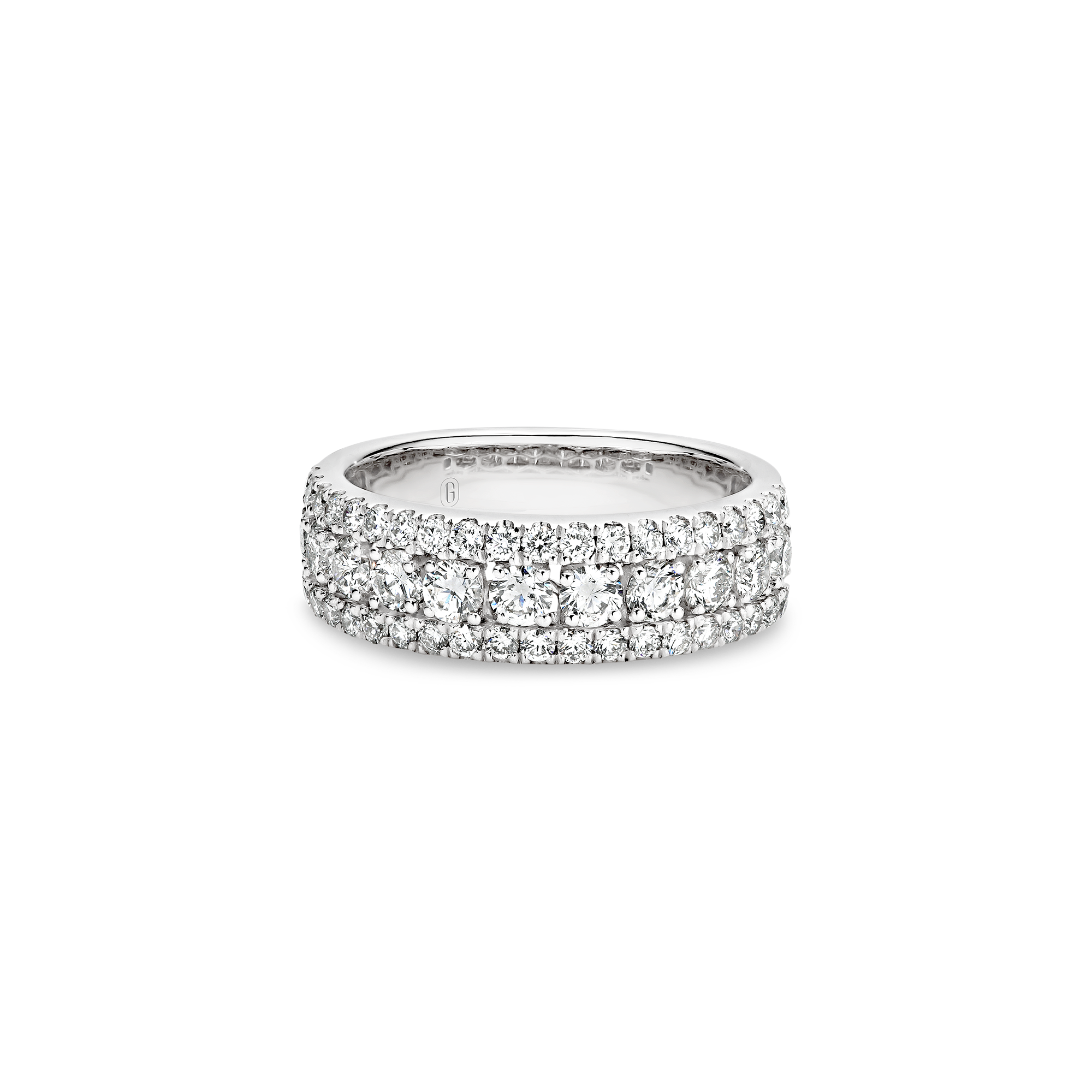 An absolute classic! Presenting a triple row of brilliant round cut diamonds in a claw setting, ensconced in your choice of precious metal. Two fine lines of sparkling diamonds frame the larger centre row – creating the illusion of multiple stacked rings, without the movement of individual pieces.