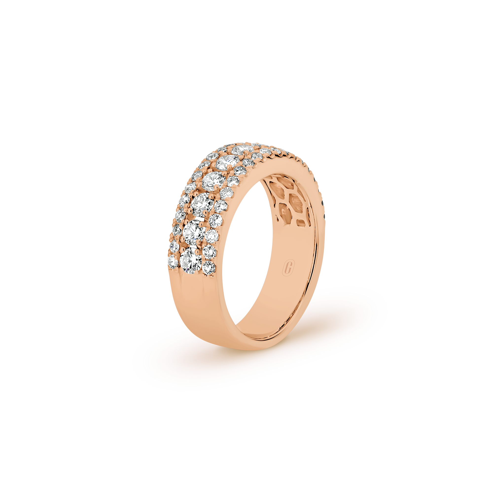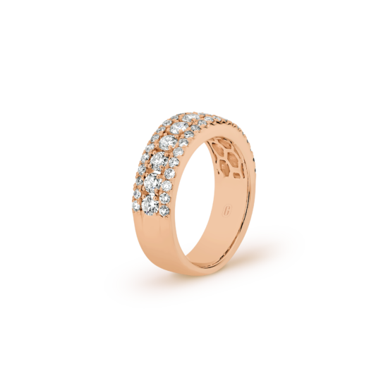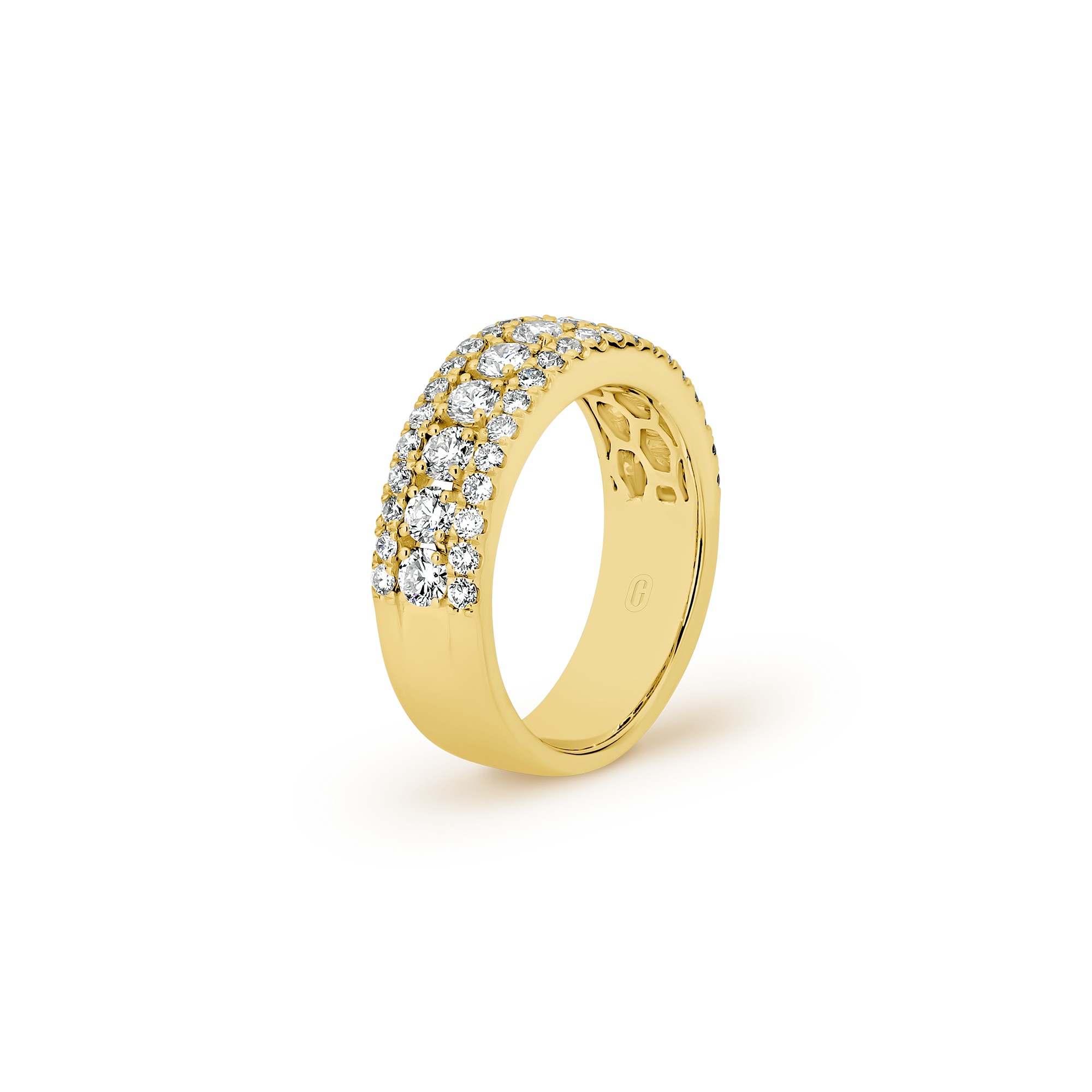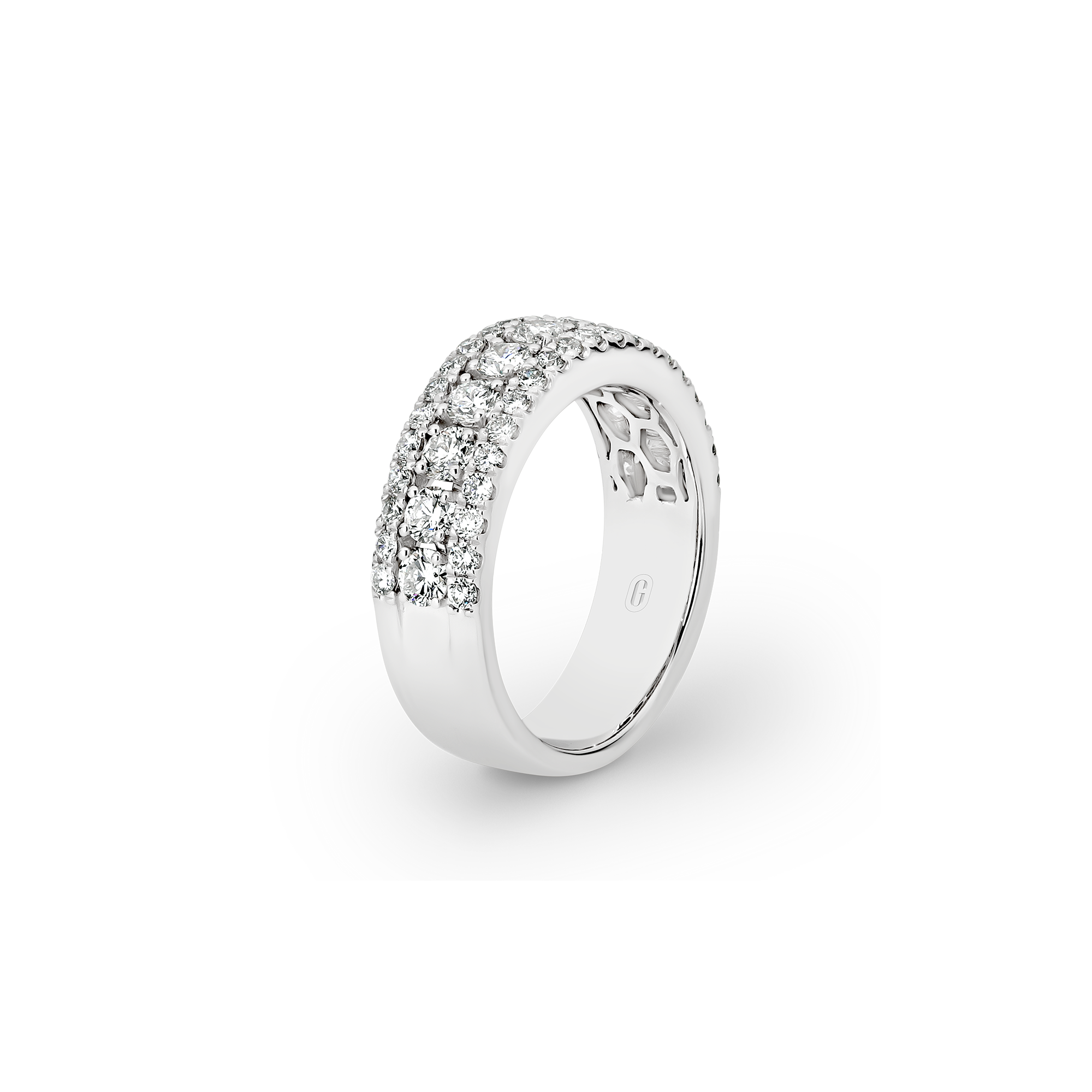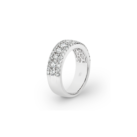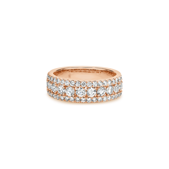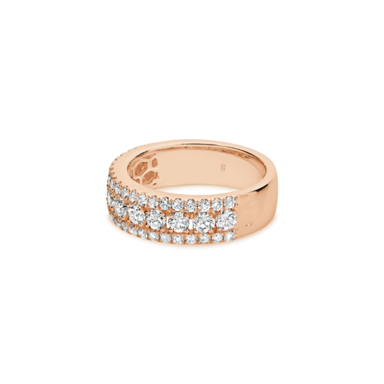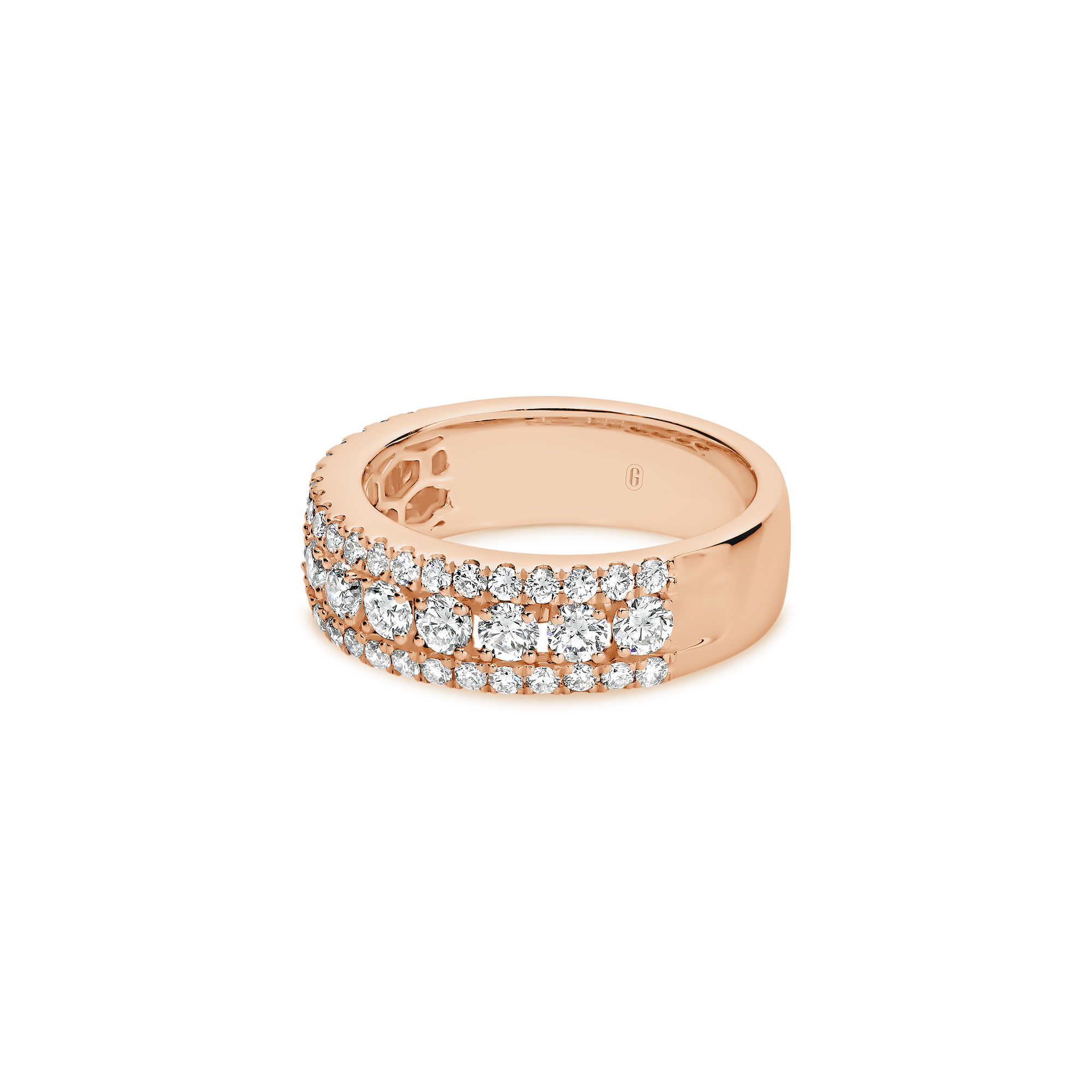 An absolute classic! Presenting a triple row of brilliant round cut diamonds in a claw setting, ensconced in your choice of precious metal. Two fine lines of sparkling diamonds frame the larger centre row – creating the illusion of multiple stacked rings, without the movement of individual pieces.