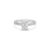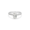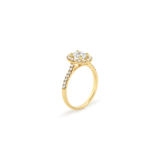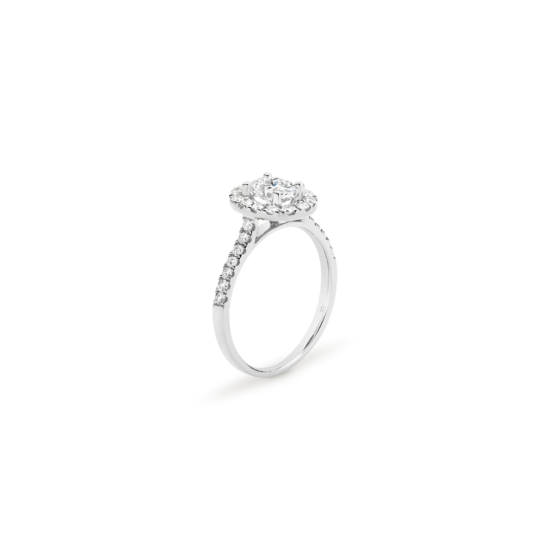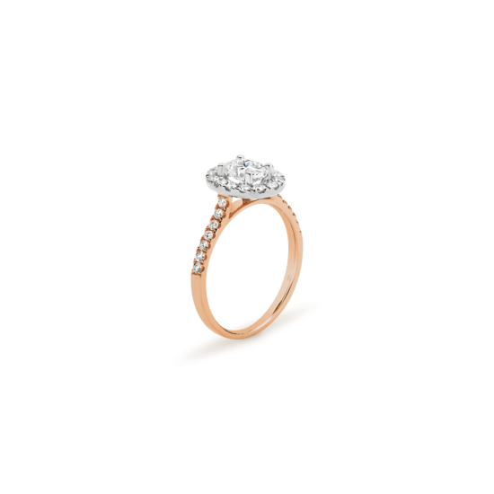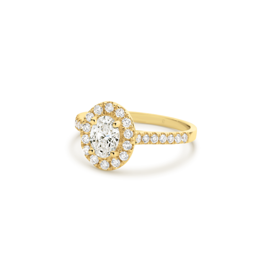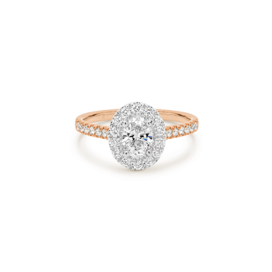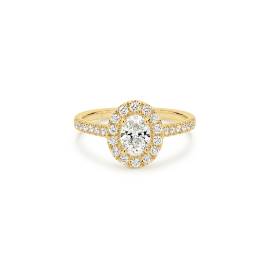 A stunning oval cut diamond engagement ring, crowned with a generous halo of sparkling brilliant round cut diamonds and complimented by a dainty half eternity diamond band. This ring is elegant, classy and timeless, with all the makings of an heirloom to be passed down the generations.