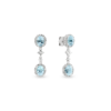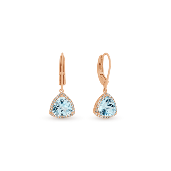 Aquamarines possess a unique glitter that is spectacularly captured by the triangular cut. The rounded triangle shape is further enhanced by a luminous halo of round cut diamonds. This show-stopping design hangs from an 18k gold bail so that the aquamarines dangle prettily just below the earlobe.