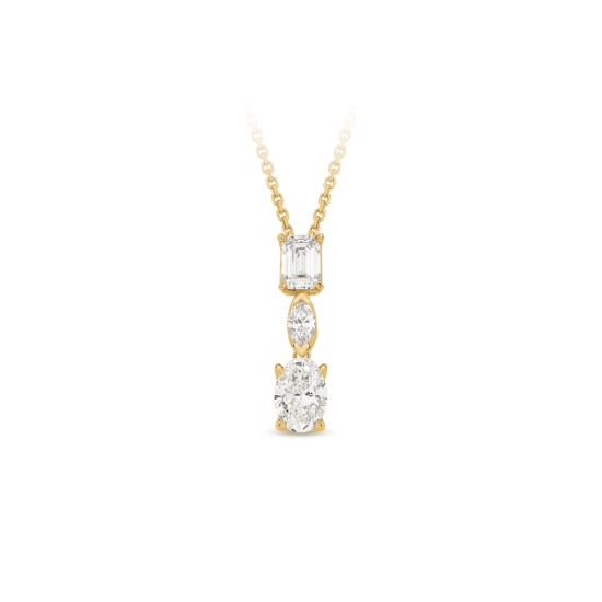 Elegance flows effortlessly in this exquisite three-diamond drop pendant. Featuring a harmonious blend of shapes‚ a striking emerald cut, a graceful marquise cut, and a luminous oval cutinitic piece captures the beauty of contrast and balance. Each diamond is delicately suspended in our open U setting, allowing light to pass through for maximum brilliance.