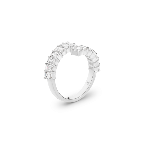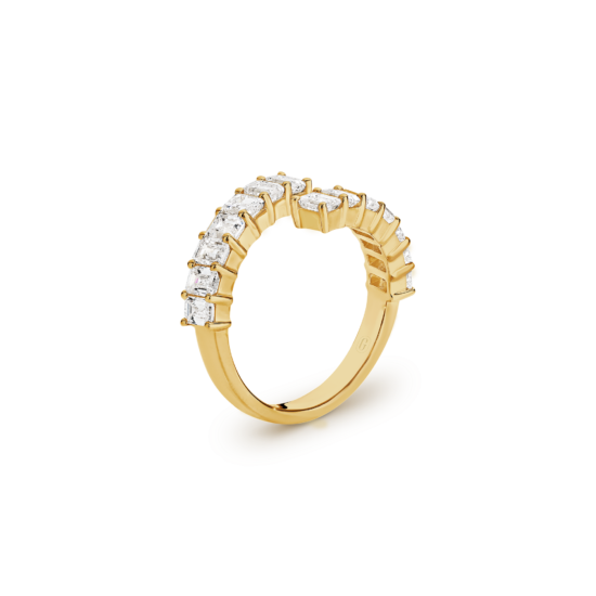 The traditional wedding band has been modernised by a swirl of emerald-cut diamonds that wrap around the finger beautifully! A wonderful option if you enjoy wearing your wedding band on its own, as well as paired with your engagement ring.