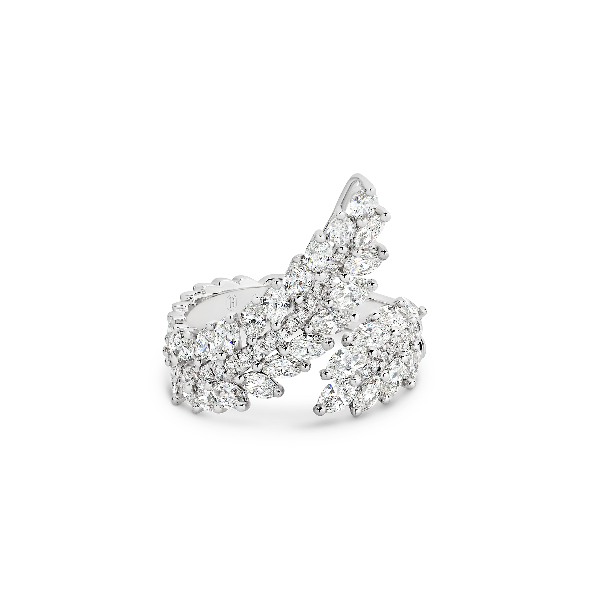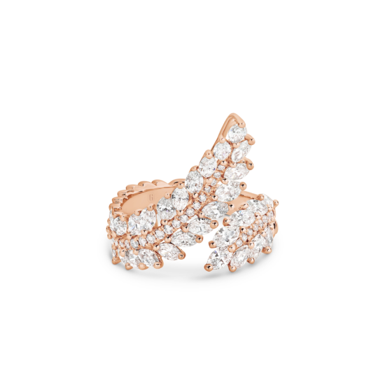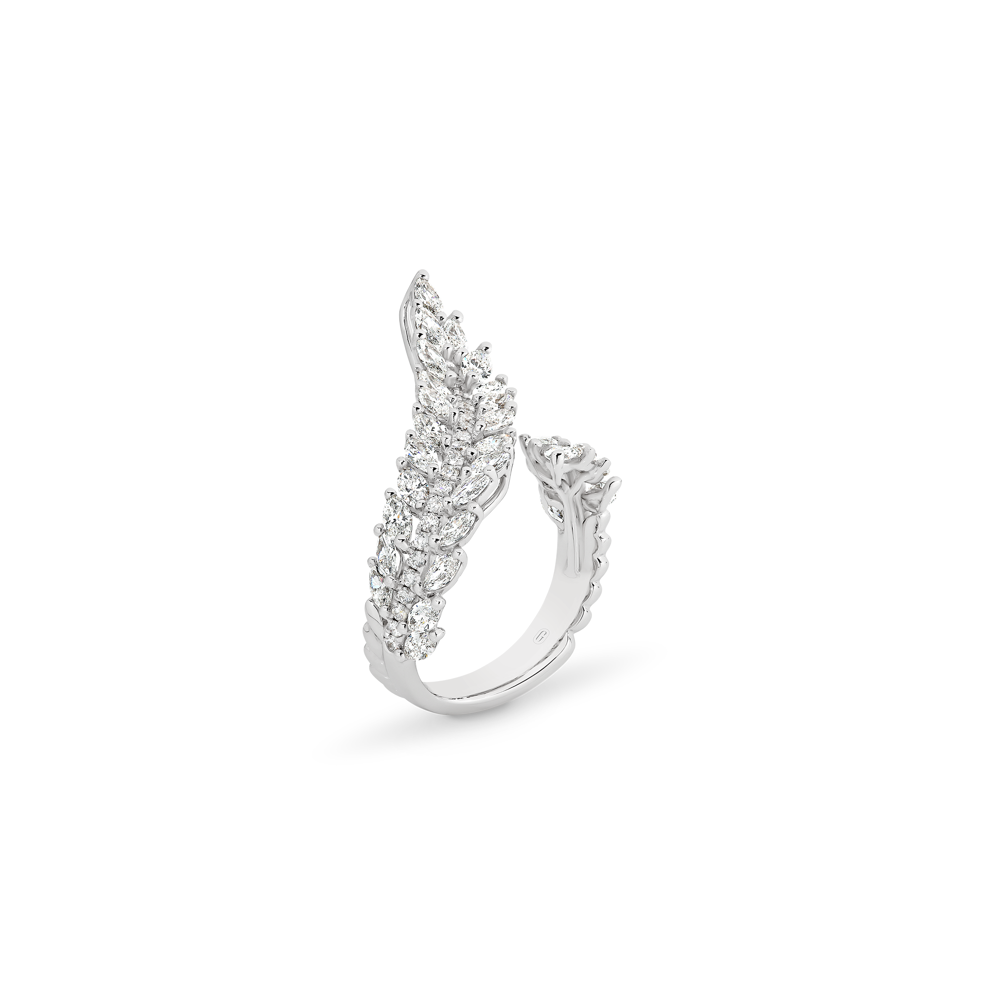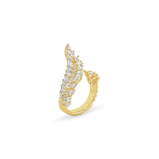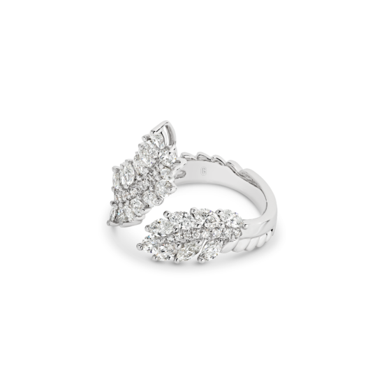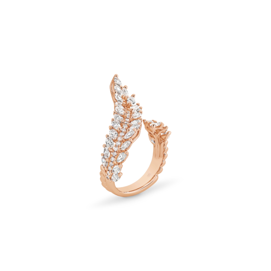 Inspired by angel’s wings, this design is truly divine. A work of art composed of an impressive 2.25 carats of fancy-cut marquise and brilliant round cut diamonds that catch the light in a blinding display of brilliance. A real showstopper for those who want to make a statement!