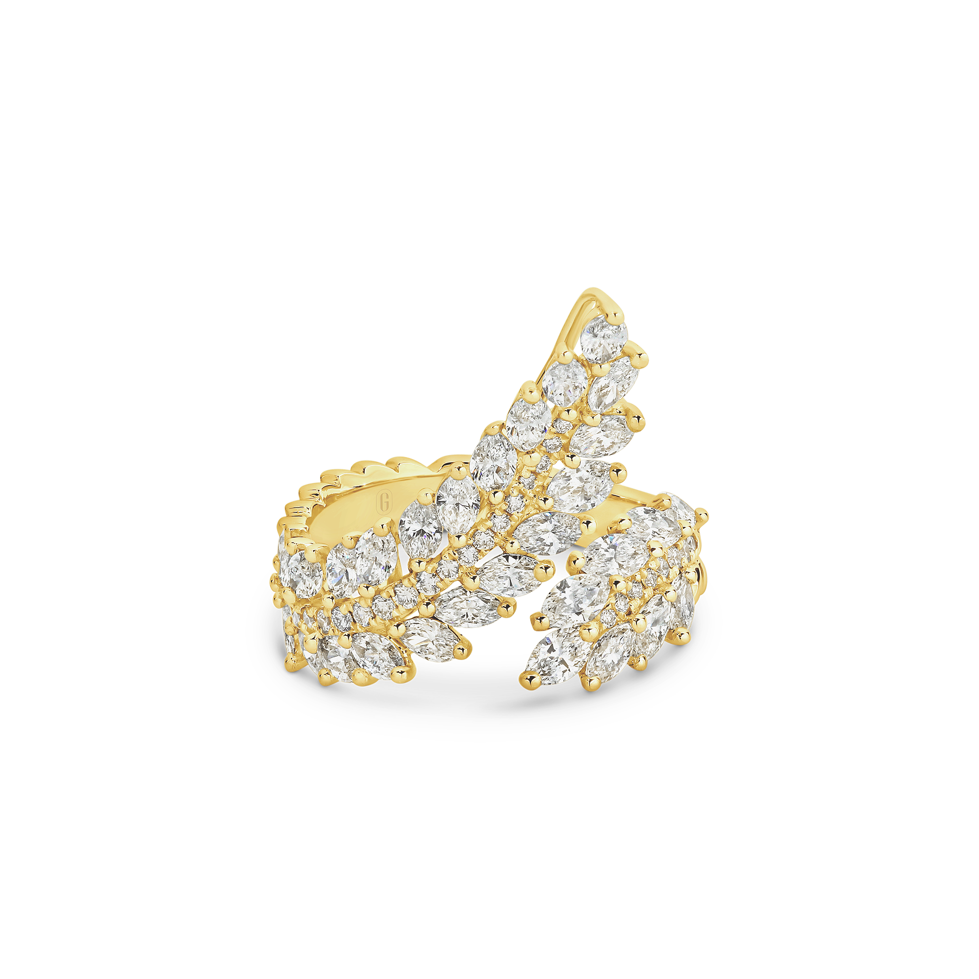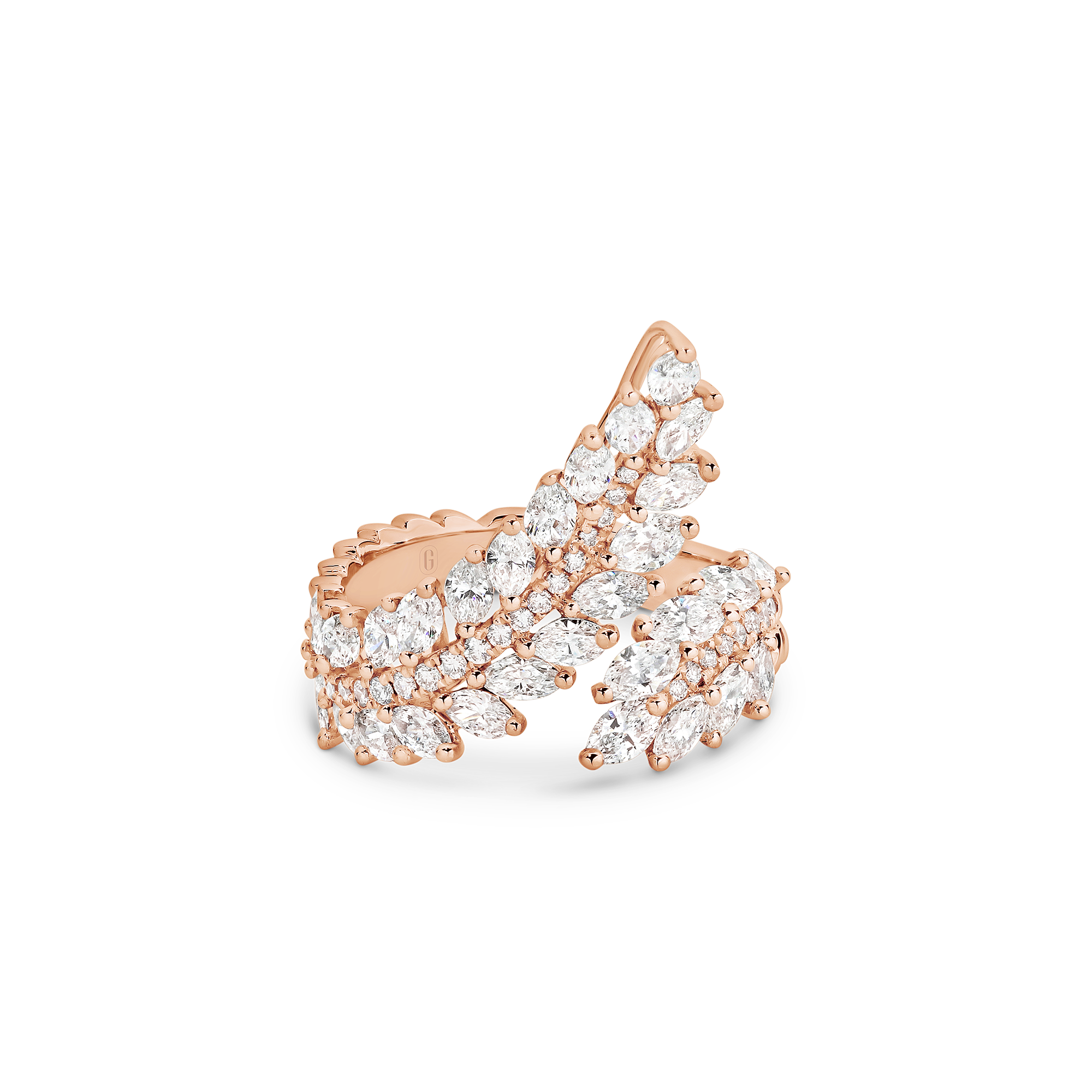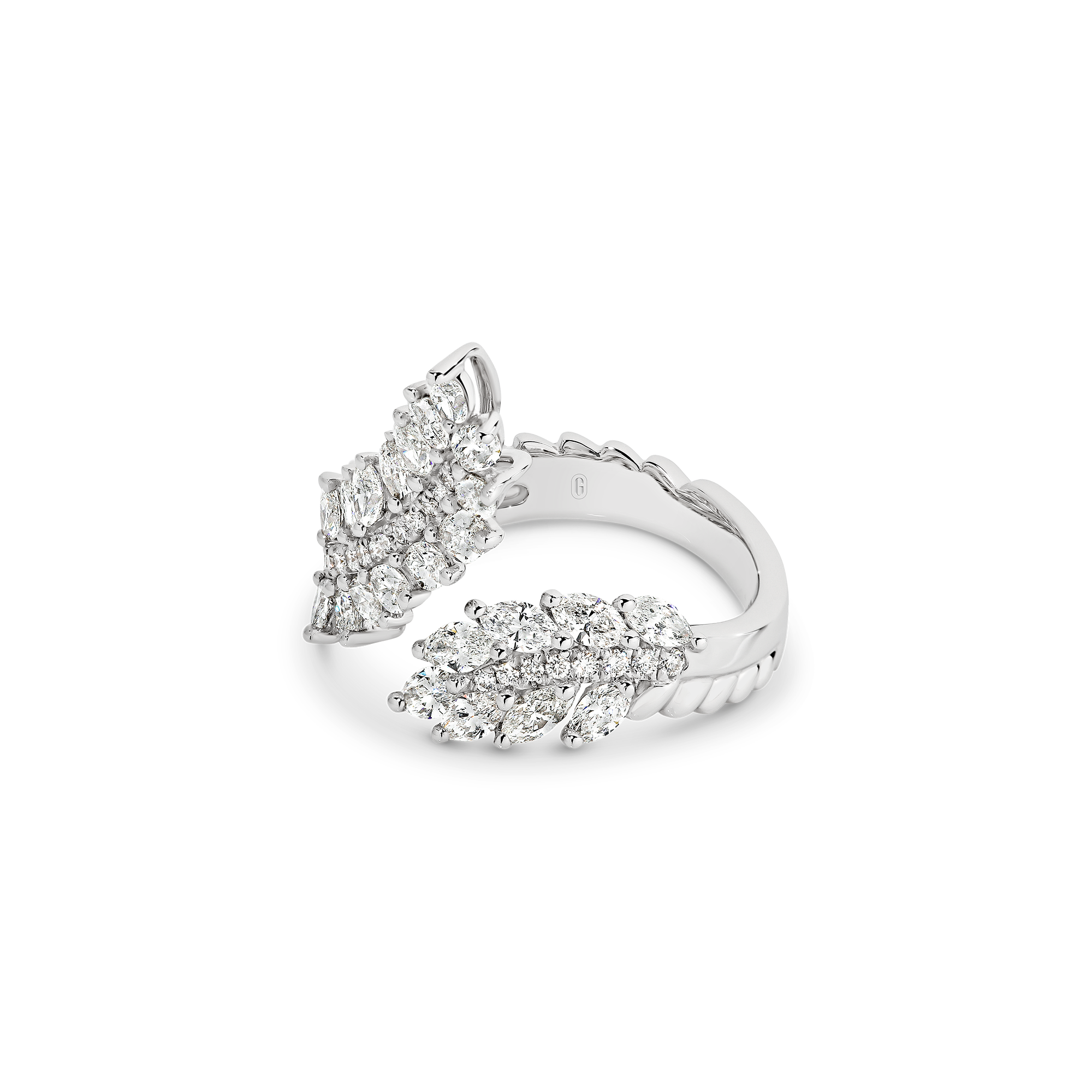 Inspired by angel’s wings, this design is truly divine. A work of art composed of an impressive 2.25 carats of fancy-cut marquise and brilliant round cut diamonds that catch the light in a blinding display of brilliance. A real showstopper for those who want to make a statement!